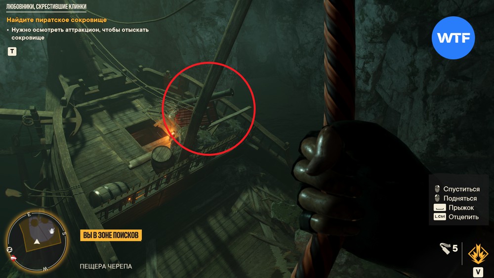 Используйте крюк-кошку, чтобы зацепиться за мачту и добраться до палубы. Там стоит пушка, из которой вам нужно выстрелить, чтобы расчистить проход. Снова зацепитесь за мачту и переберитесь к выходу из пещеры. В итоге вы доберетесь до ящика с оружием.