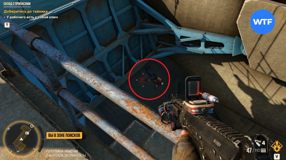 Идите к дамбе и увидите тело рабочего. Используйте крюк-кошку, чтобы аккуратно спуститься вниз и забрать ключ. Теперь вы сможете вернуться к дому с запиской и отпереть тайник.