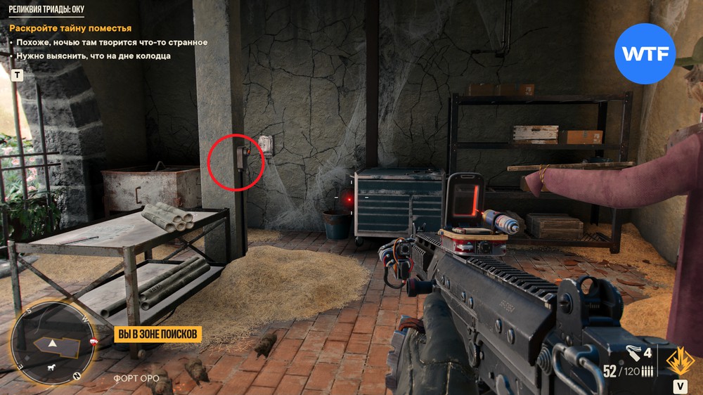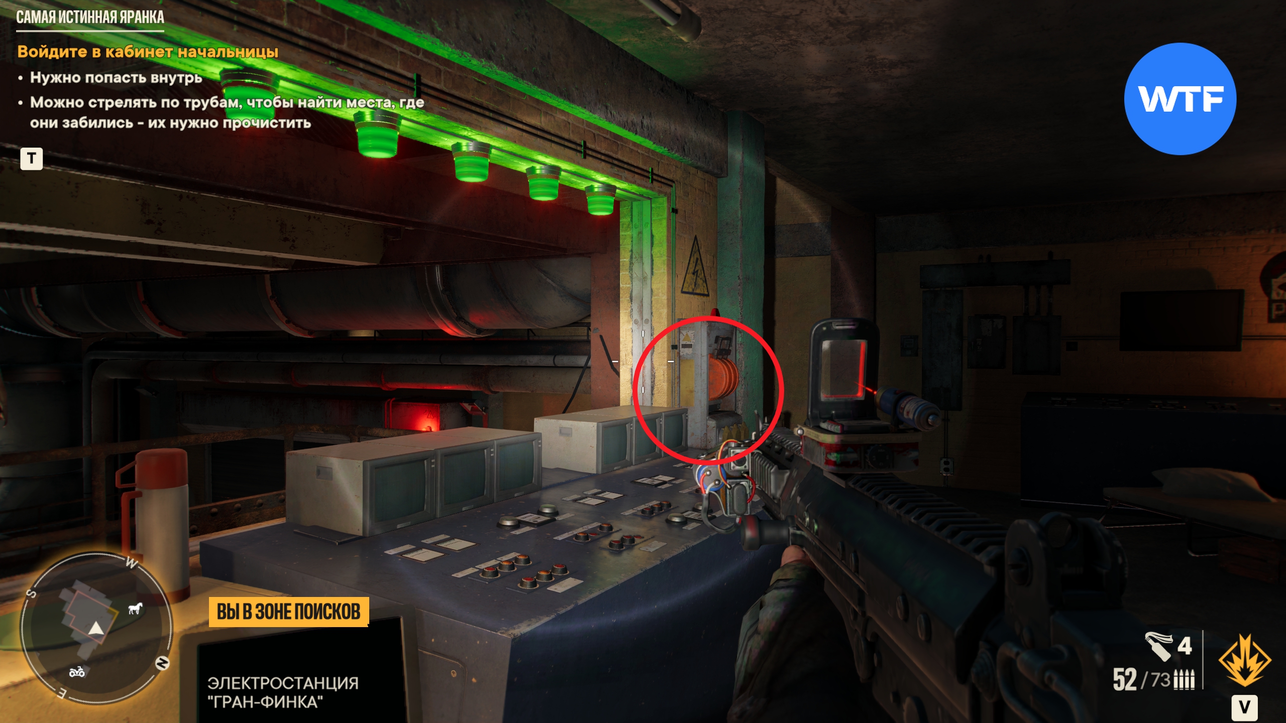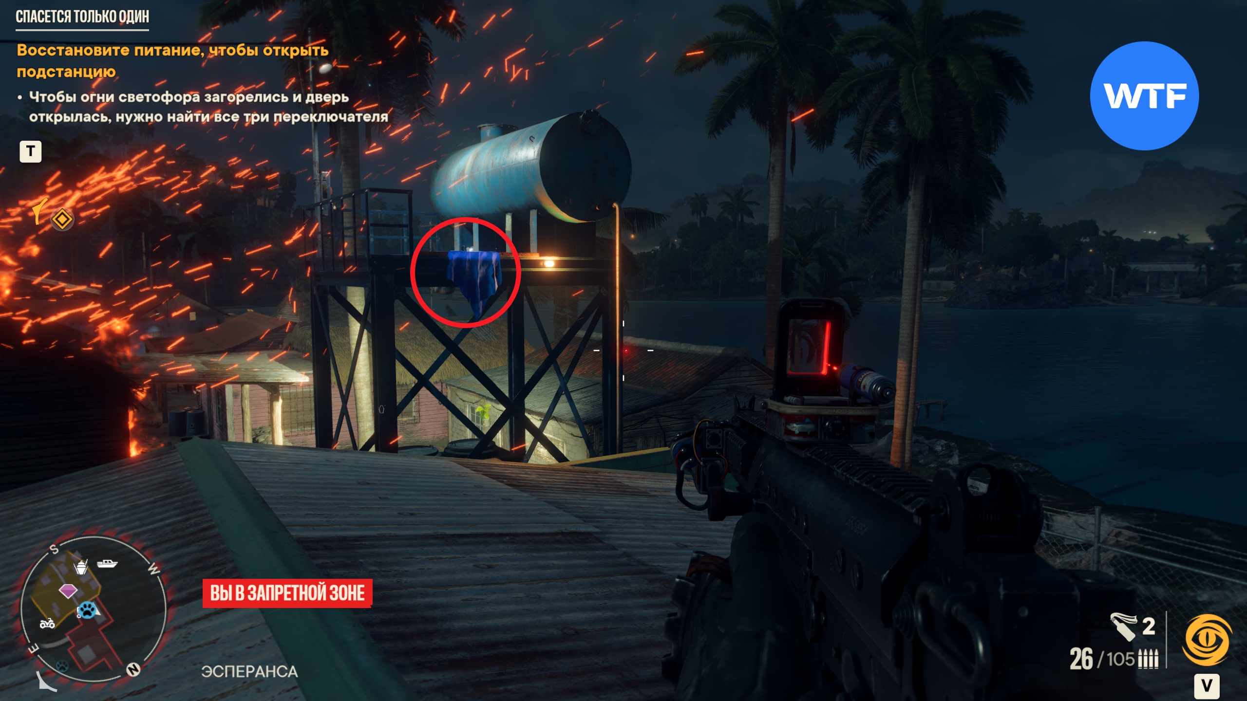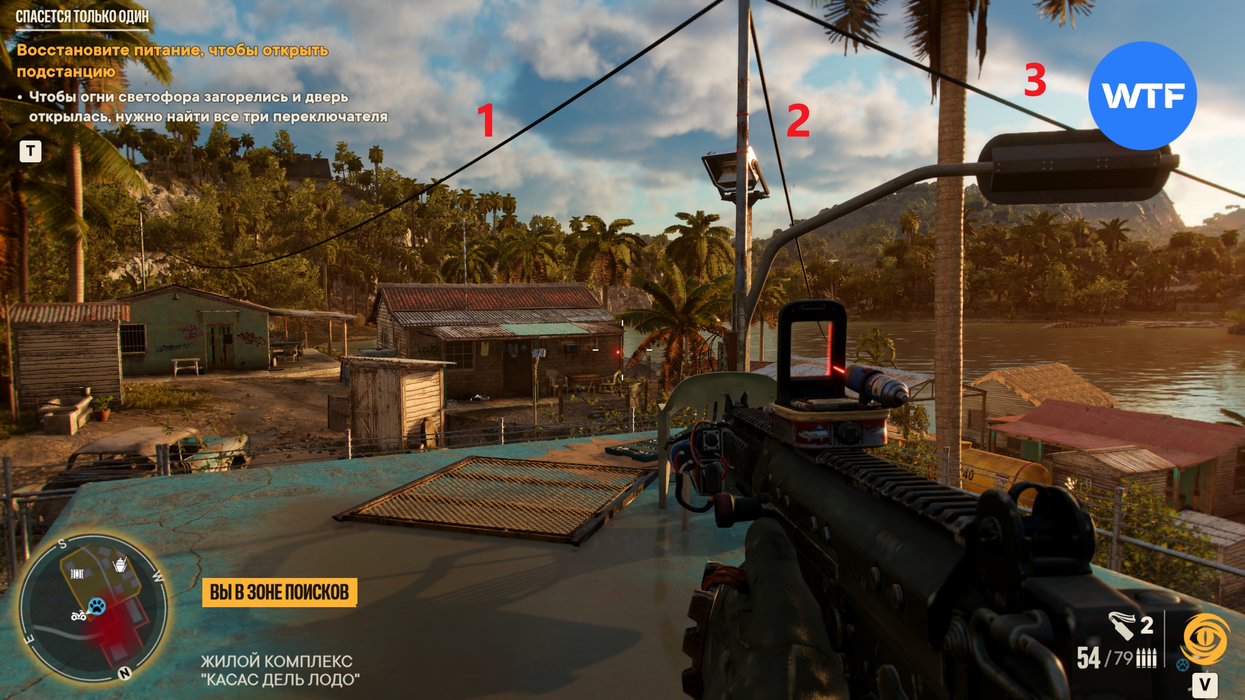 Вам нужно найти три переключателя. Если залезть на крышу дома с тайником, увидите три кабеля, они указывают куда идти (см. скриншот 3).