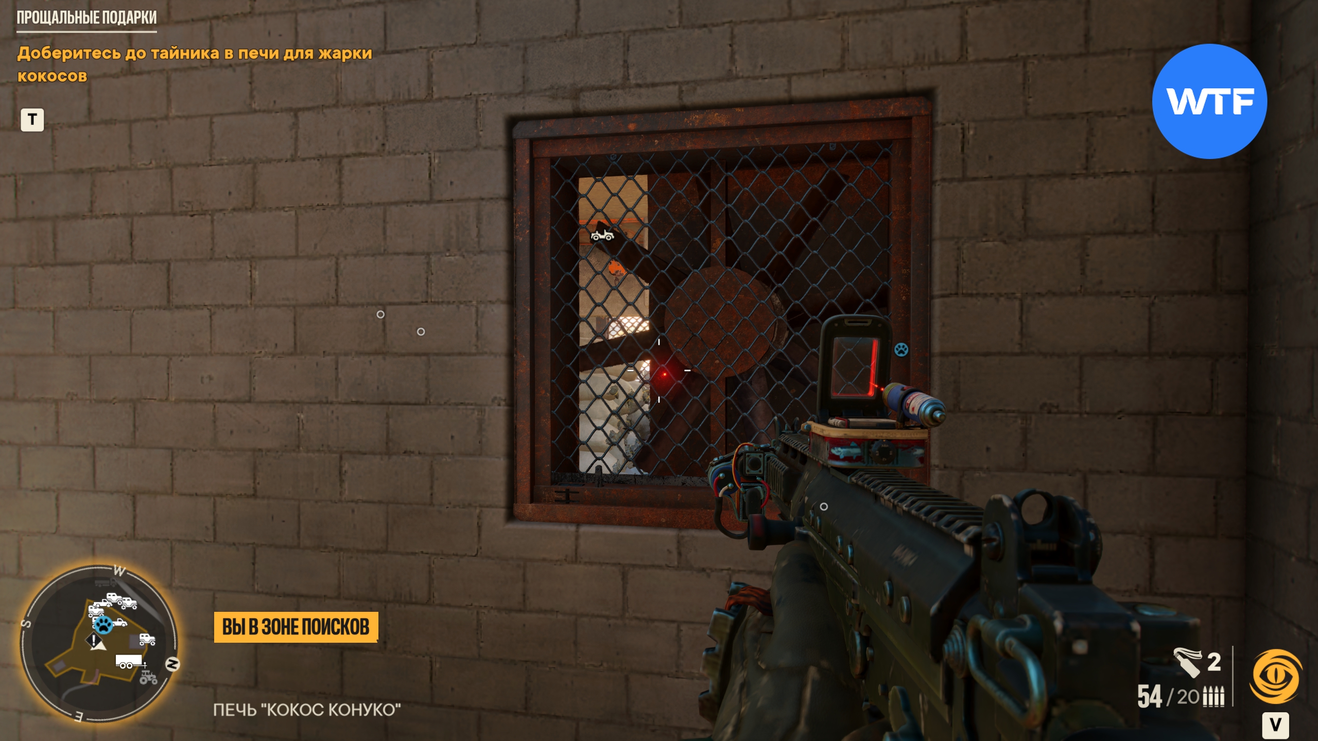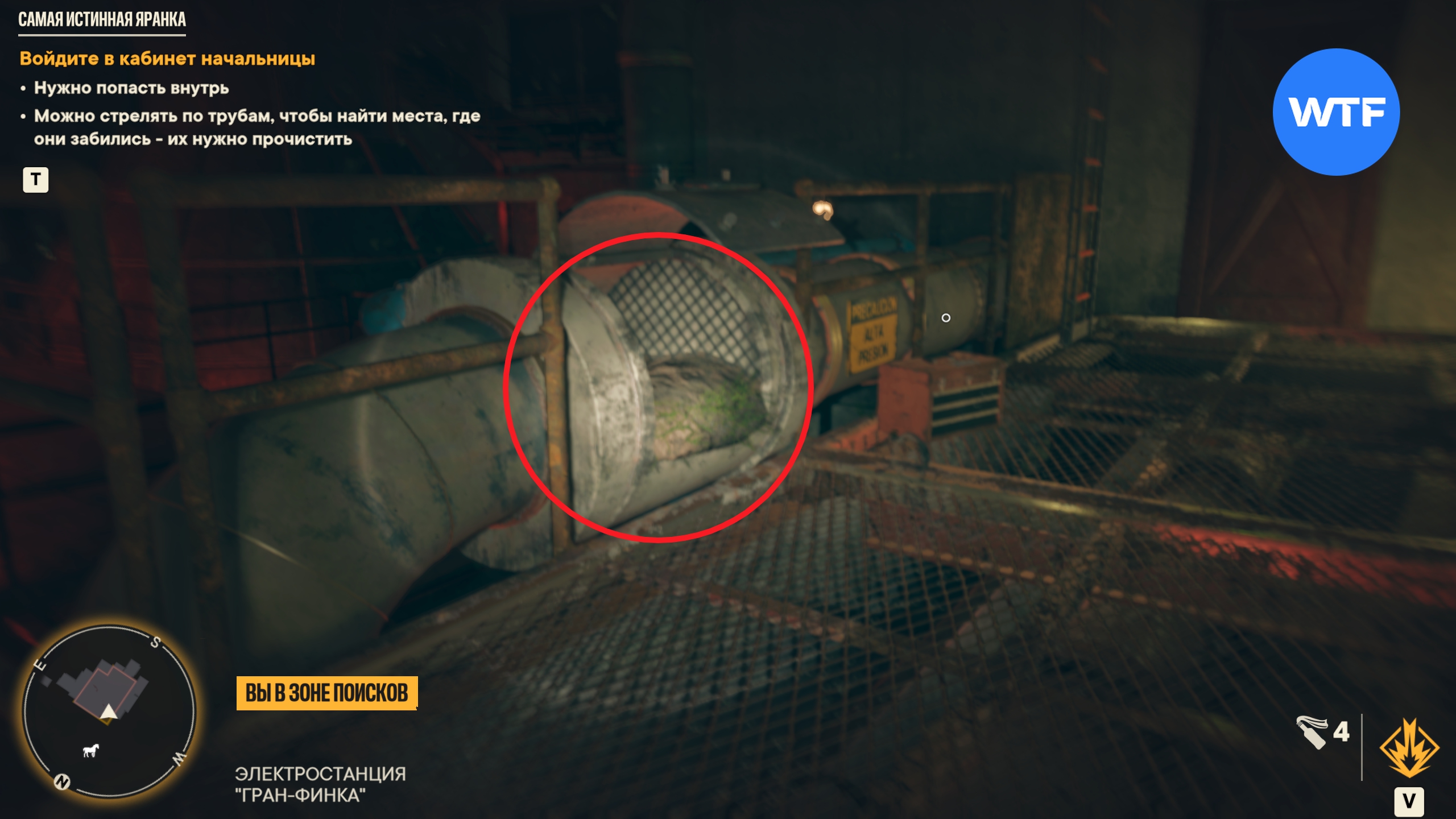 Поверните вентиль возле цистерны с водой, чтобы потушить огонь в печи. Теперь зайдите в печь и выстрелите в замок на люке через вентилятор (см. скриншот 3). Теперь вы можете спрыгнуть в разблокированный люк и забрать ключ от помещения с тайником.