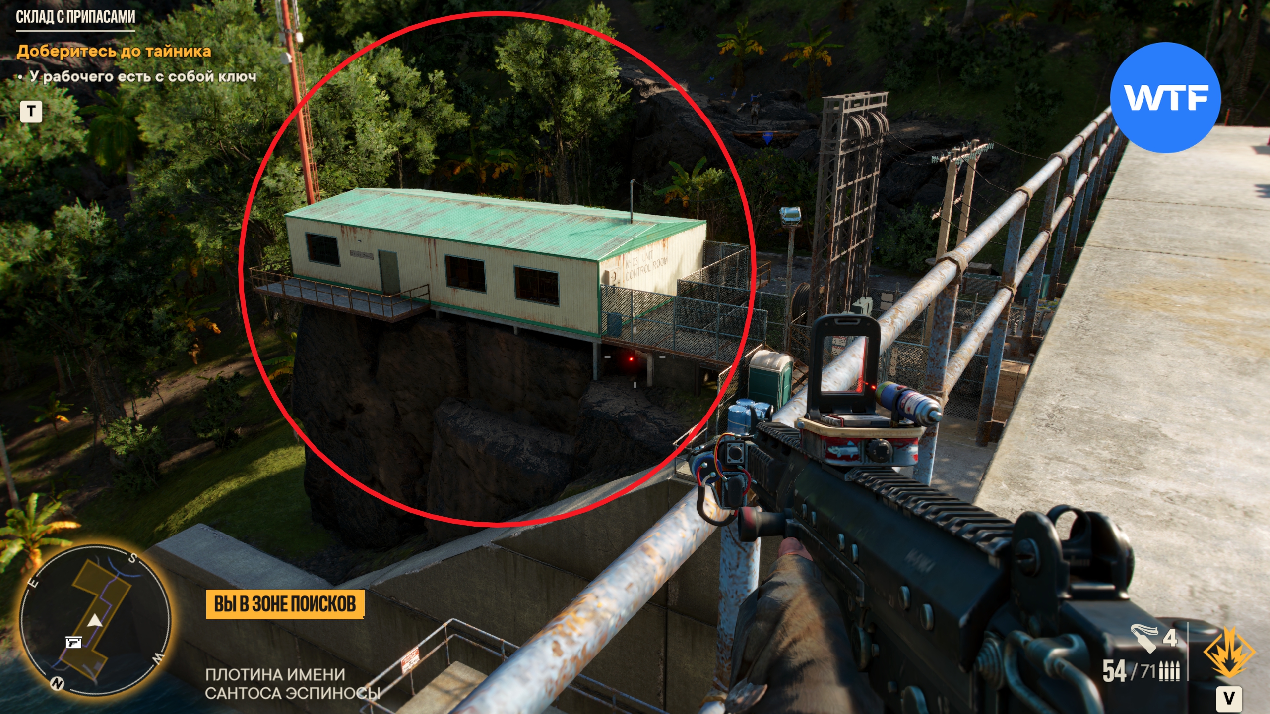 Прежде чем идти во второй дом с ядовитым газом, нужно перекрыть вентиль со скриншота 2. Последний переключатель ждет вас на вышке. Залезть туда можно с зеленого забора рядом (см. скриншот 3). После этого доступ к тайнику будет открыт.