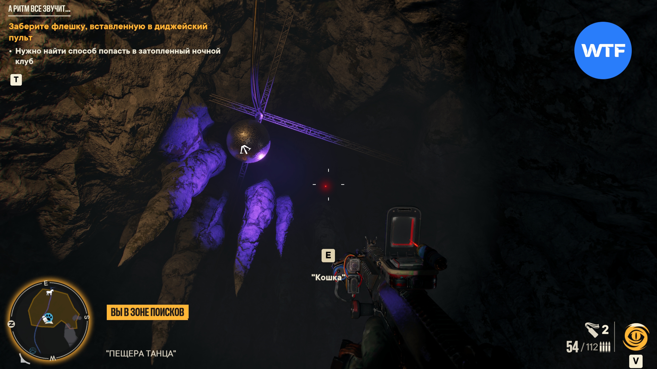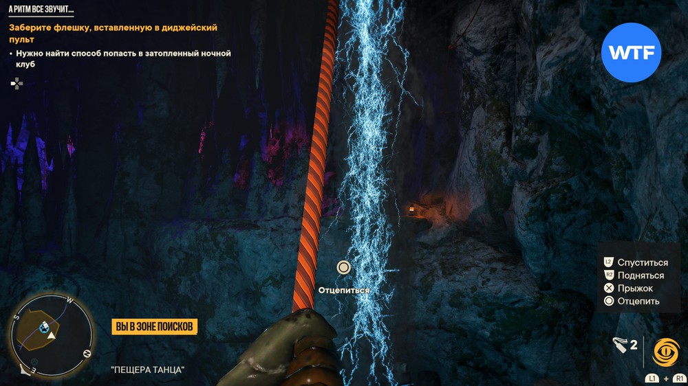 Первым делом вам нужно включить в клубе электричество. Для этого используйте крюк-кошку на фиолетовом дискотечном шаре со скриншота 3 и поднимитесь на платформу с выключателем.