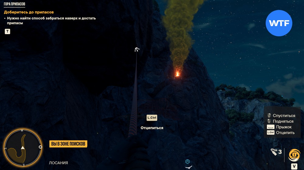 Выход из пещеры вам преградят лозы - стреляйте, чтобы убрать их. Идите вперед пока не увидите желтый дым. Переберитесь на следующую площадку при помощи крюка-кошки, а затем киньте молотов в рыболовную сеть, удерживающую камни. Это откроет вам путь к припасам.