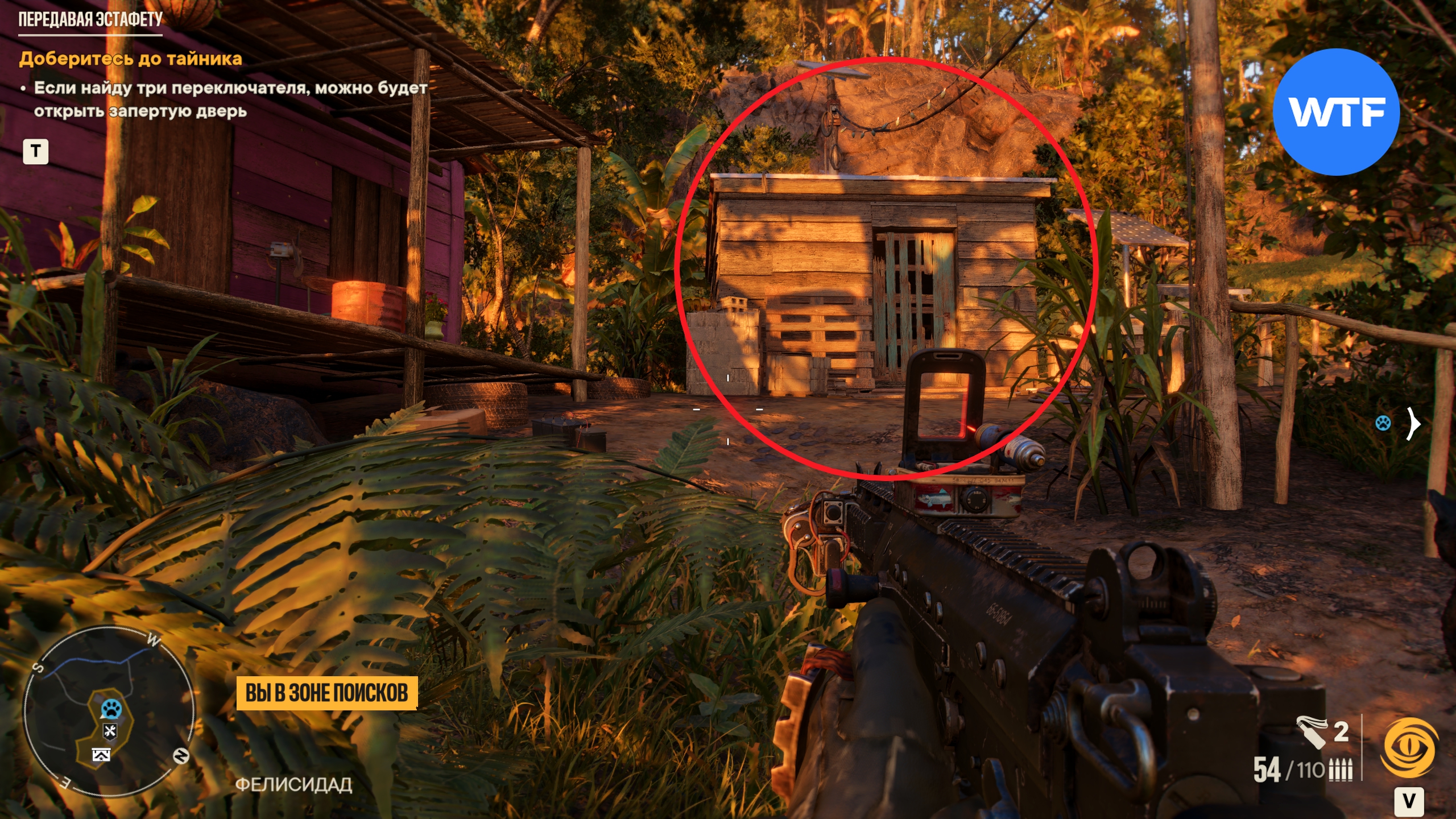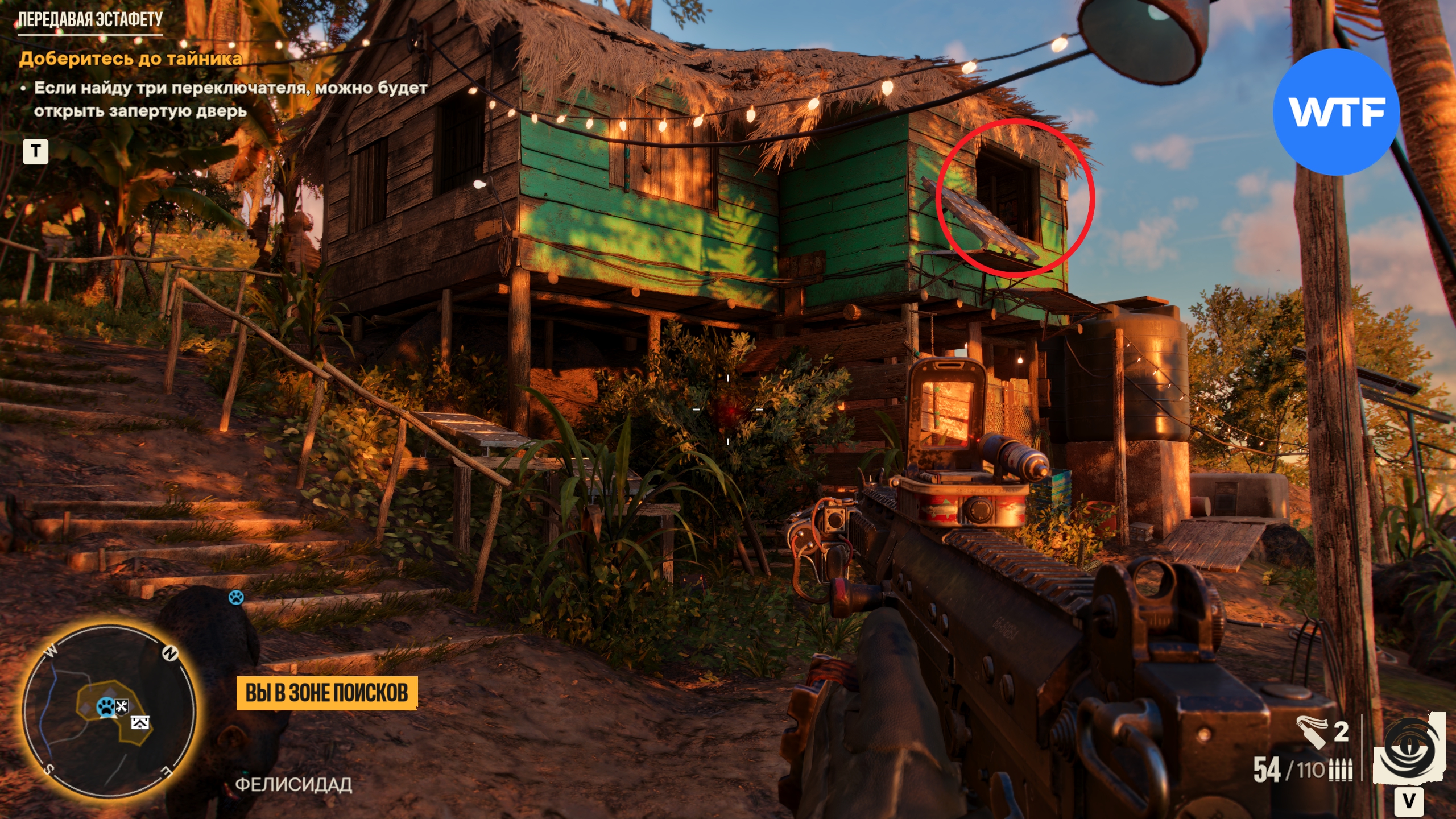 После этого вы можете вернуться к дому с тайником и нажать на кнопку под навесом напротив, чтобы разблокировать дверь.