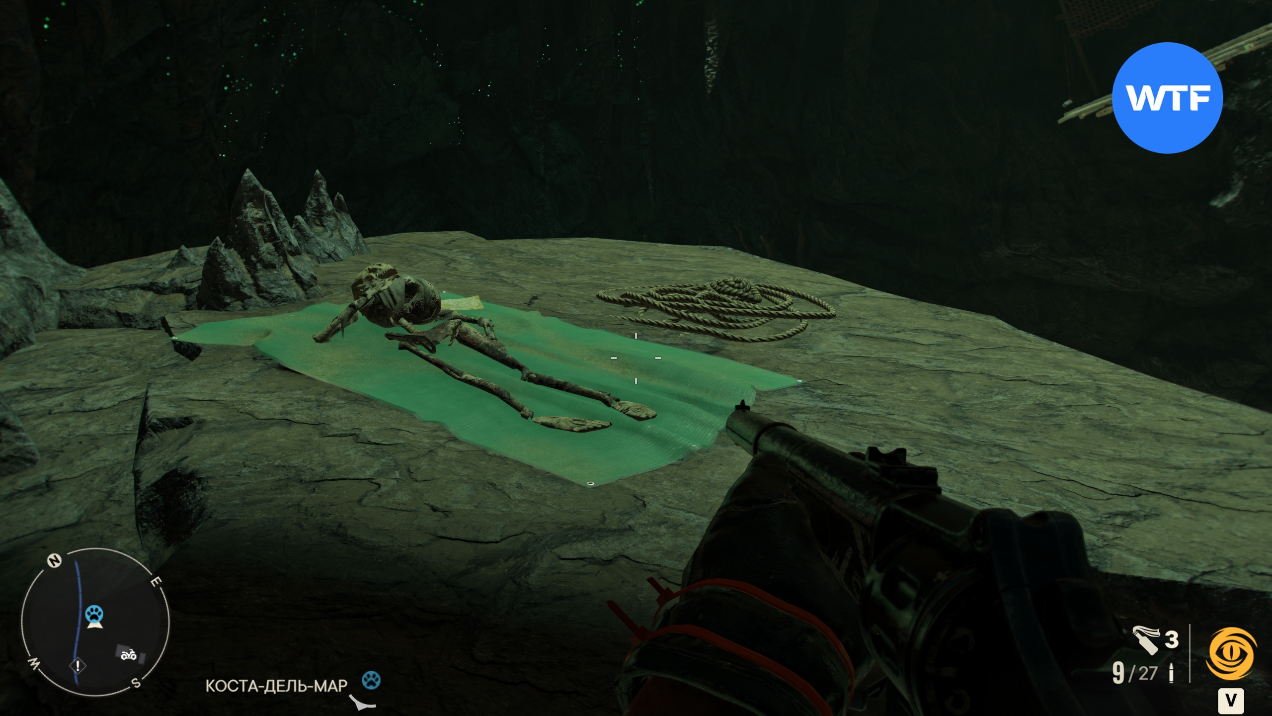 Прочитав записку о тайнике, отправляйтесь к следующей метке задания, которая появится на вашей карте. В пещере Оминоса вам нужно найти труп с изумрудным черепом.