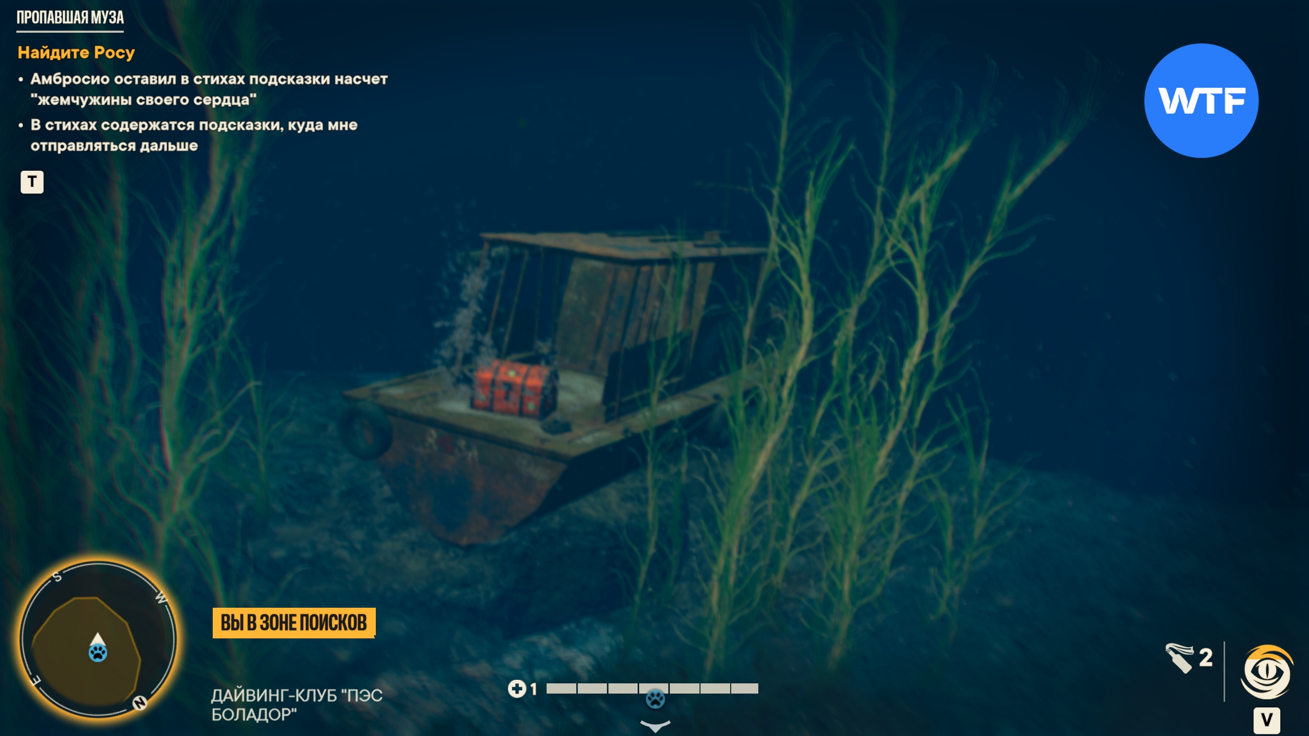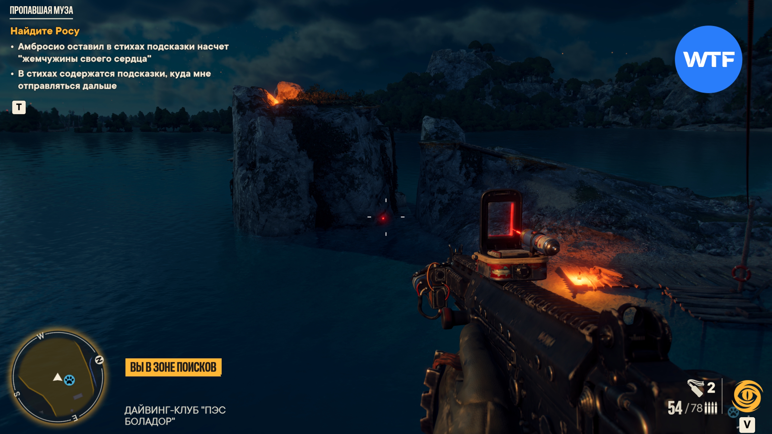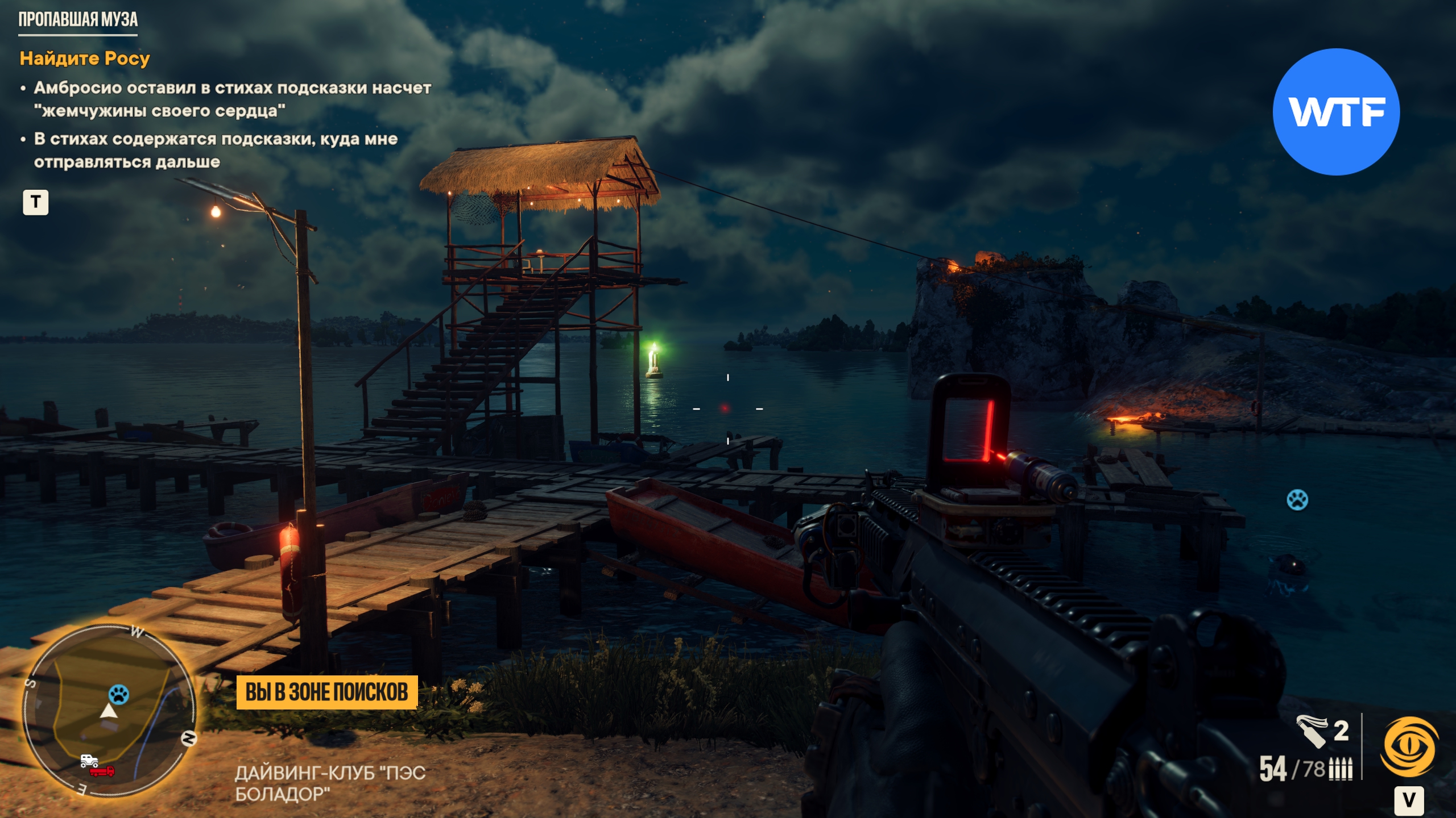 Идите на вышку у воды, чтобы прочитать следующую записку с подсказкой. Оттуда съезжайте по тросу и поднимайтесь на утес (см. скриншот 2). У фонаря будет еще одна подсказка, сообщающая, что нужно нырять.
