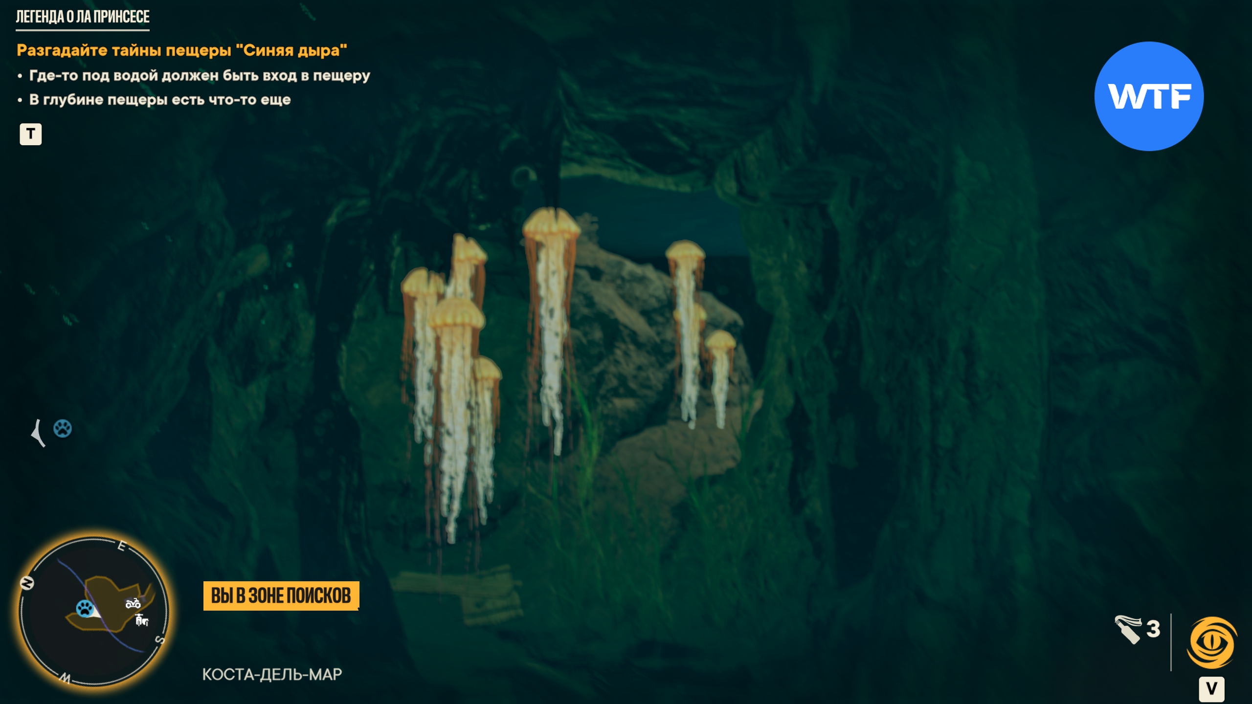 Сломайте доски, ведущие в пещеру и двигайтесь по линейному пути пока не спрыгните в воду возле затопленного пиратского корабля.