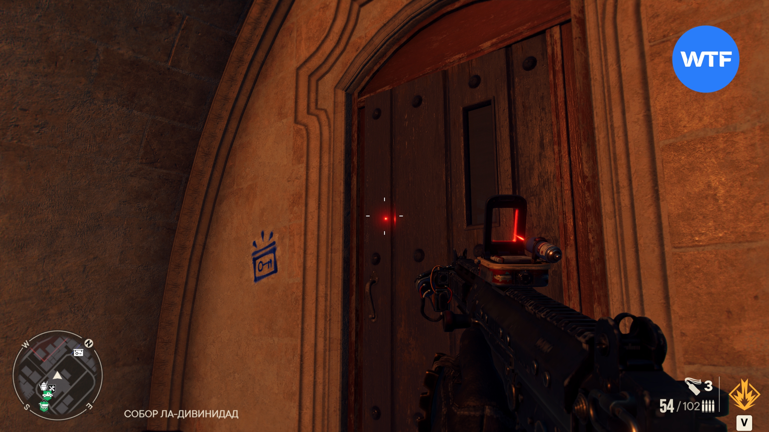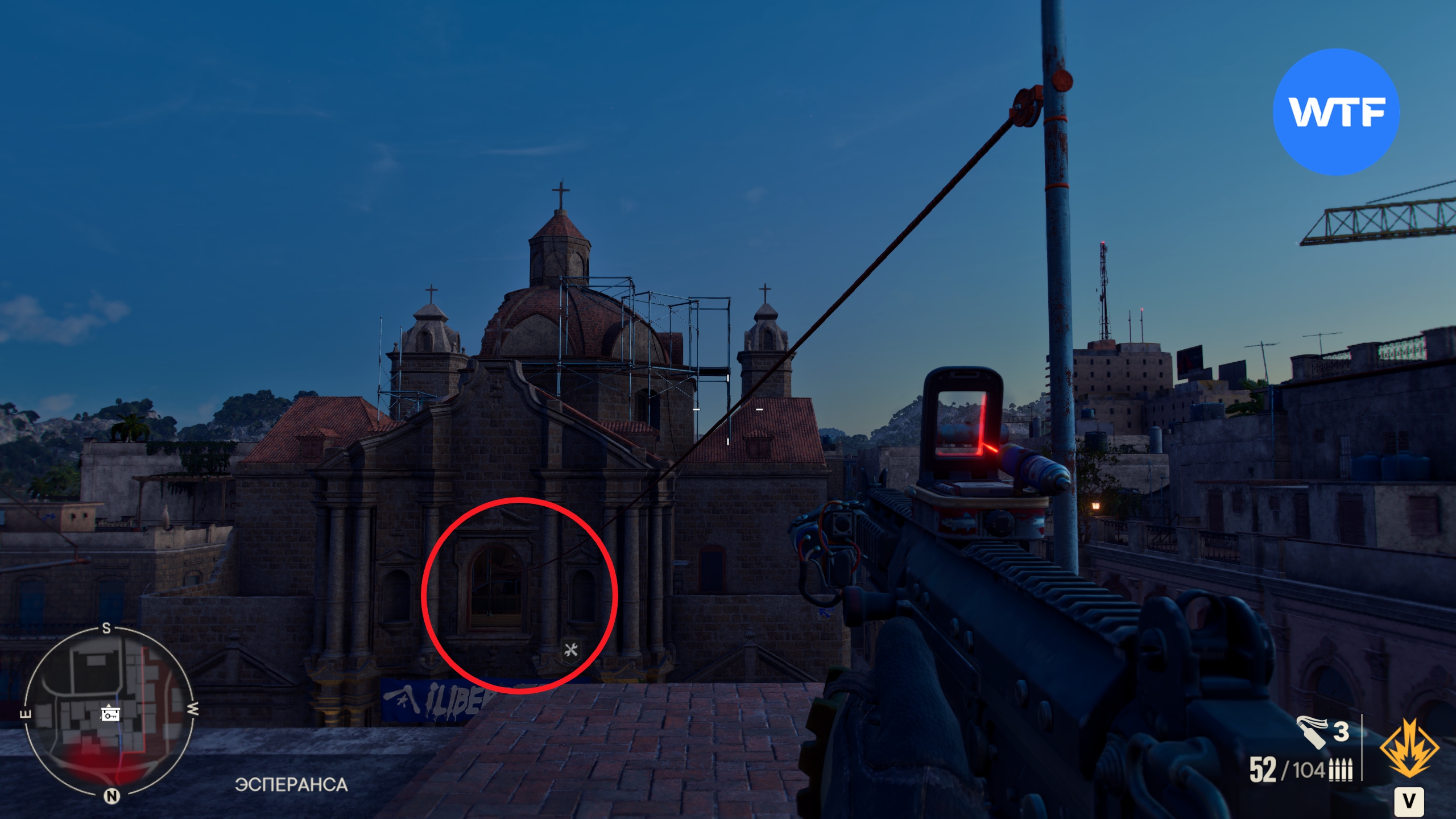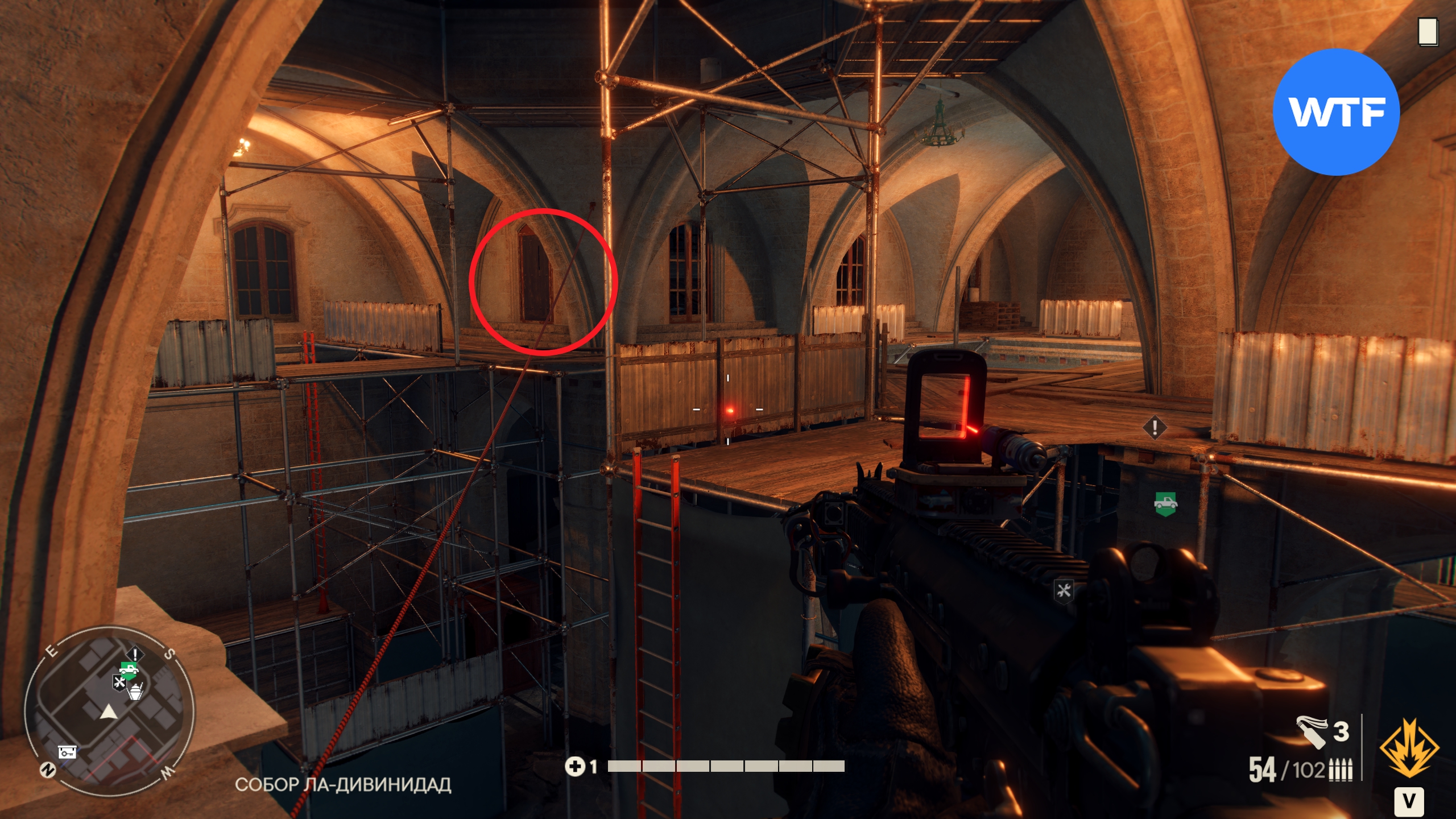 Вернитесь к двери с меткой и идите по деревянным лесам к двери по диагонали от вас (см. скриншот 3). Она ведет на балкон, откуда вы сможете перепрыгнуть на крышу соседнего здания и собрать там криптограмму #02 (la guitarra).