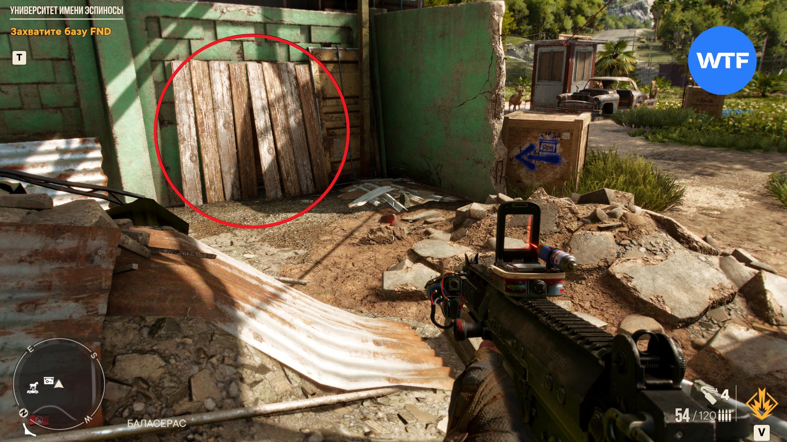 Чтобы найти криптограмму #05 (мачете), следуйте по синей стрелке на север и перепрыгните на соседнюю крышу. Спрыгните во двор, где обустроен небольшой рынок. Листок висит внутри киоска со скриншота ниже.