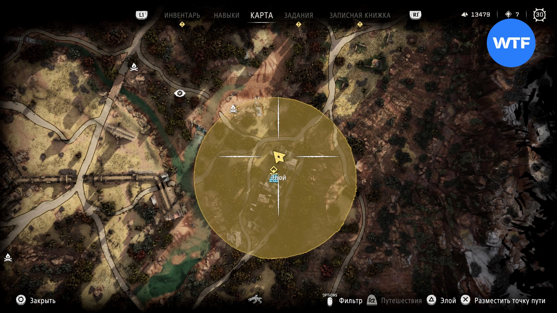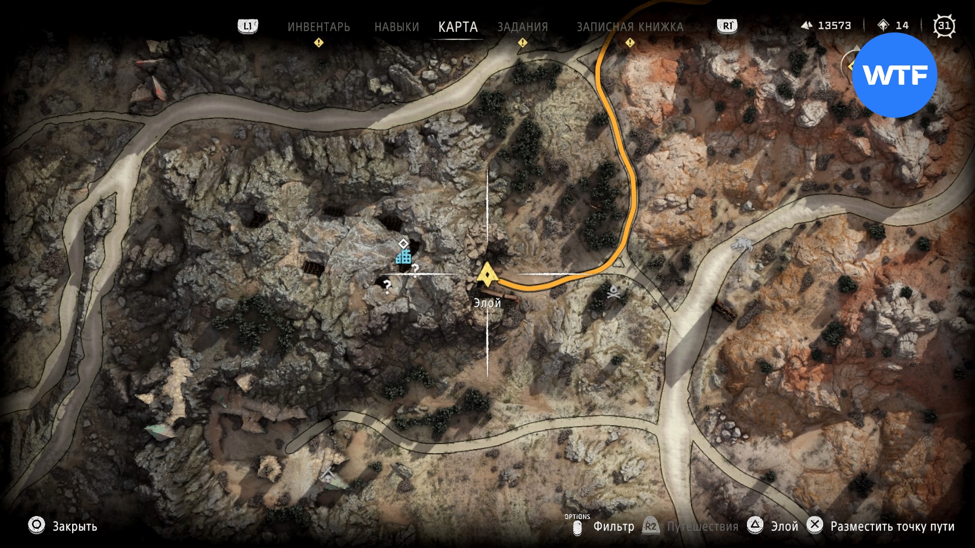 Начните поиски с северной части руин (см. метку Элой на скриншоте 2). Подтащите ящик, чтобы добраться до запертой двери. От неё по деревянному помосту можно пройти в следующую комнату. Там просканируйте записку с кодом, а затем вытащите вентиляционную решетку сверху. Чтобы в неё залезть, стащите ящик со второго этажа.