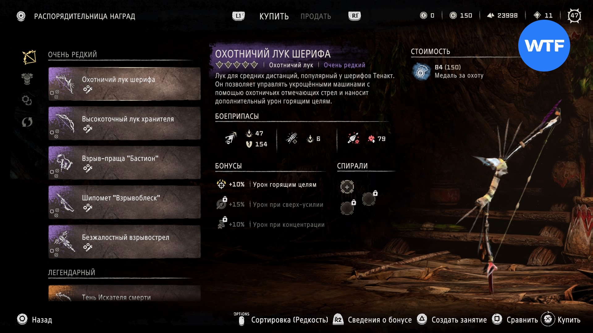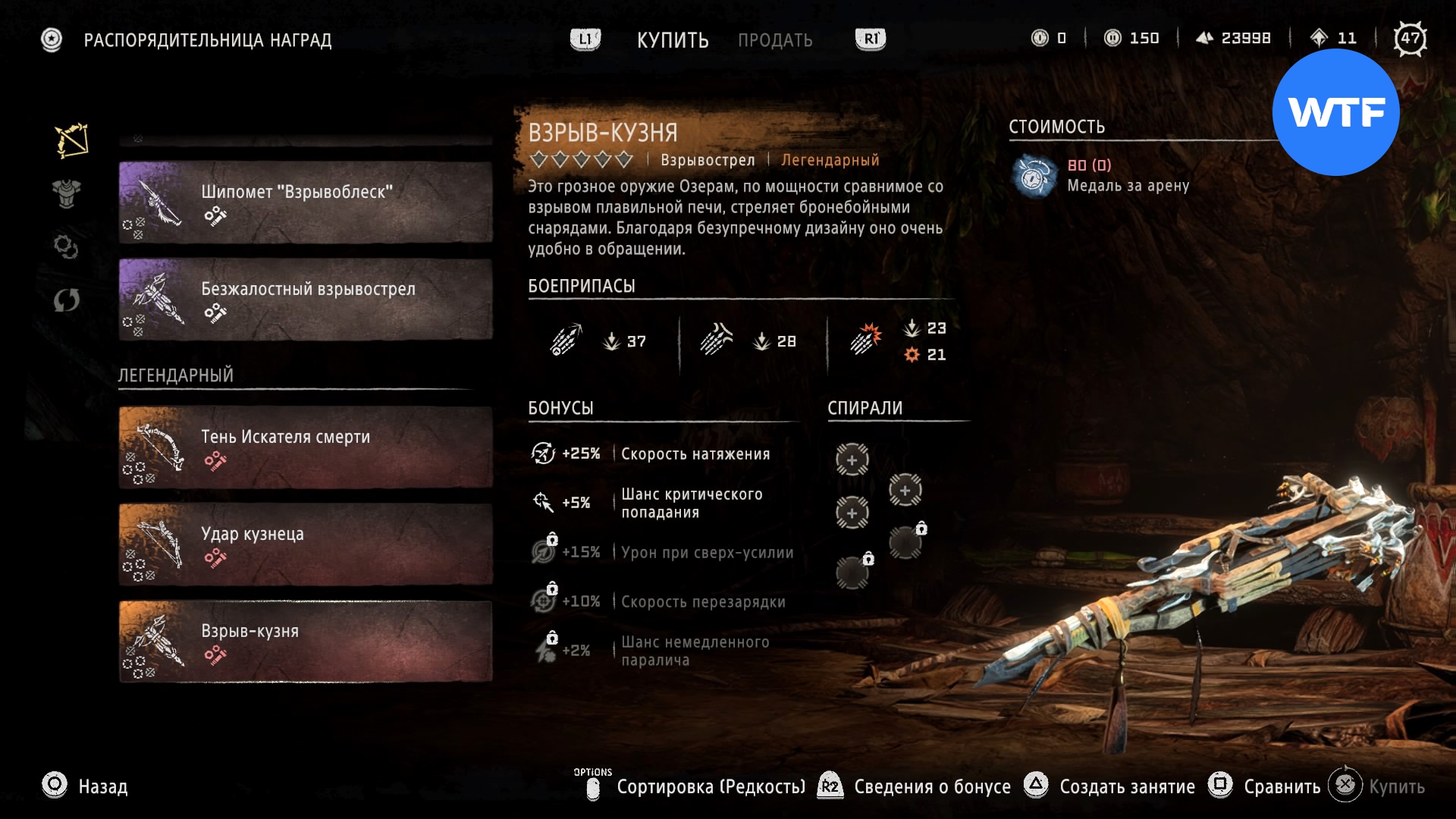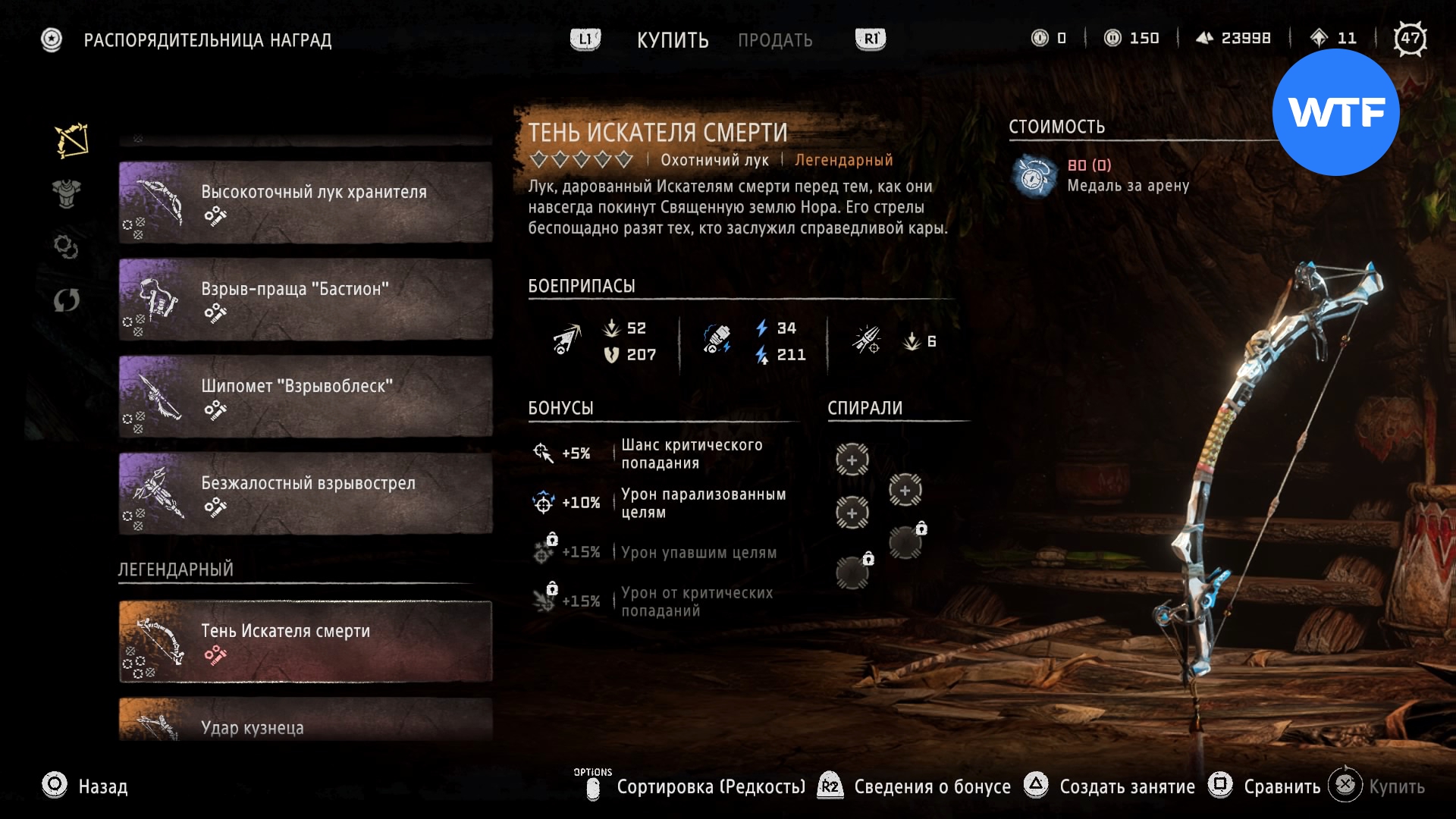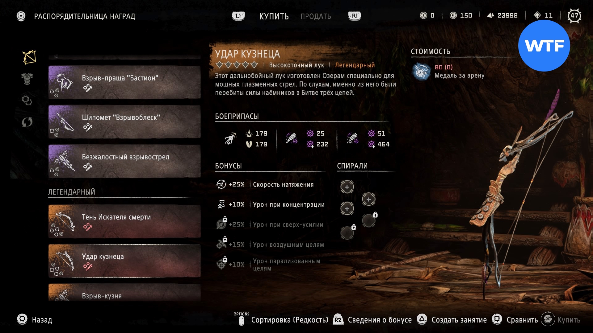 Где найти: покупается у распорядительницы наград в Устах Арены за 84 медали охоты. Чтобы разблокировать этого торговца, нужно выполнить дополнительное задание «Открытие Арены».