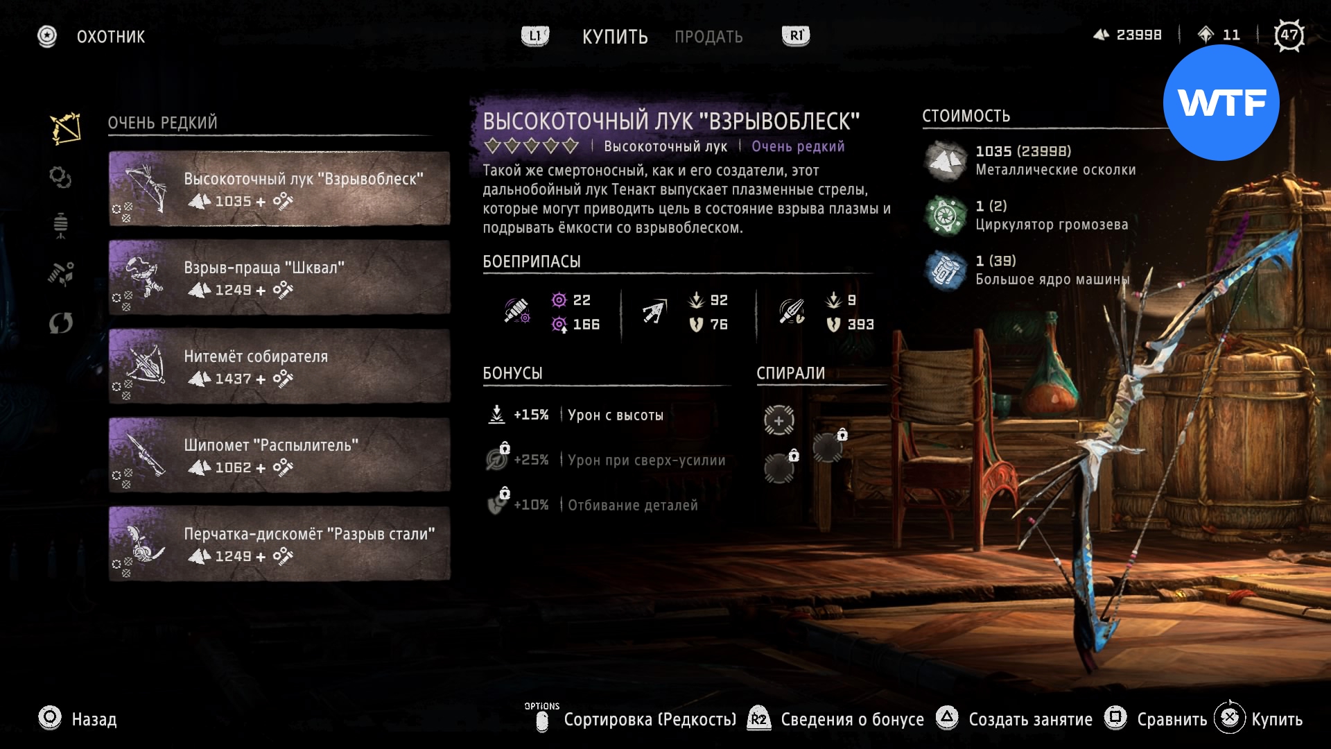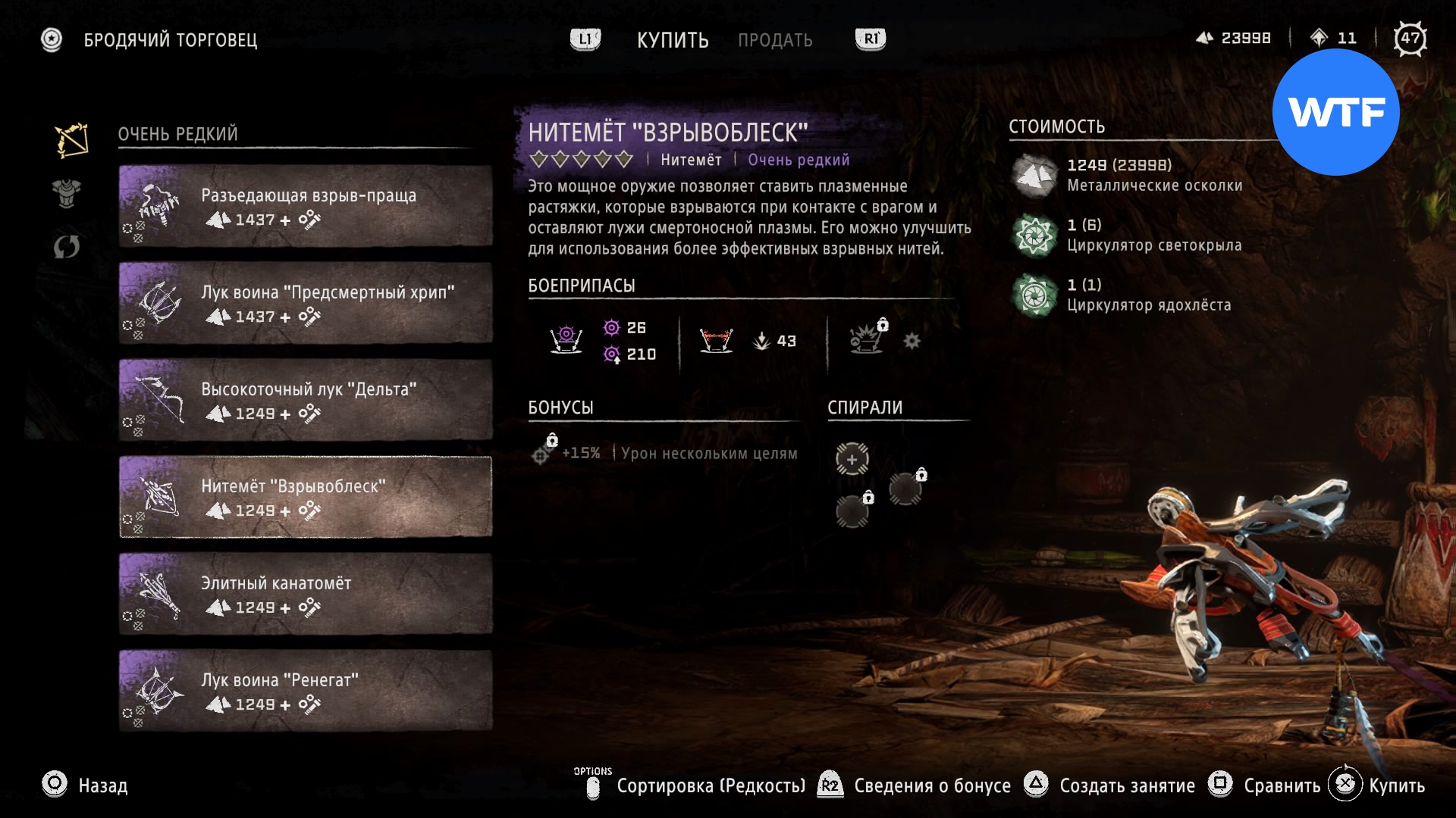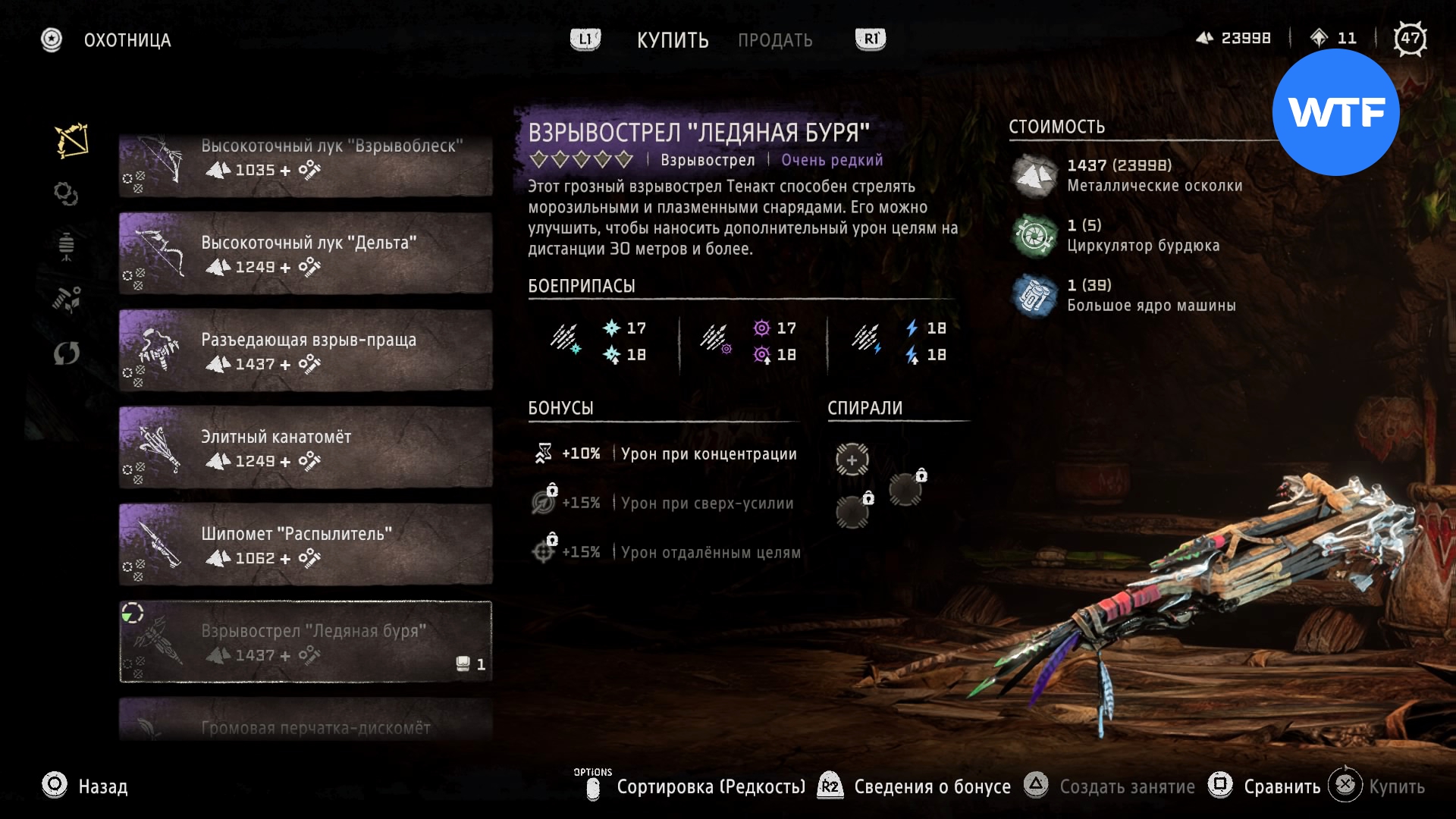 Где найти: покупается у Охотника рядом с западным входом на Базу, в Колючей топи или Палящем копье за 1437 металлических осколков, 1 циркулятор терзача и 1 большое ядро машины.