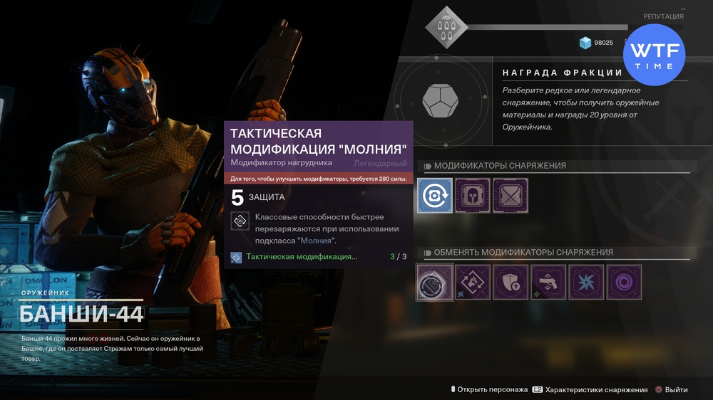 На экране подробной информации об оружии есть специальный раздел, где эти модификаторы можно применить. Имейте ввиду, они одноразовые. Если поставите, то отковырять обратно и применить на другую пушку уже не получится. Поэтому легендарные стоит приберечь для чего-то действительно крутого. После 280 уровня силы модификаторы легендарного качества можно будет получить у оружейника взамен на три таких же, но синего цвета.