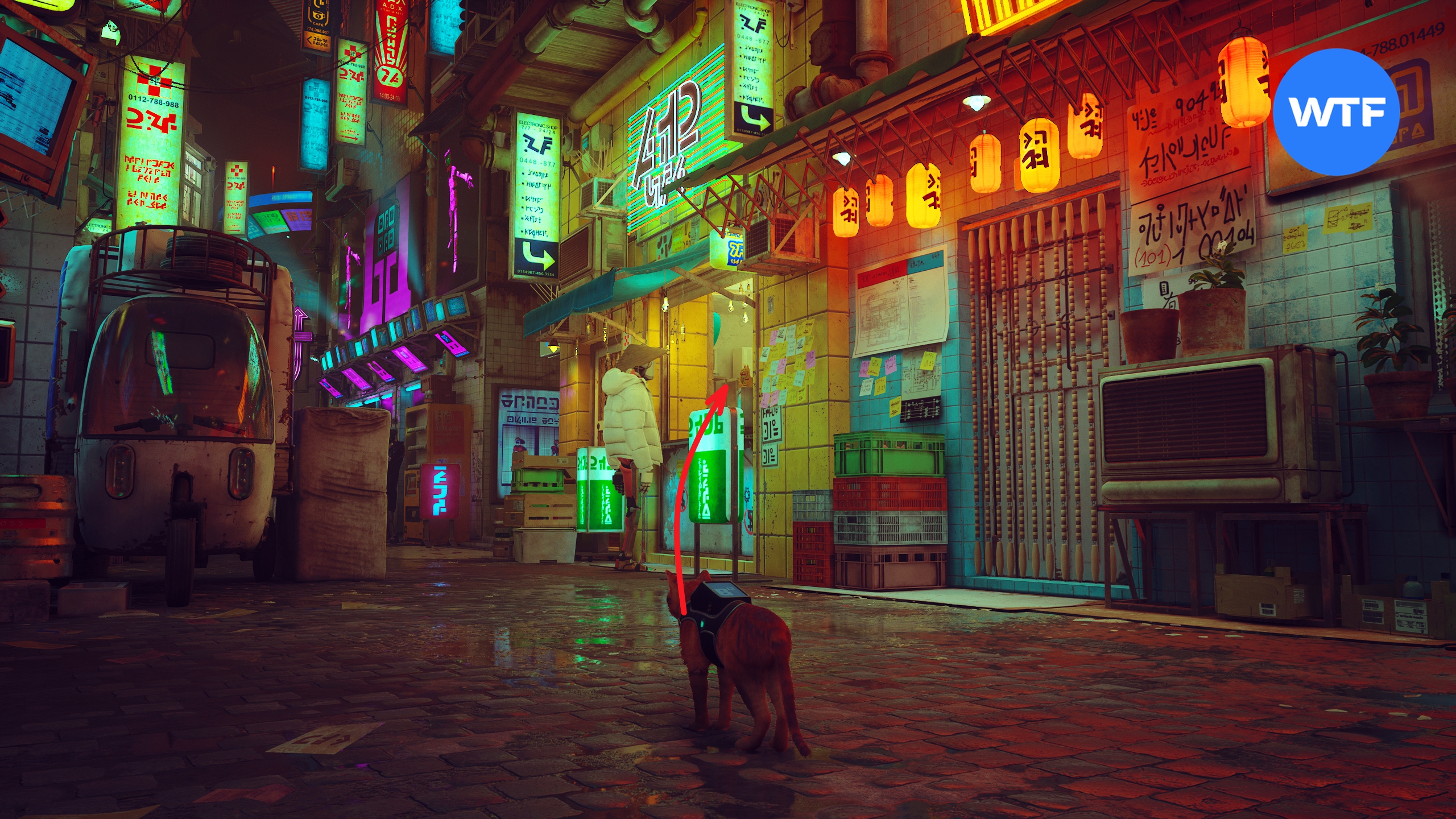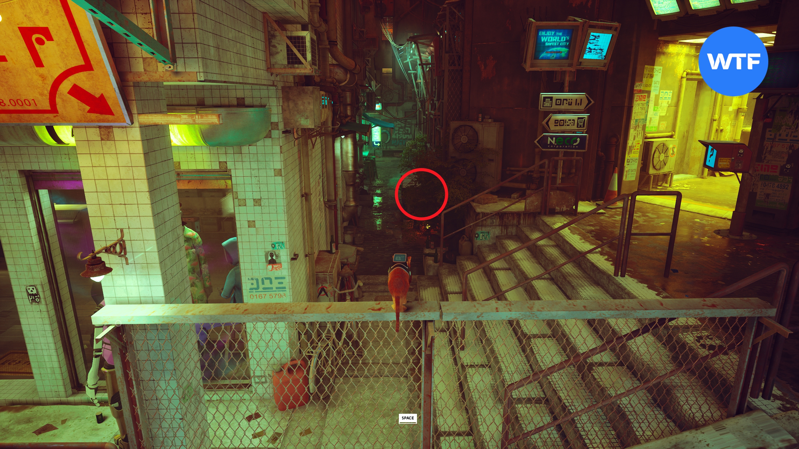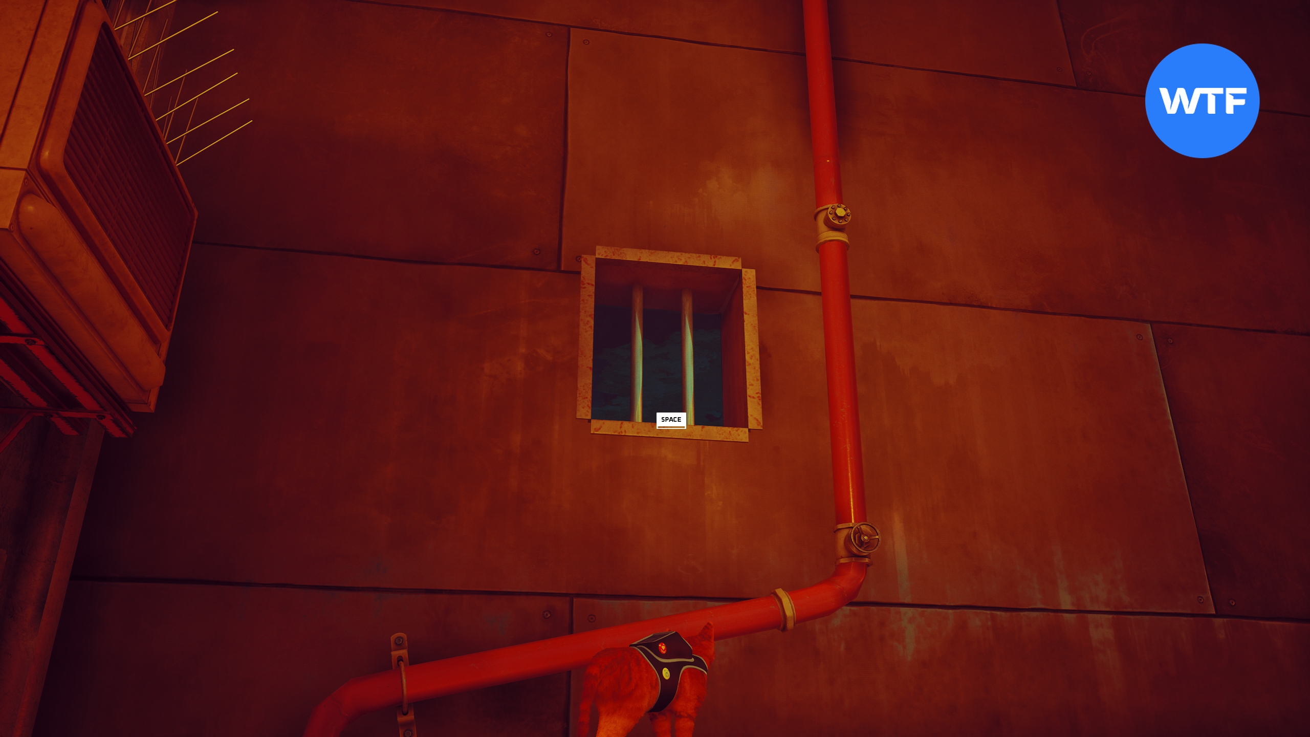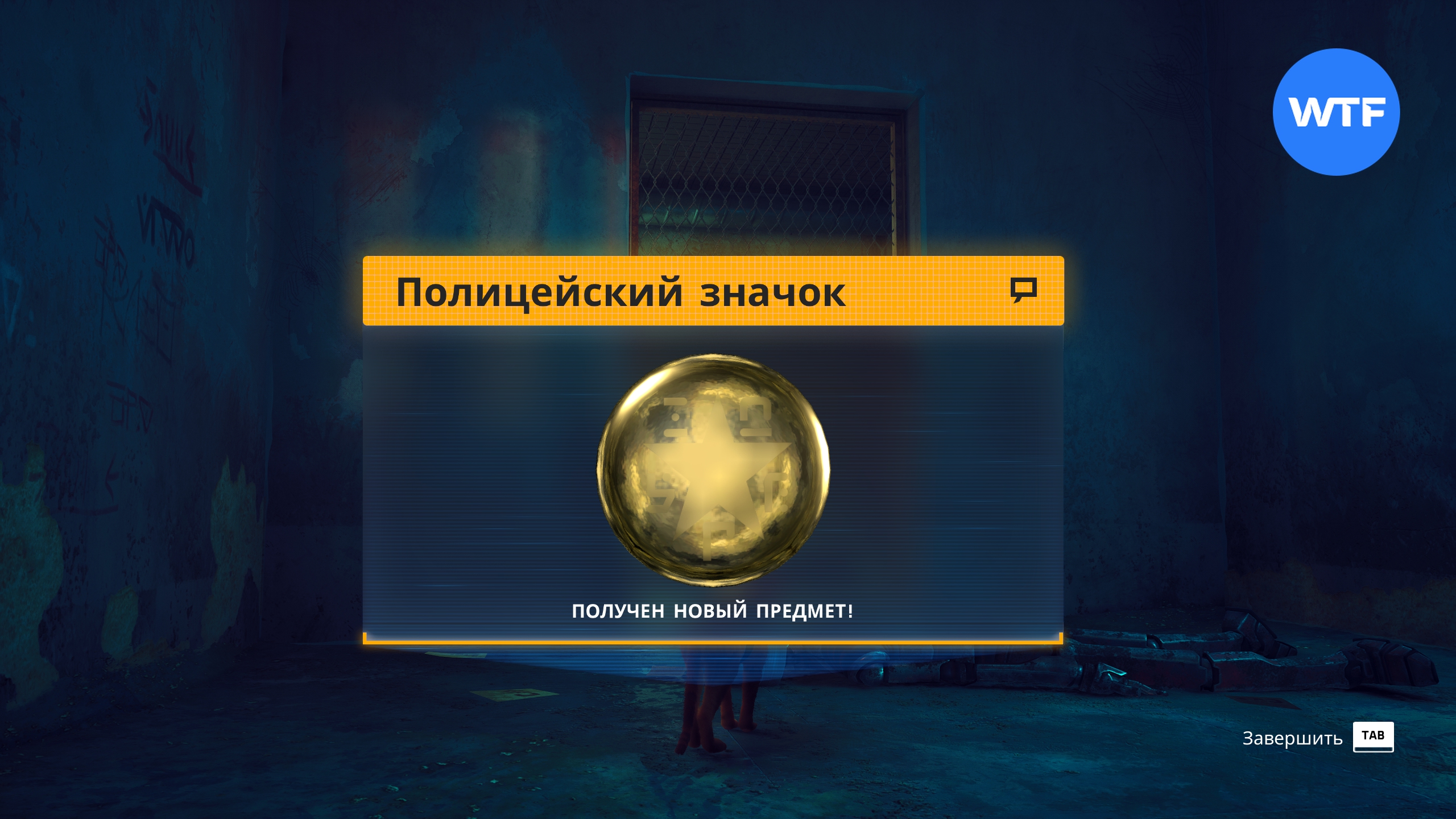 Там же в Мидтауне. Выйдите их предыдущего магазина и идите вперед по улице до лестницы (не поднимайтесь к большой голограмме). Прямо перед ступеньками можно свернуть в переулок слева. В начале переулка стоит стол, запрыгнув на который можно в итоге добраться до окна с решеткой в конце переулка (см. скриншот 2). Через него вы попадете в камеру, где сможете забрать этот значок.