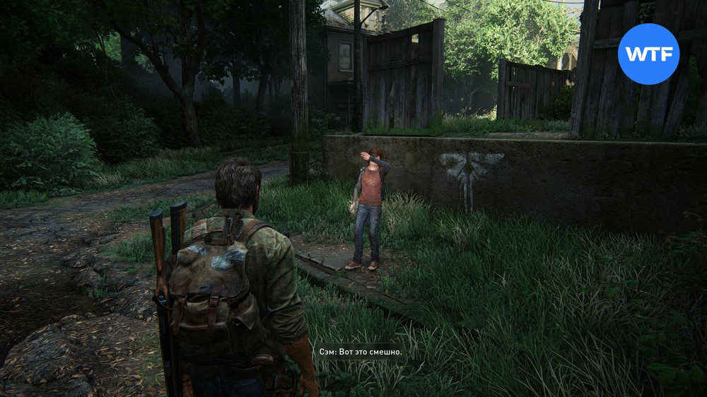 Пройдите до конца улицы, туда где бегали две собаки. Там на заборе нарисован символ Цикад. Сначала должен подойти и заговорить Генри. Через некоторое время после этого Элли решит достать книжку с шутками. Не уходите, пока она не замолчит.