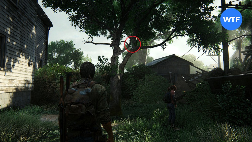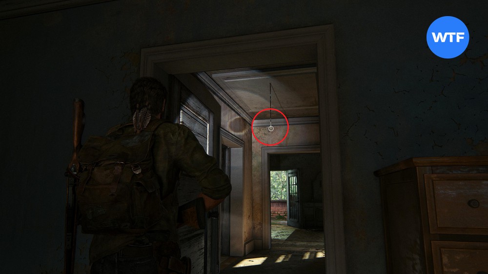 Во дворе справа от главного входа белого дома растет большое дерево, на котором и висит этот кулон. Это в двух шагах от места, где Элли шутила. Стреляйте по кулону, чтобы его забрать.