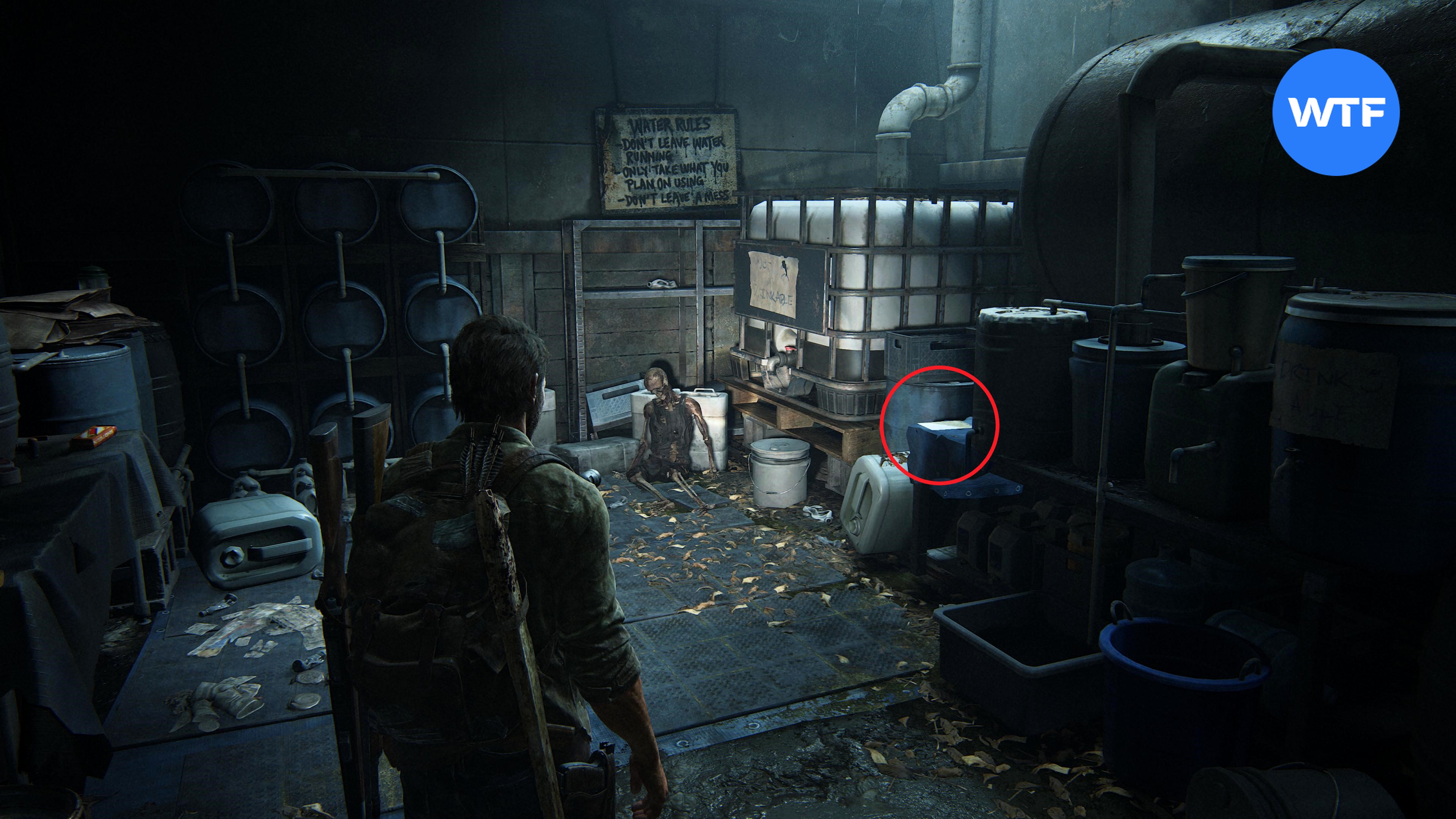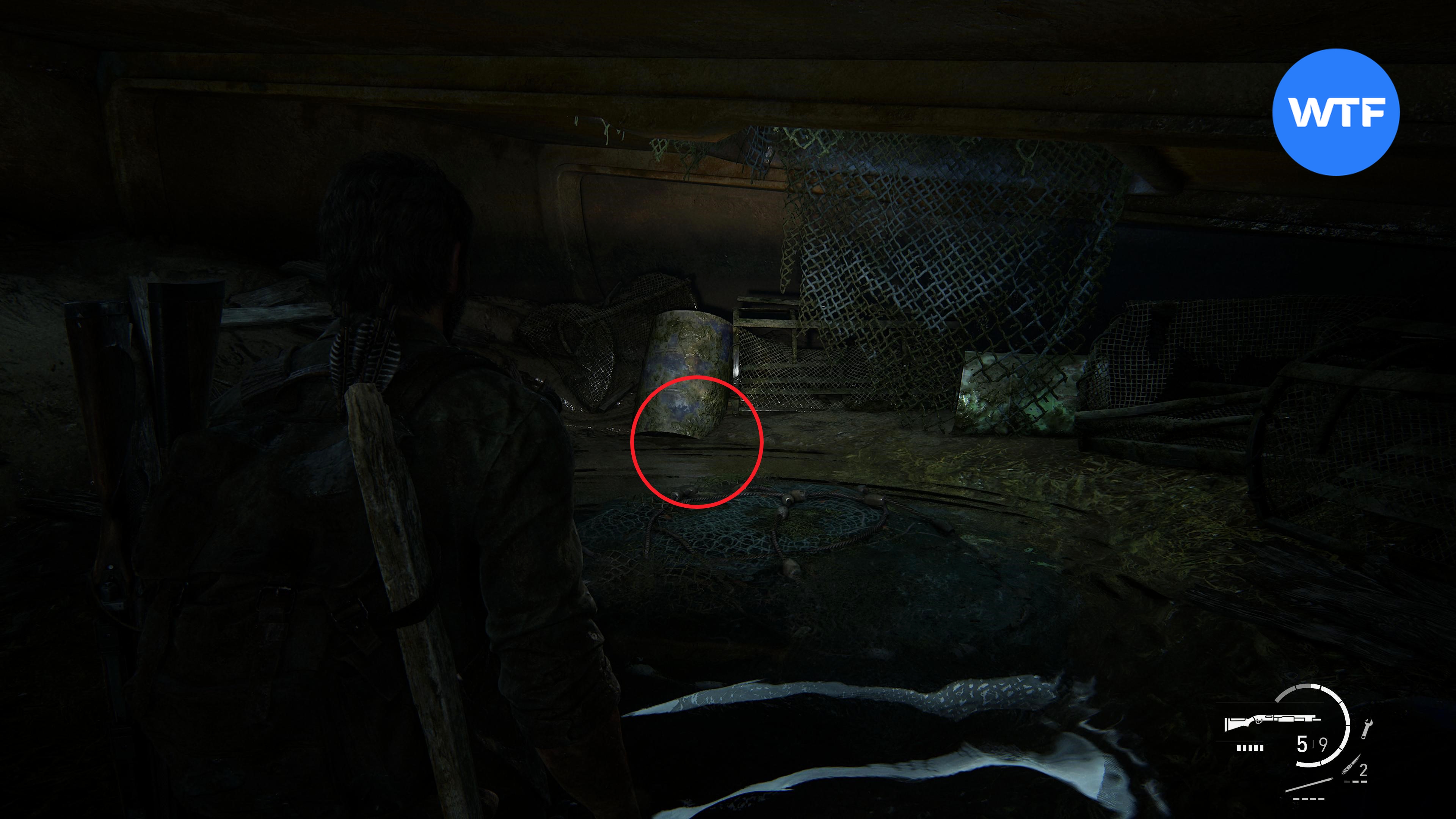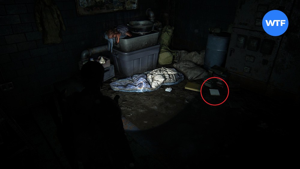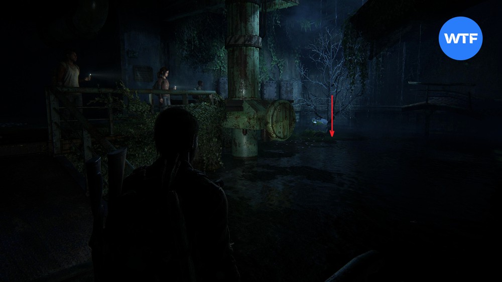 По сюжету вам нужно проплыть под воротами и найти деревянный поддон для Элли. Рядом с ним есть дверь, ведущая в комнату с Щелкунами. Разберитесь с врагами и возьмите записку у спального мешка.