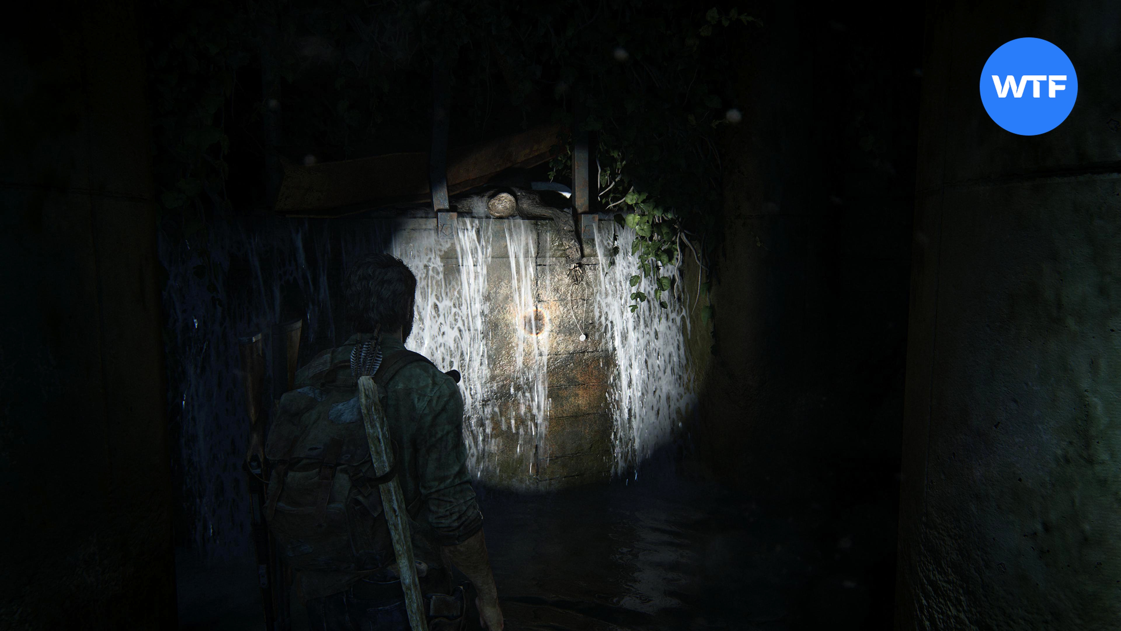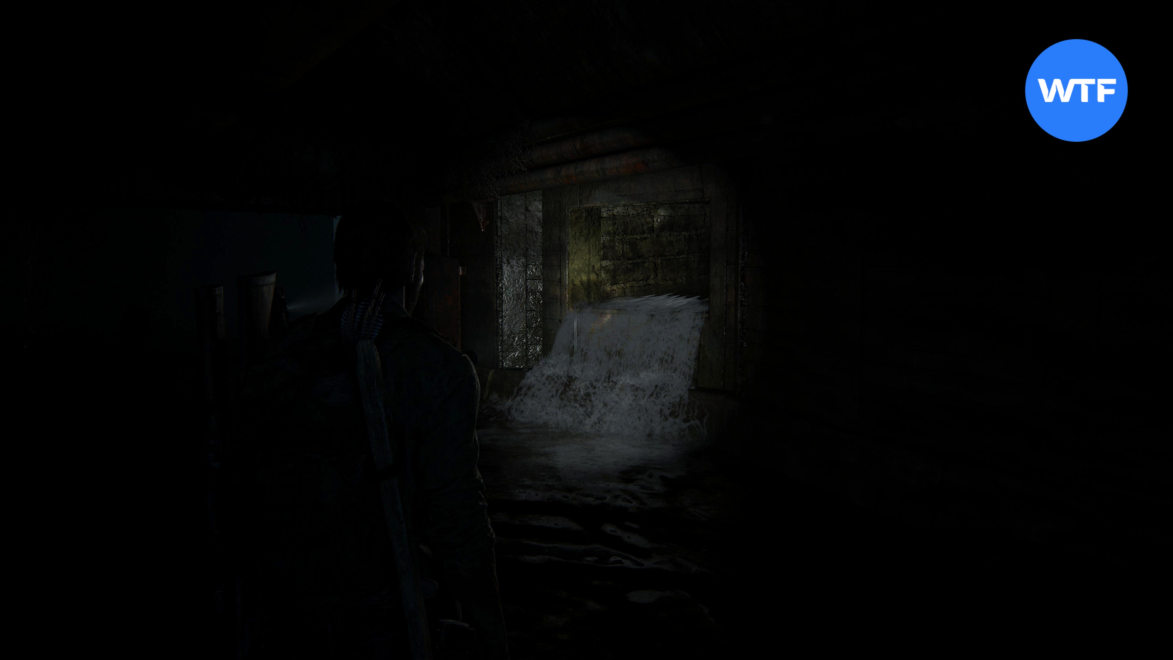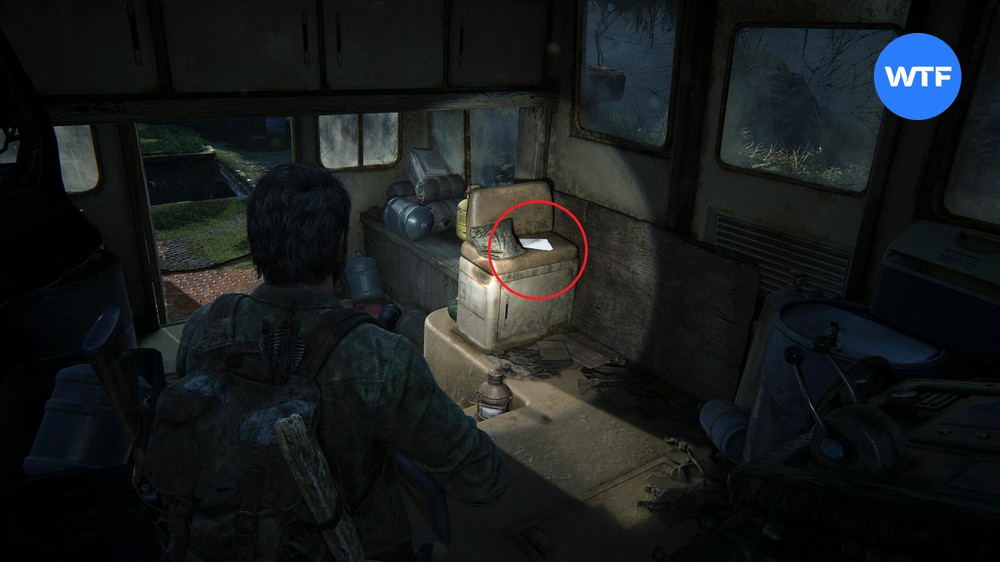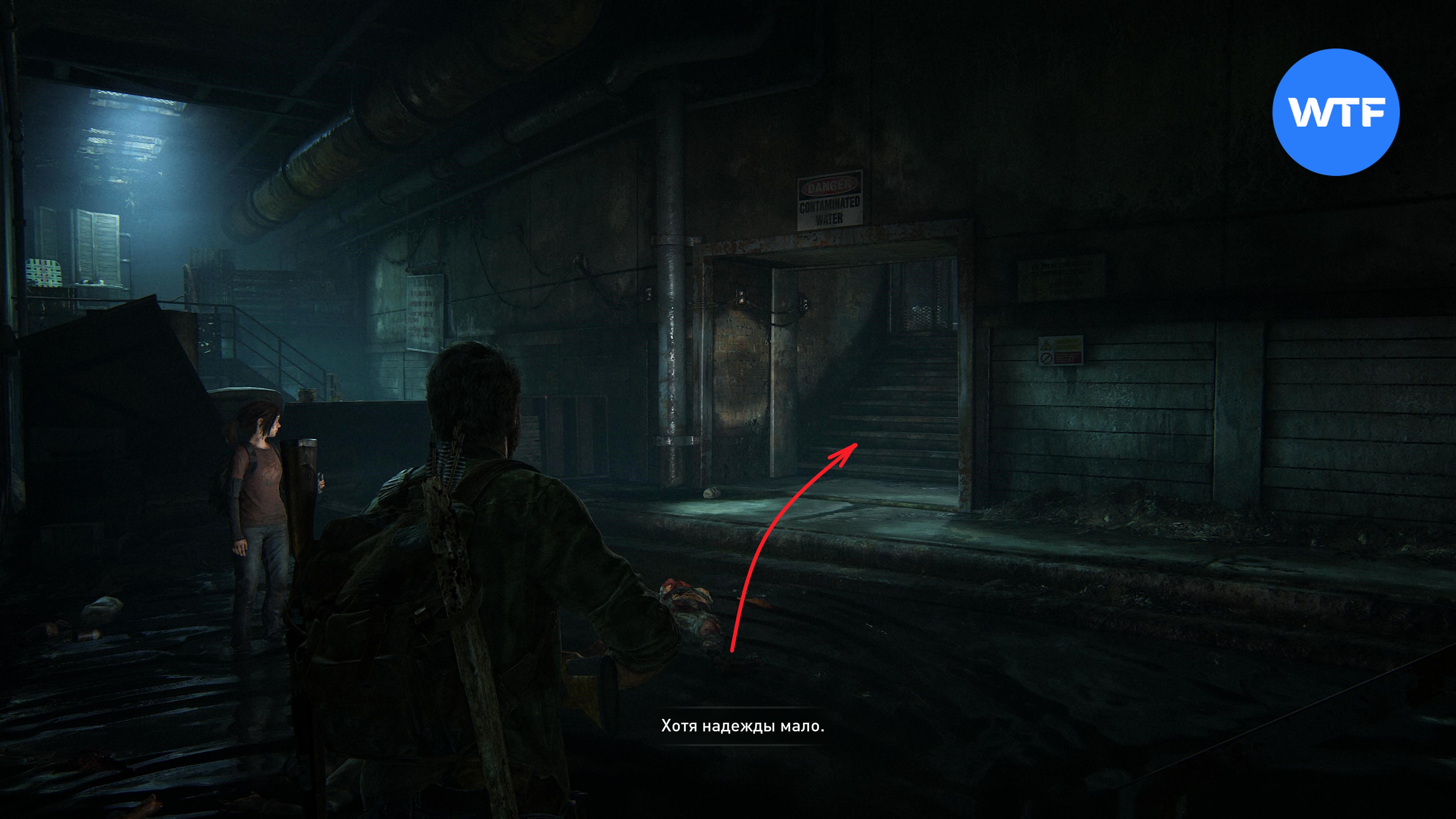 По сюжету вам нужно проплыть под воротами и найти деревянный поддон для Элли. Рядом с ним есть дверь, ведущая в комнату с Щелкунами. Разберитесь с врагами и возьмите записку у спального мешка.