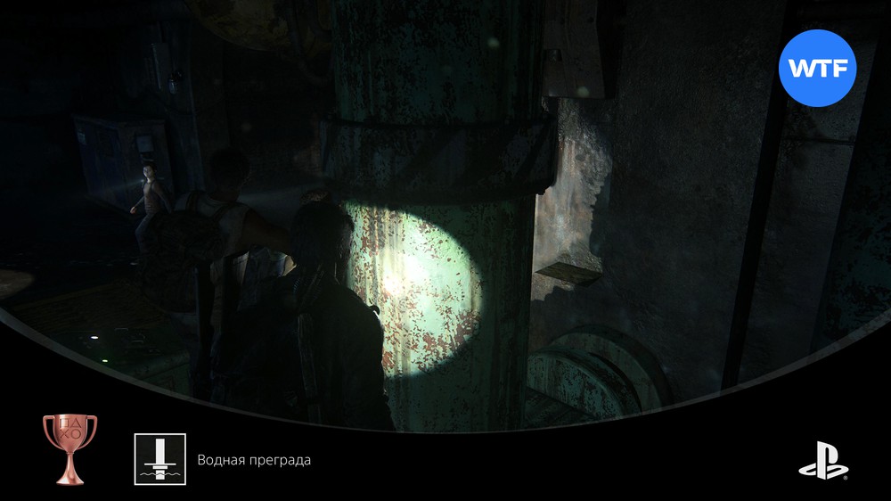 Посадите Элли на поддон, дотолкайте до генератора и, как только она залезет на платформу, плывите обратно к Генри и Сэму. Вы должны успеть запрыгнуть на движущуюся площадку вместе с ними, чтобы получить это достижение.