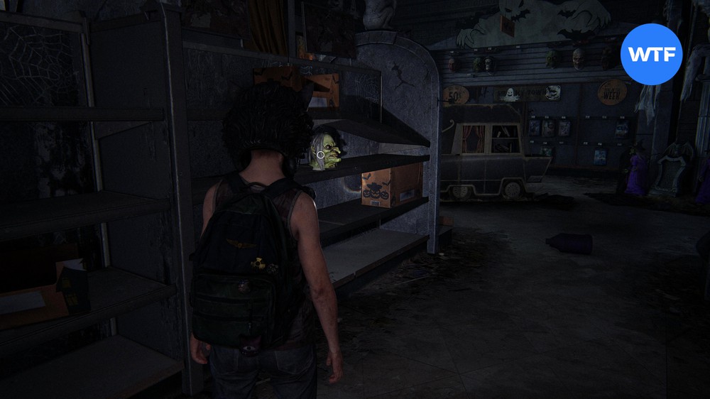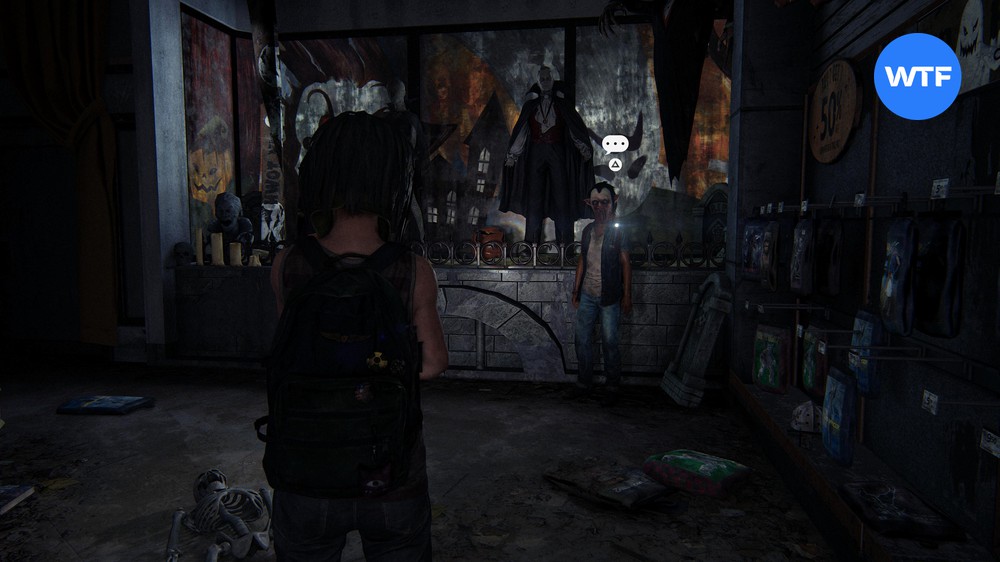 В дальнем левом углу магазина дождитесь, пока Райли наденет на себя маску вампира, чтобы с ней поговорить.