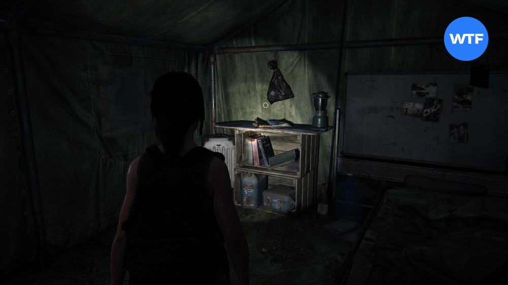 Войдите в палатку и осмотрите предметы на стеллаже у дальней стены.