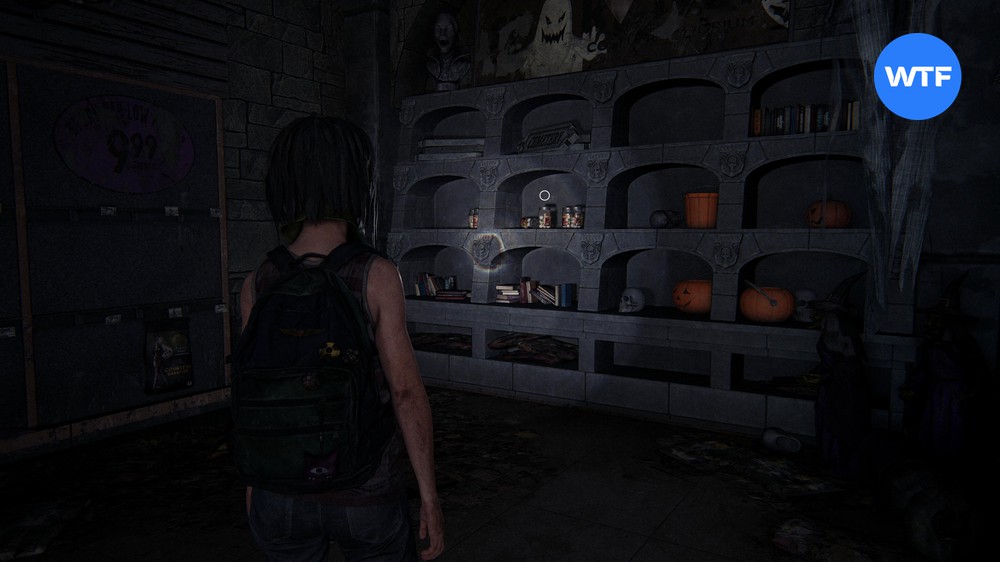 Оказавшись в магазине с товарами для Хэллоуина, идите в дальний правый угол и осмотрите банки на стеллаже. Не выходите из магазина через дверь, пока не соберете еще 4 диалога, указанные ниже.