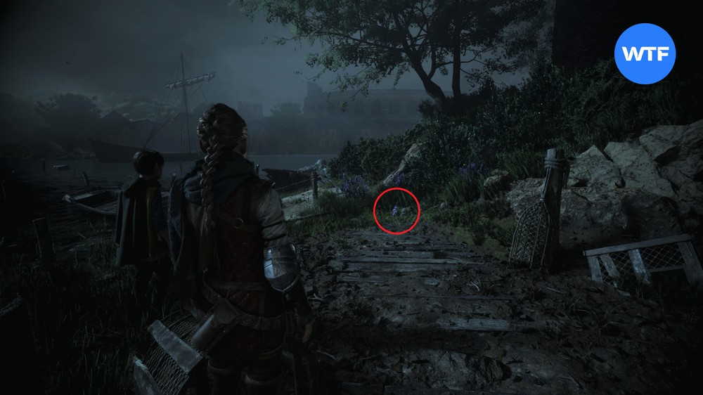 Ближе к началу главы, после того как доберетесь до доков, где пришвартовано много кораблей, идите вдоль кромки воды направо, вместо того чтобы залезть на пристань слева. Вы найдете фиолетовый цветок для гербария на берегу.