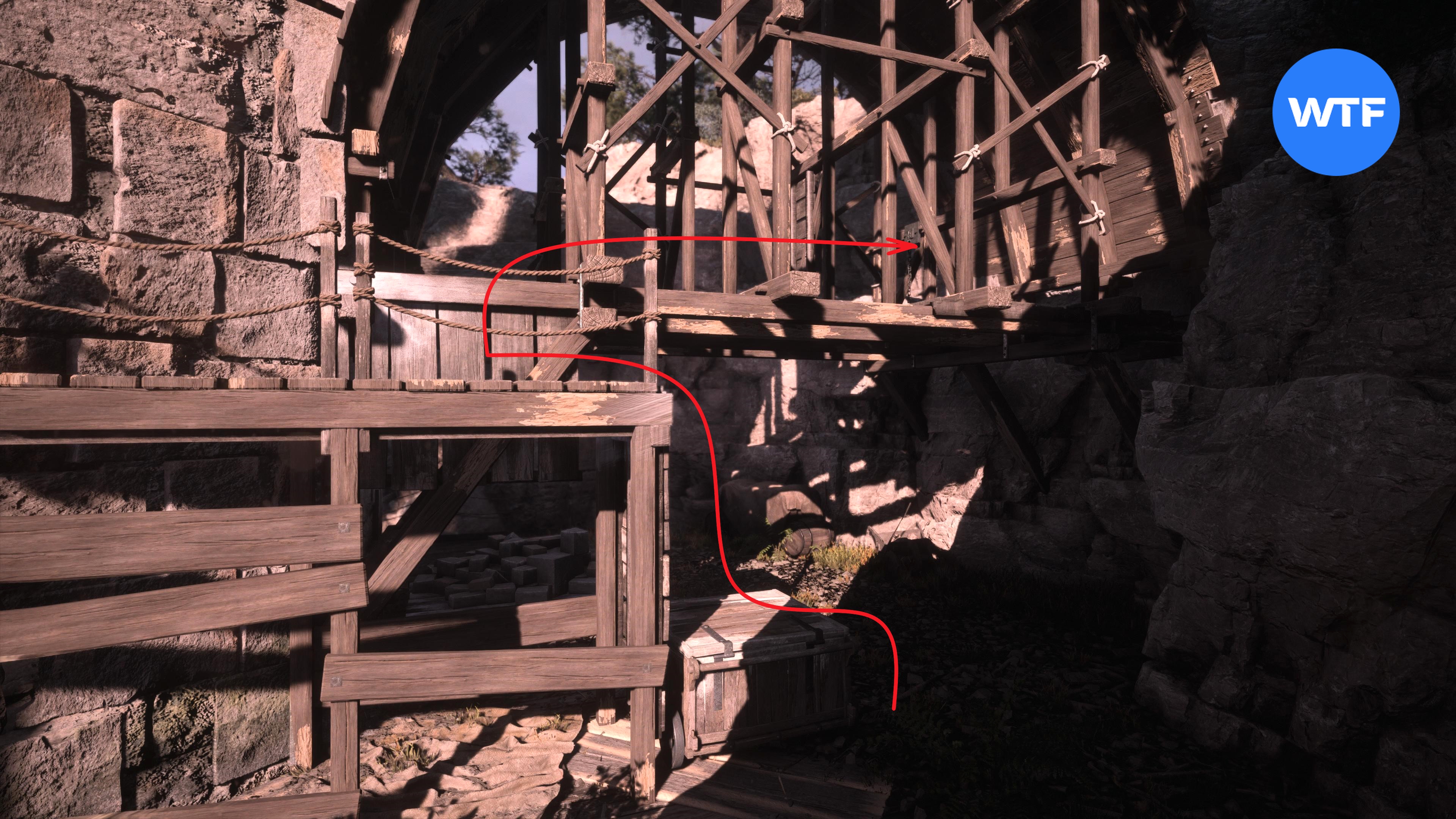 Для начала при помощи пращи сбейте цепь, удерживающую деревянный подъемный мостик. После этого подтащите тележку с уступу, чтобы у вас была возможность забраться наверх. Теперь идите наверх, к скалам. У обрыва вы найдете розовый цветок для гербария.