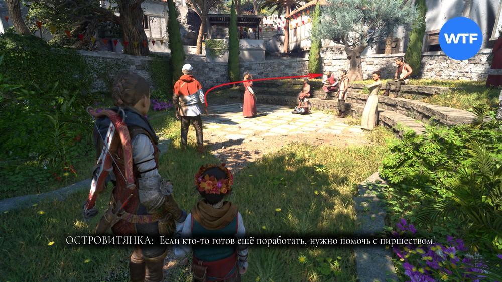 Причалив на острове и добравшись до рыночной площади по сюжету, идите в её левый дальний угол. Там вы найдете женщину, разговаривающую с группой островитян о пиршестве. Перо лежит возле большого дерева за ними.