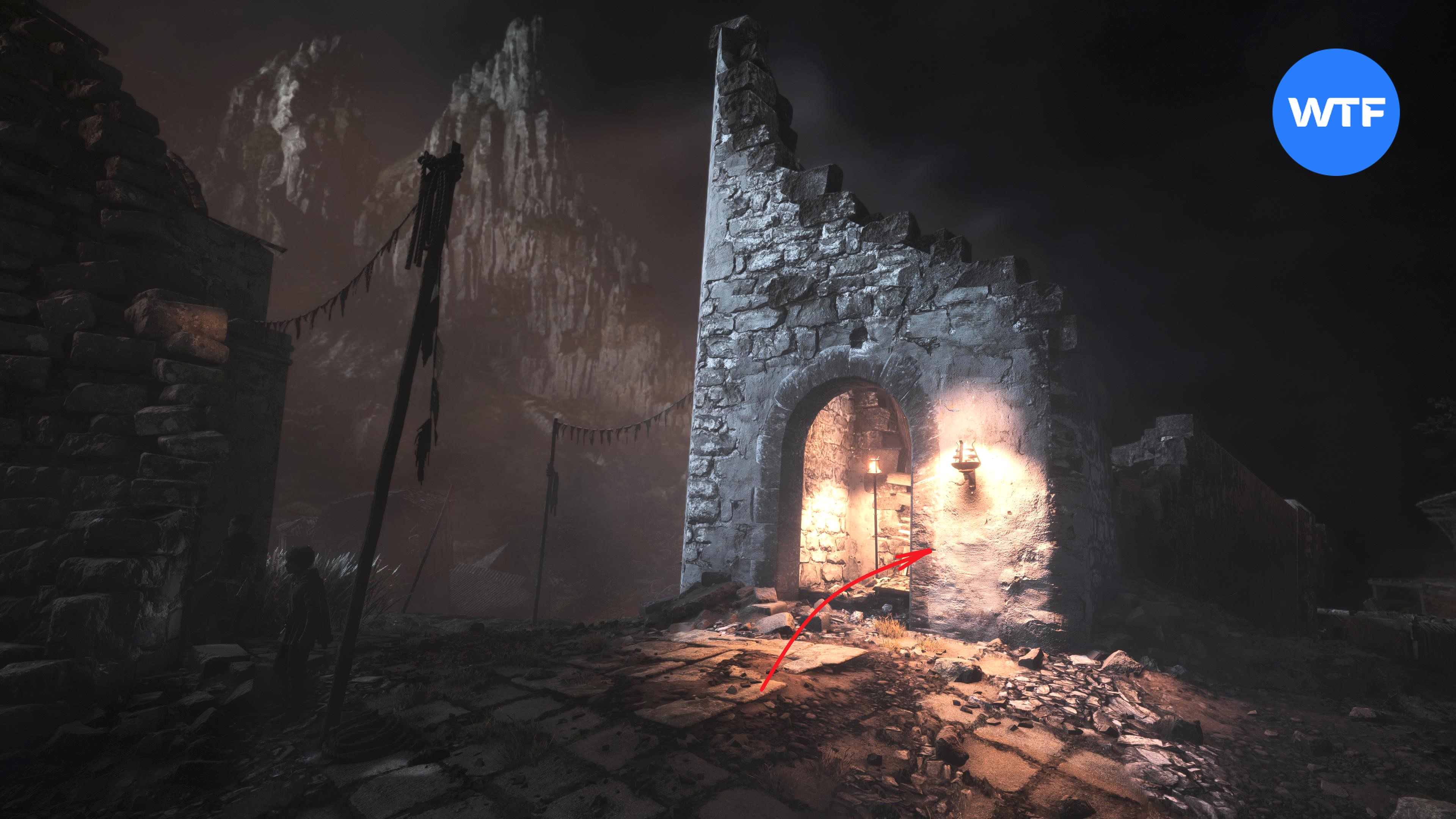 В конце стражник запрет ворота прямо у вас под носом, и вам придется пробираться ко входу через разрушенную башню. В этой башне поднимитесь на самый верх, а затем идите по уступу до конца, чтобы найти это перо.