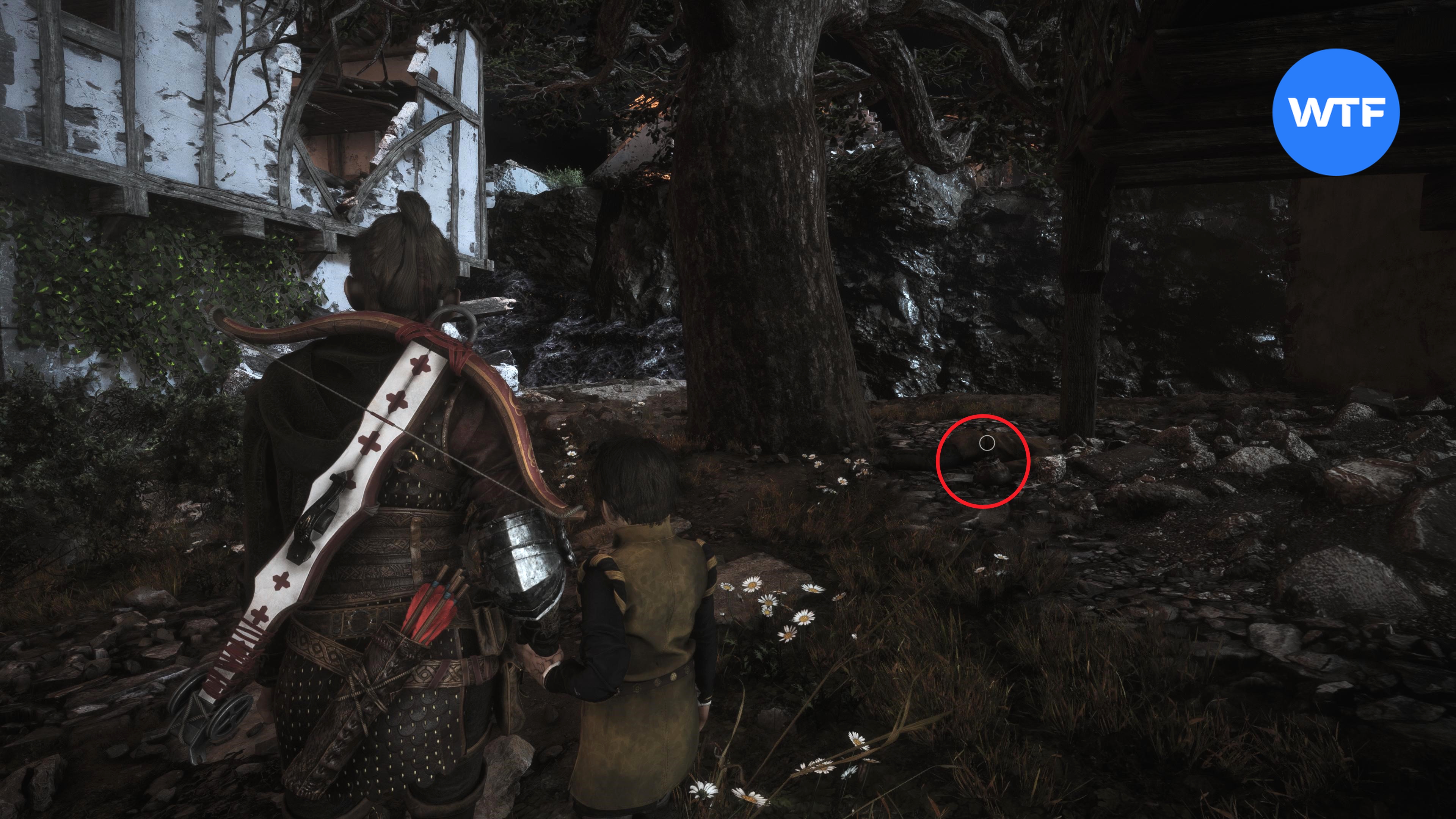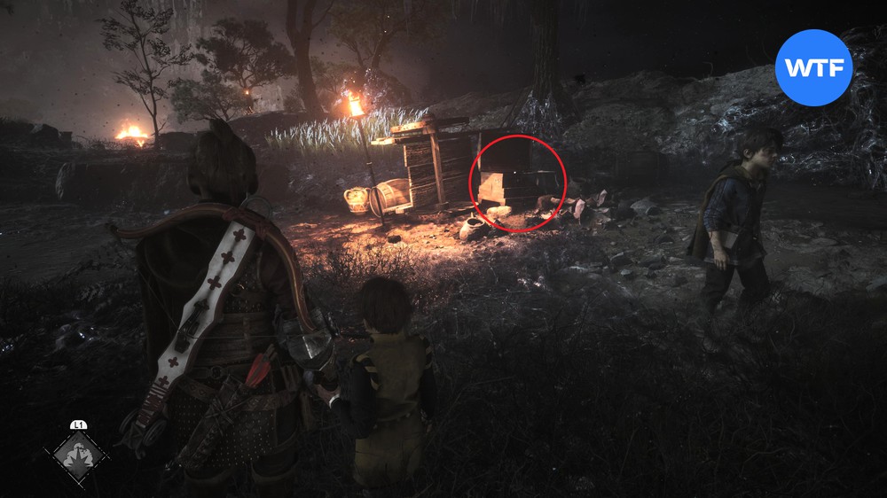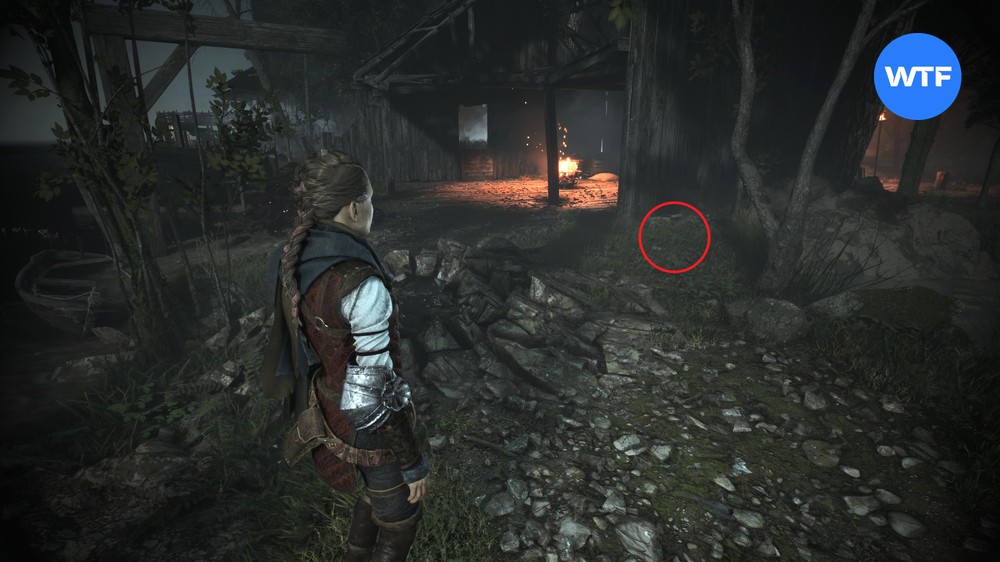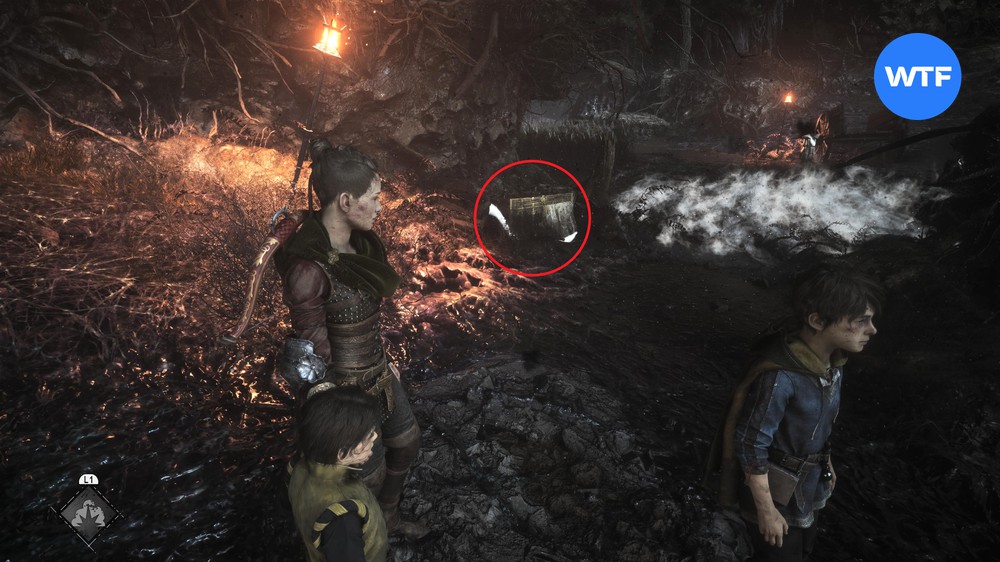 Двигайтесь по сюжету, пока Амиция не научится цеплять крюк к арбалету. После этого спуститесь к воде и идите вдоль берега налево, чтобы найти этот сундук и мешочек с элементами у скал.