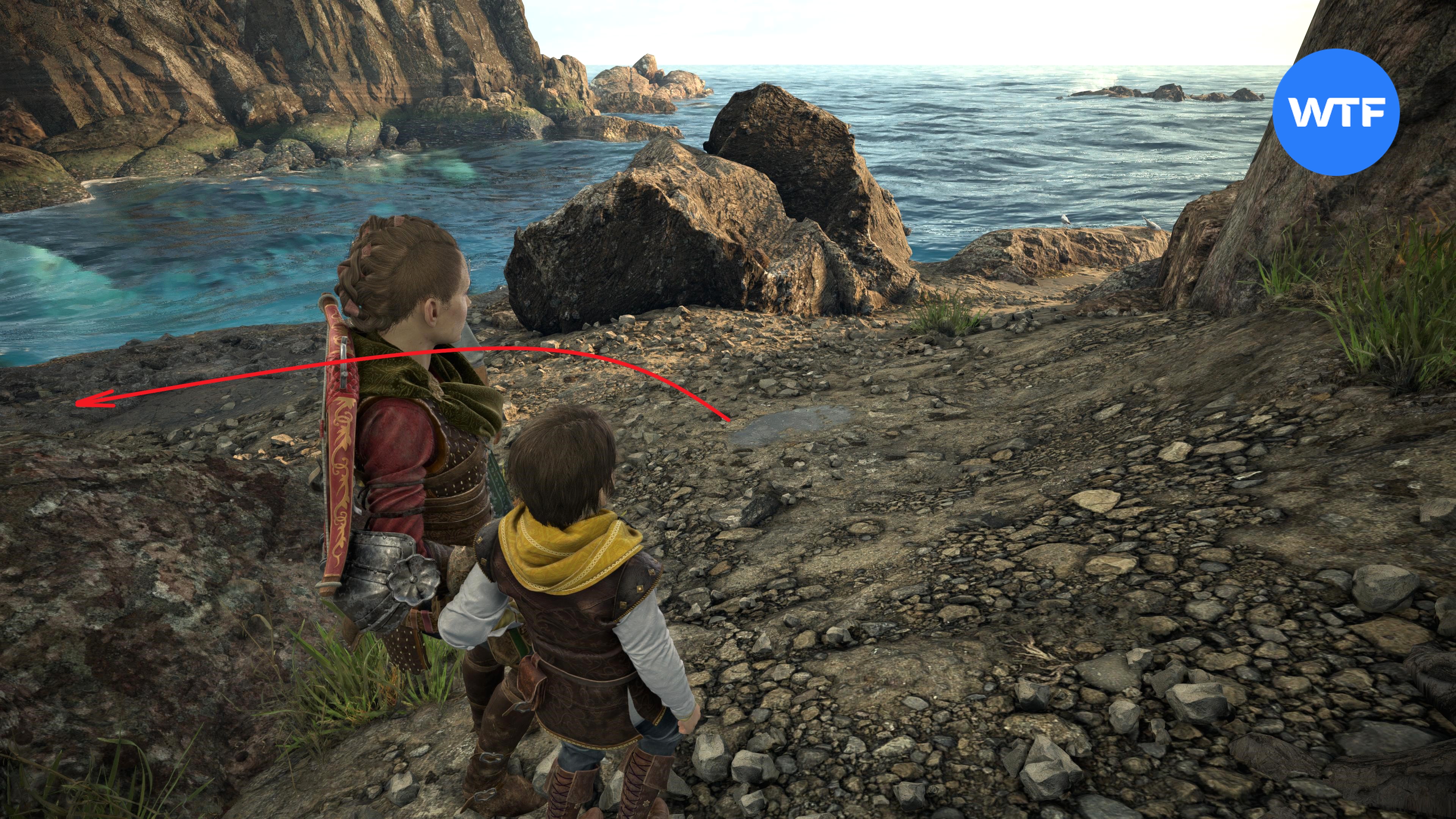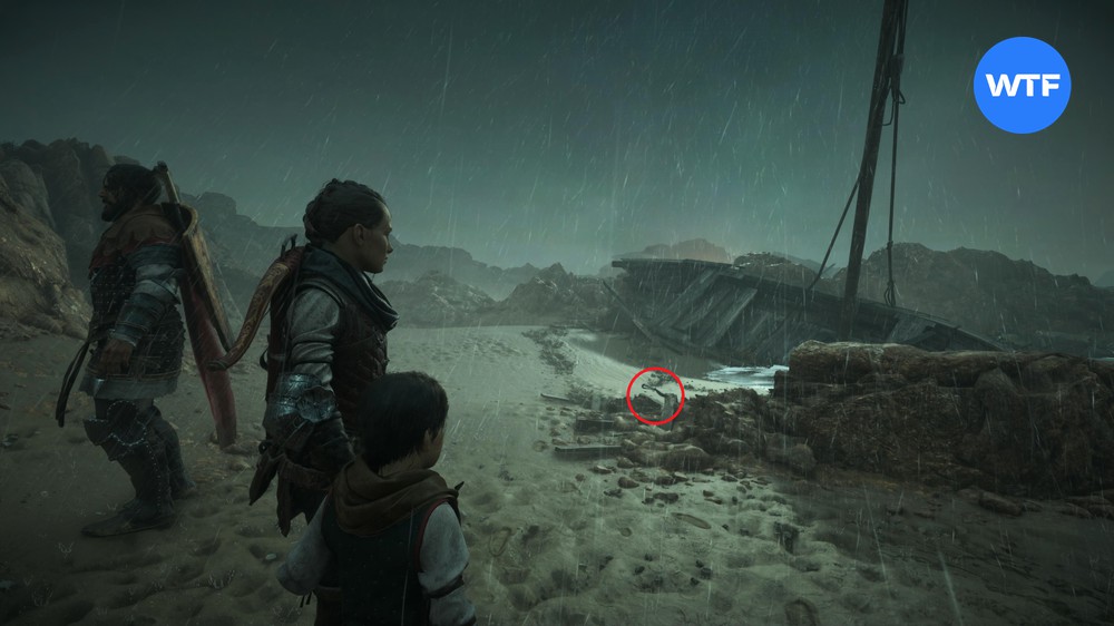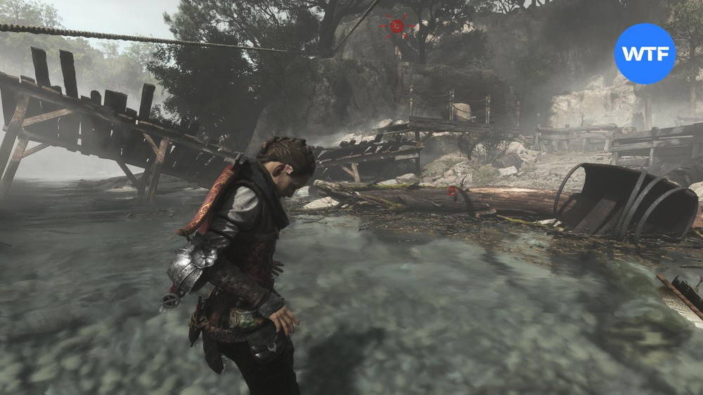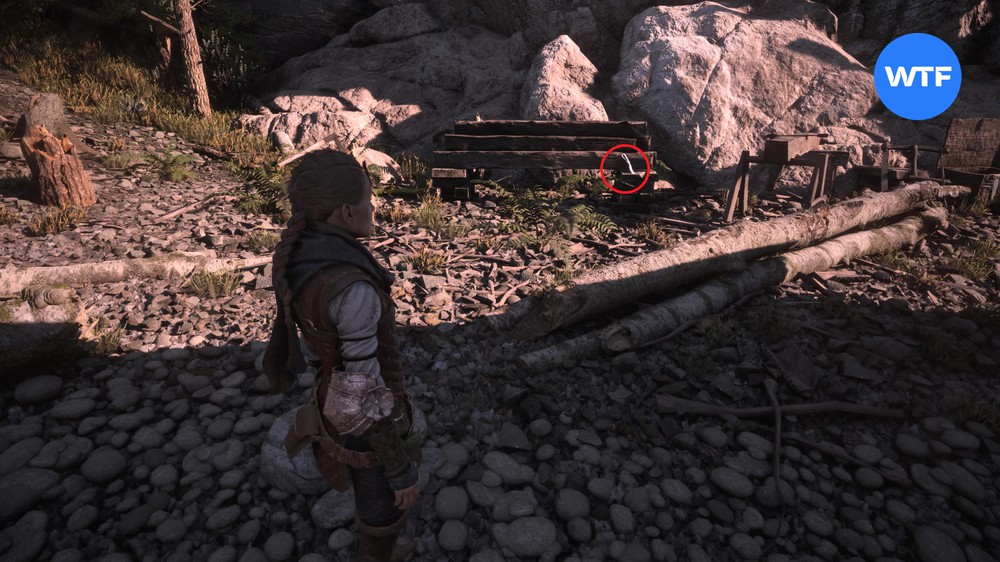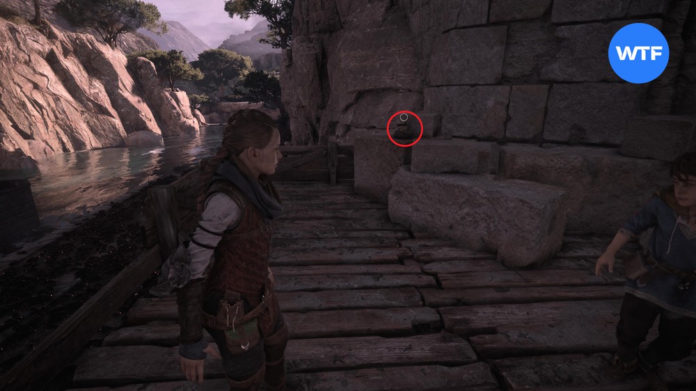 Двигайтесь по сюжету, пока Амиция не научится цеплять крюк к арбалету. После этого спуститесь к воде и идите вдоль берега налево, чтобы найти этот сундук и мешочек с элементами у скал.