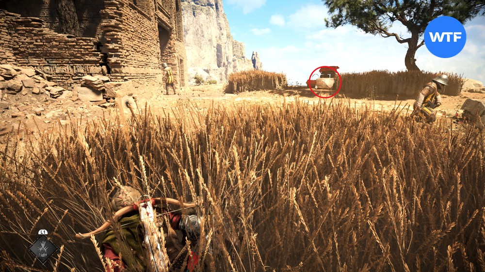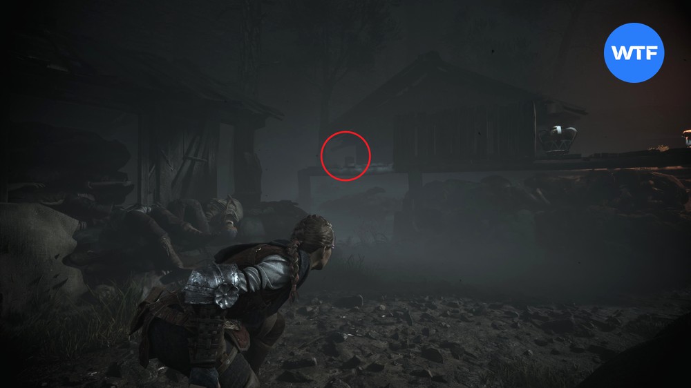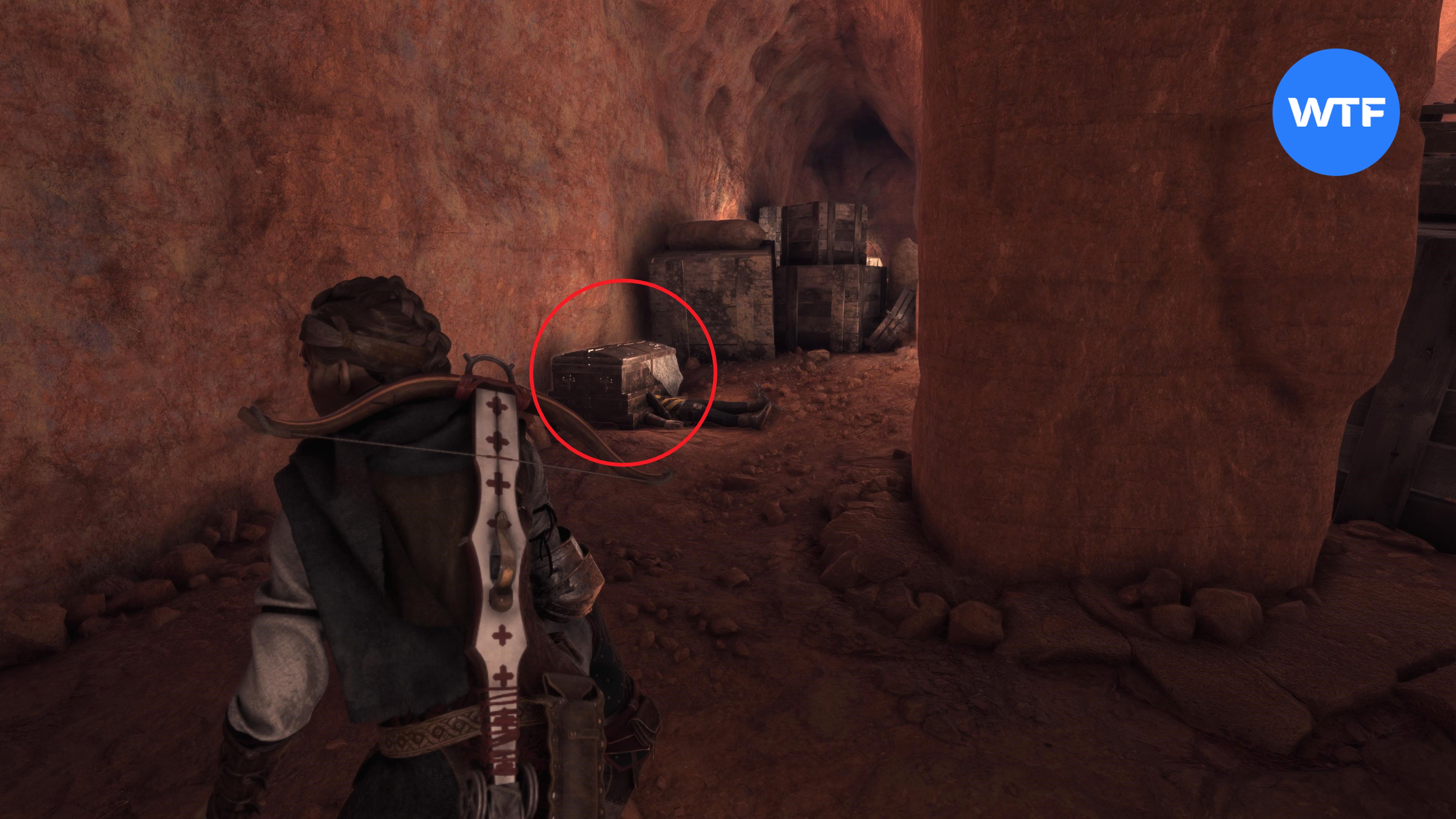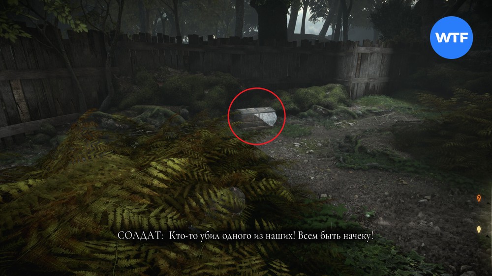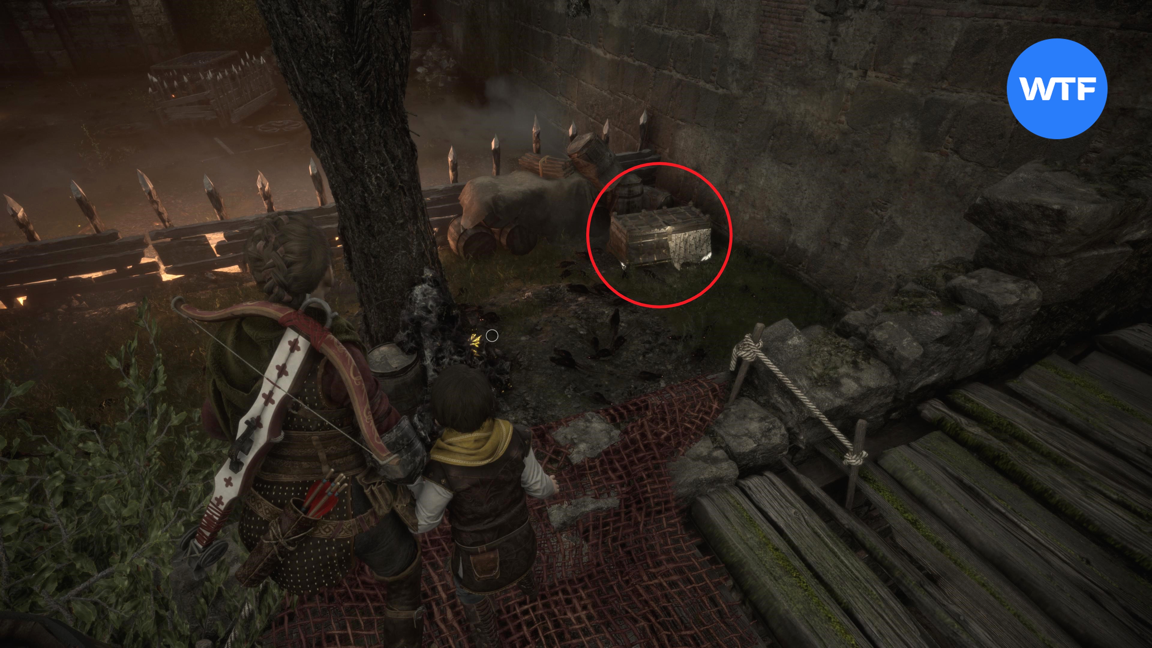 Вернувшись на главную дорогу и пройдя немного вперед, вы окажетесь в локации, которую необходимо проходить скрытно. Сундук стоит рядом с дверью, ведущей на выход.