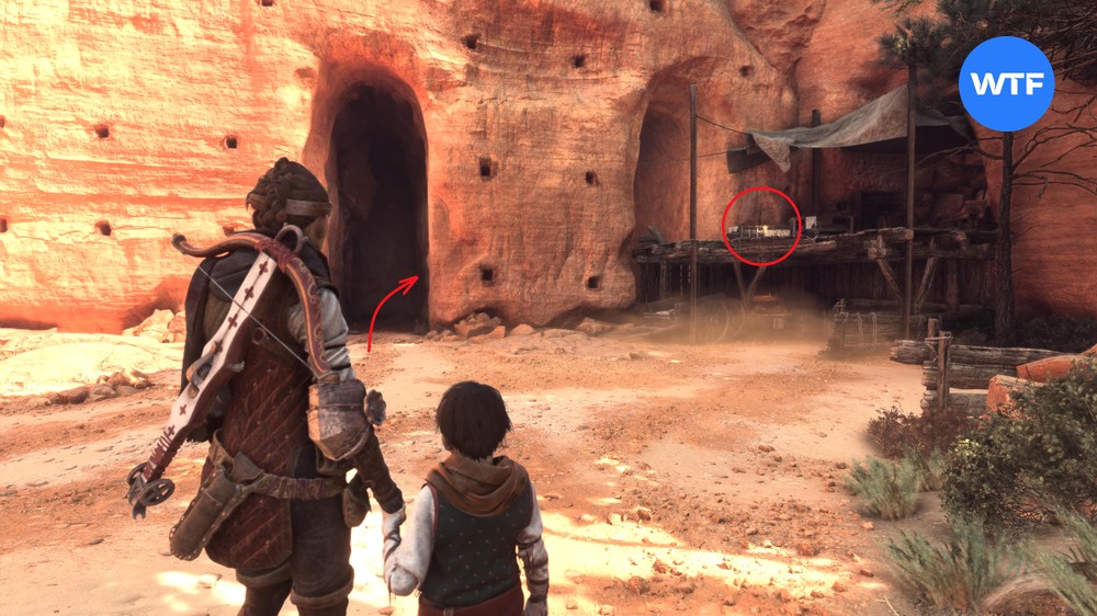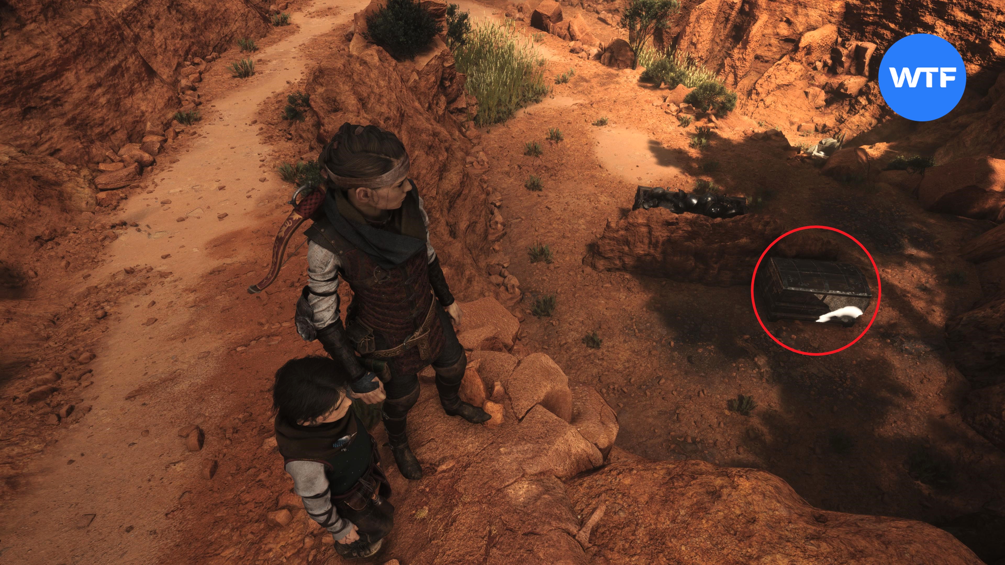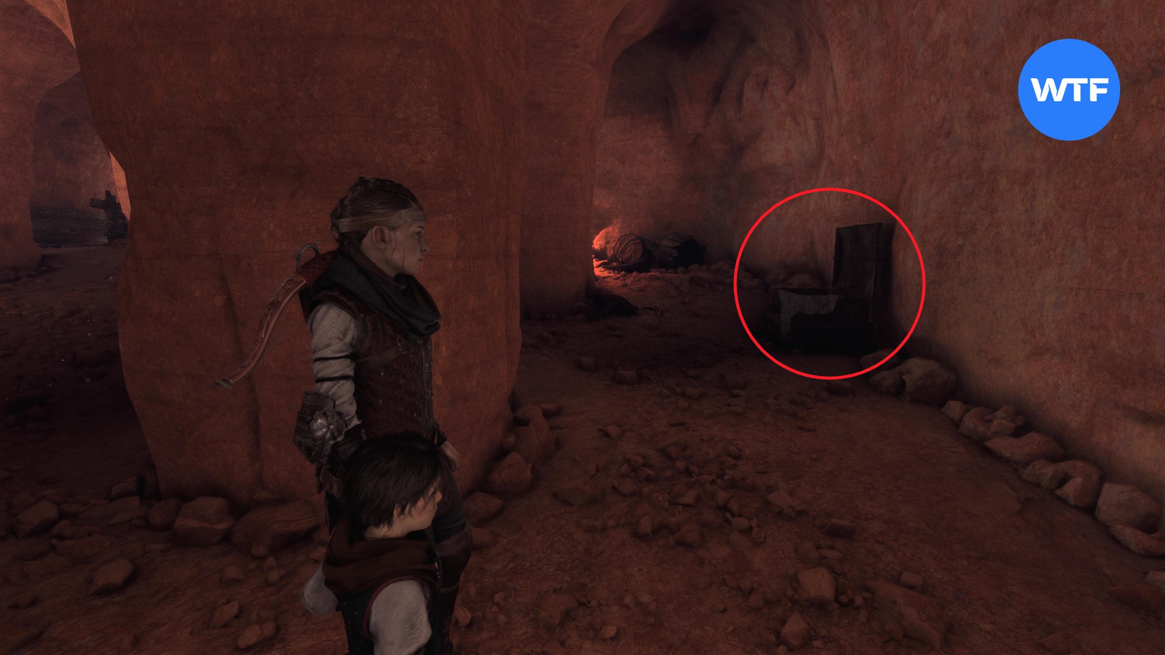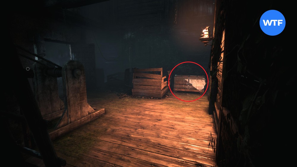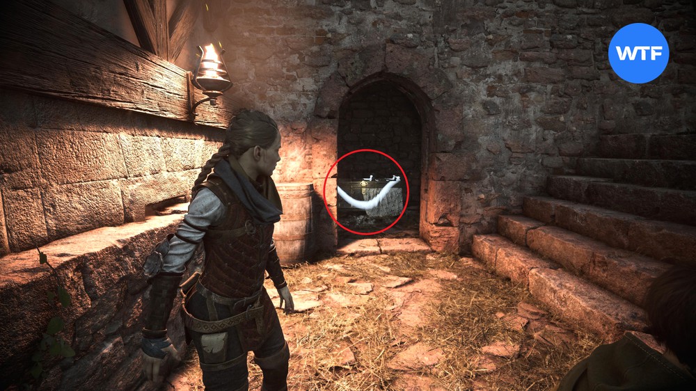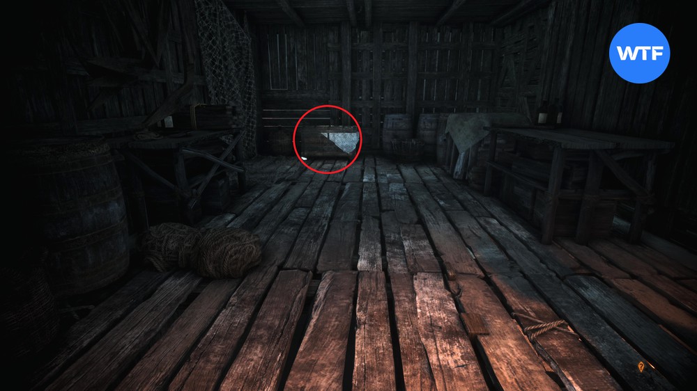 Вернувшись на главную дорогу и пройдя немного вперед, вы окажетесь в локации, которую необходимо проходить скрытно. Сундук стоит рядом с дверью, ведущей на выход.