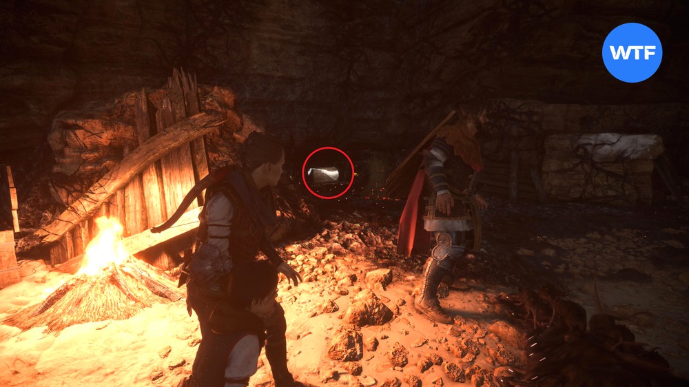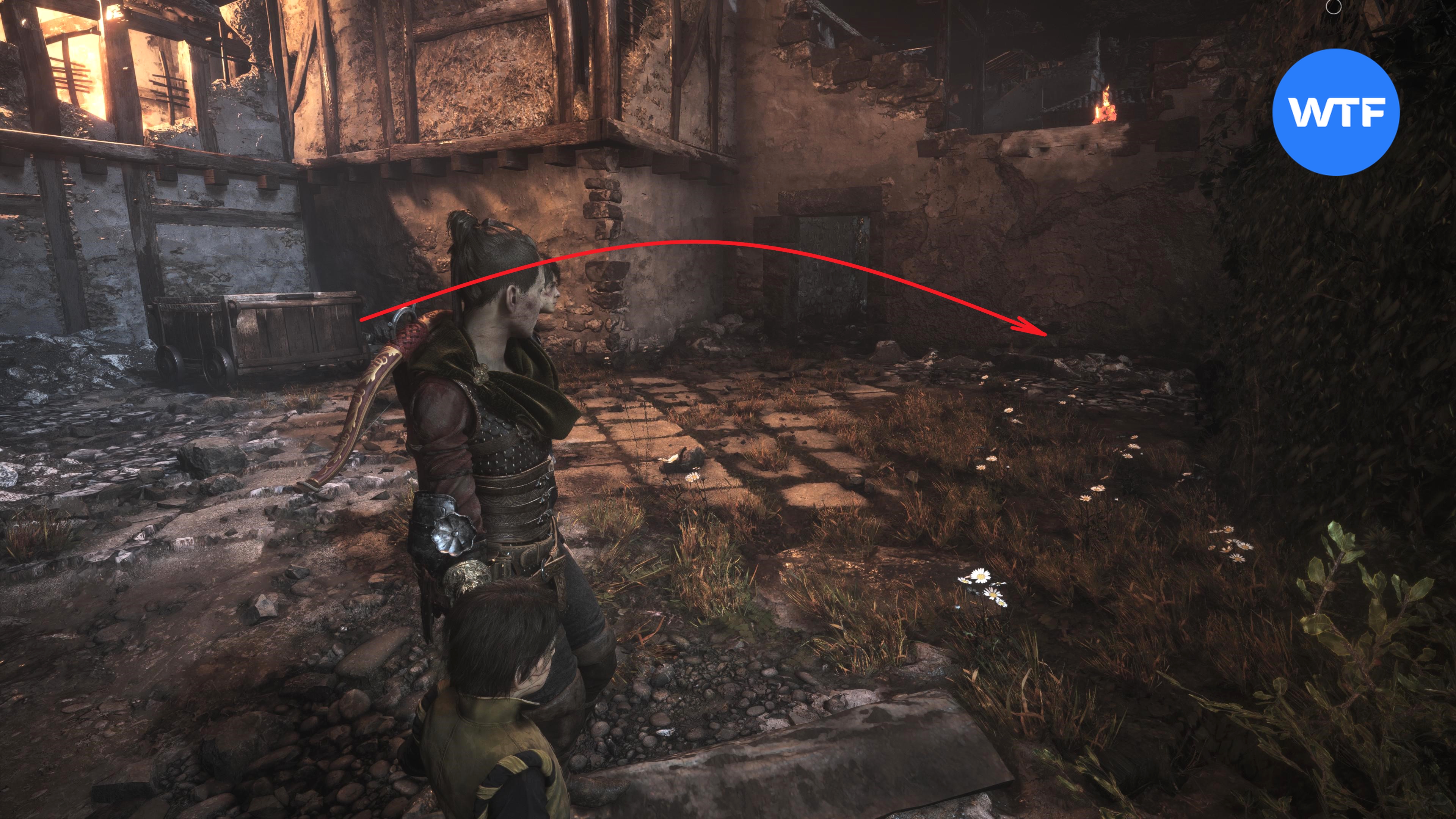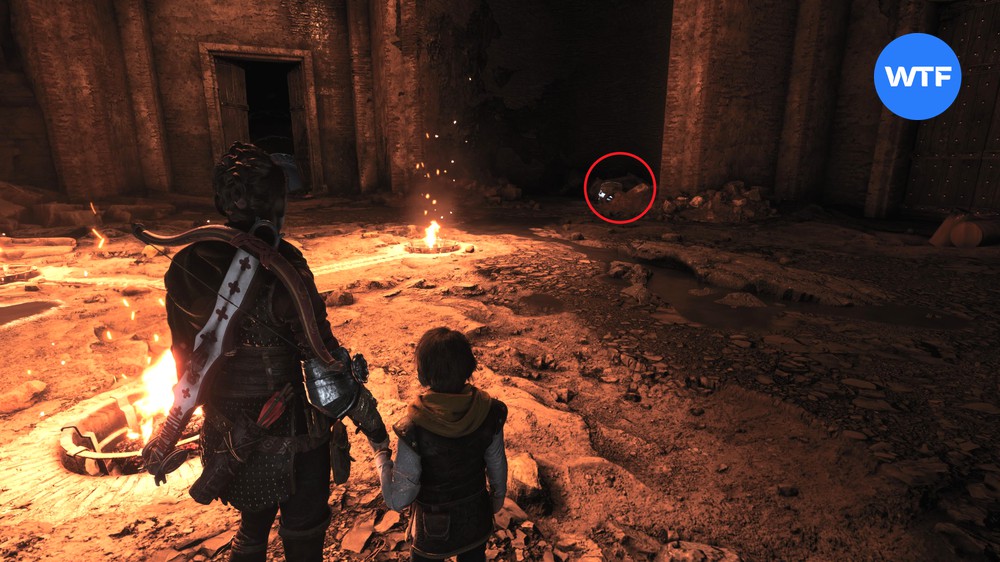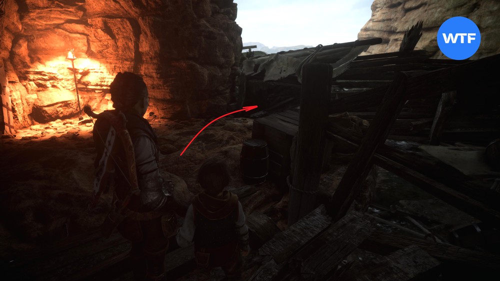 Двигайтесь по сюжету, пока не отправитесь на поиски святилища в горах. В какой-то момент на вашем пути встретится стадо коз, преграждающих путь. Продолжайте идти по дороге, пока не увидите разрушенную башню слева, из которой слышно блеяние. Чтобы попасть внутрь, подпалите траву справа от входа, а затем попросите Гуго пролезть в дыру и открыть дверь.
