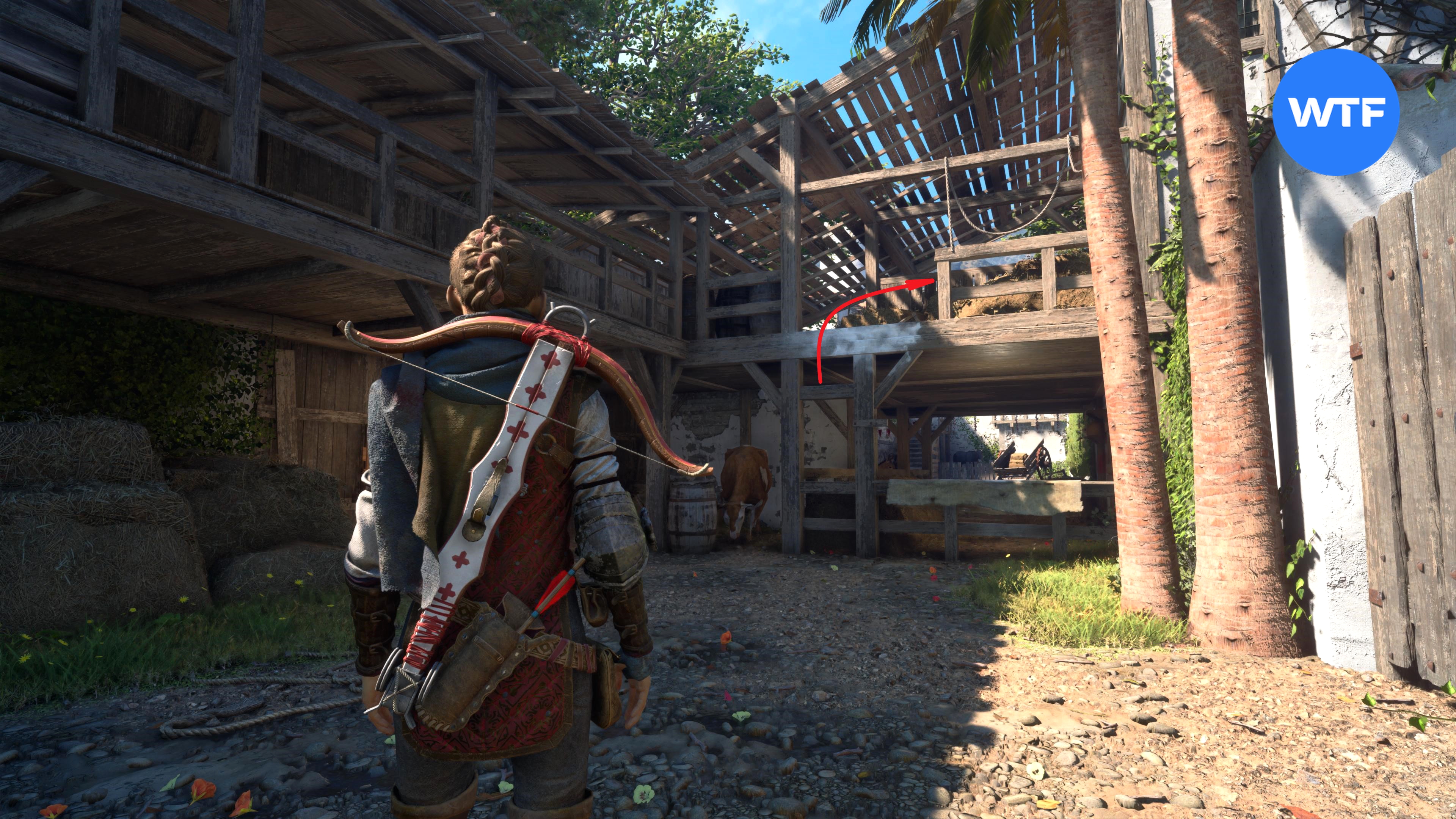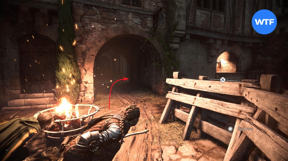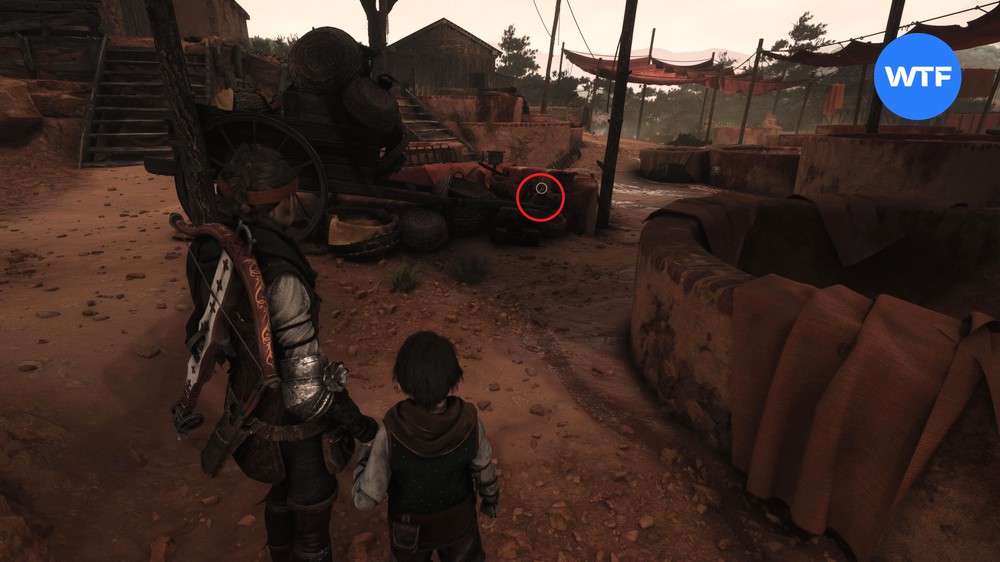 Продолжайте идти, пока не встретитесь с работорговцами. На доме справа, где стоит лучник, можно забрать нож с бочки.
