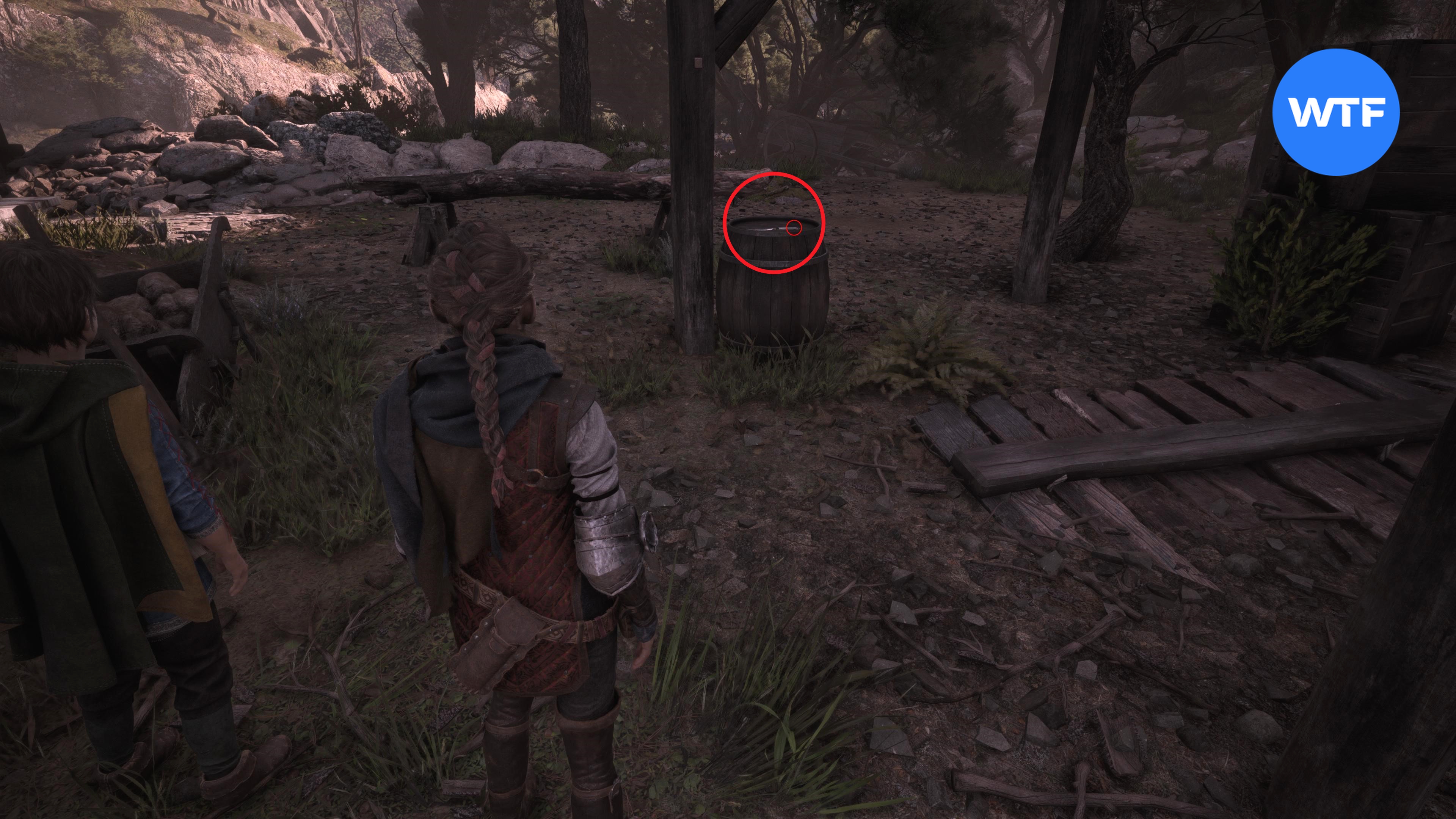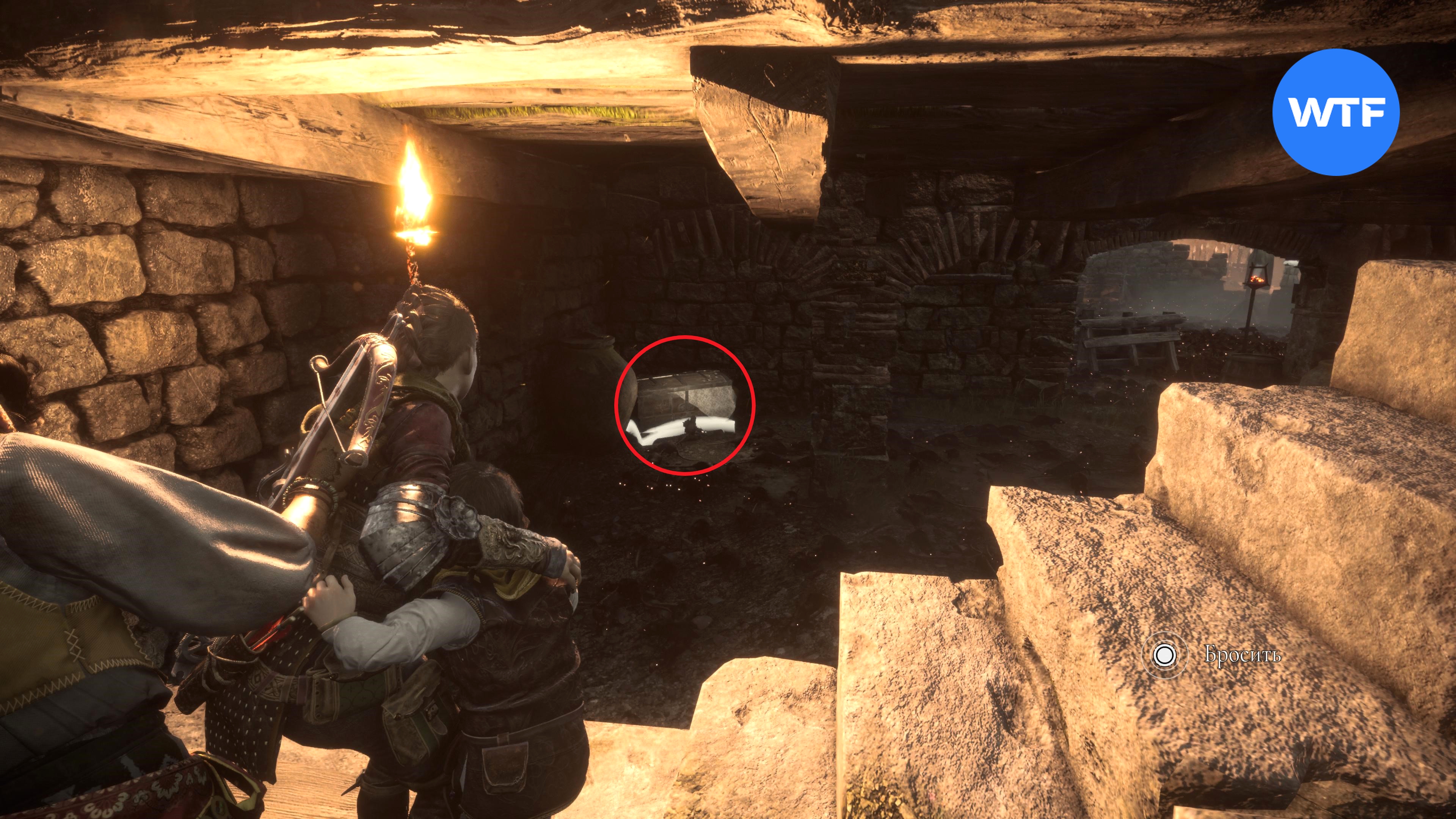 В доме слева от дороги есть еще два больших сундука, по одному на первом и втором этаже. На столе второго этажа есть мешочек с элементами. Также из стола возле каменной арки за этим домом торчит нож.