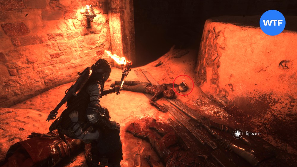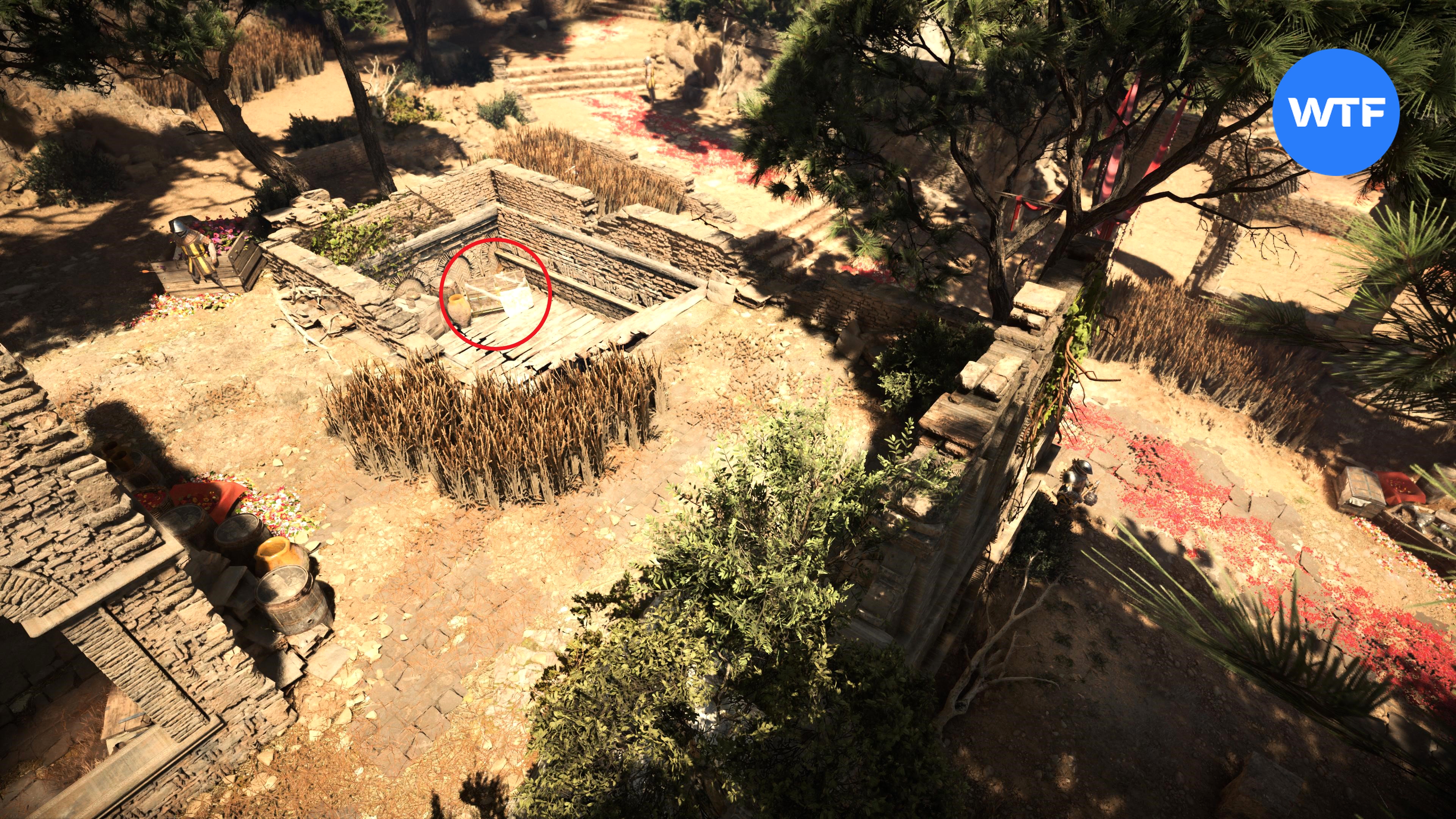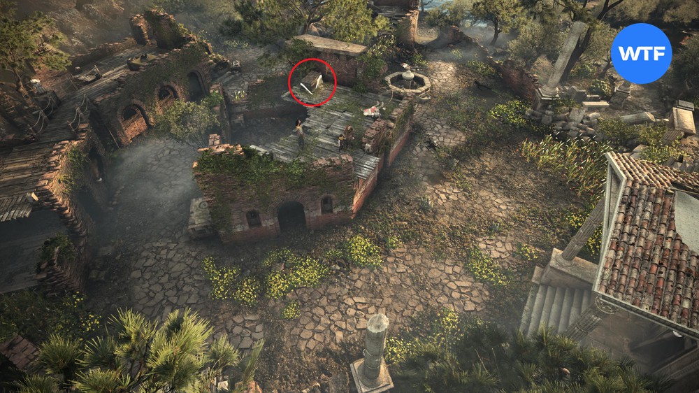 Теперь прыгайте вниз во двор. Заберите нож, торчащий из деревянной балки слева от вас и мешочек с элементами с трупа у дерева напротив.