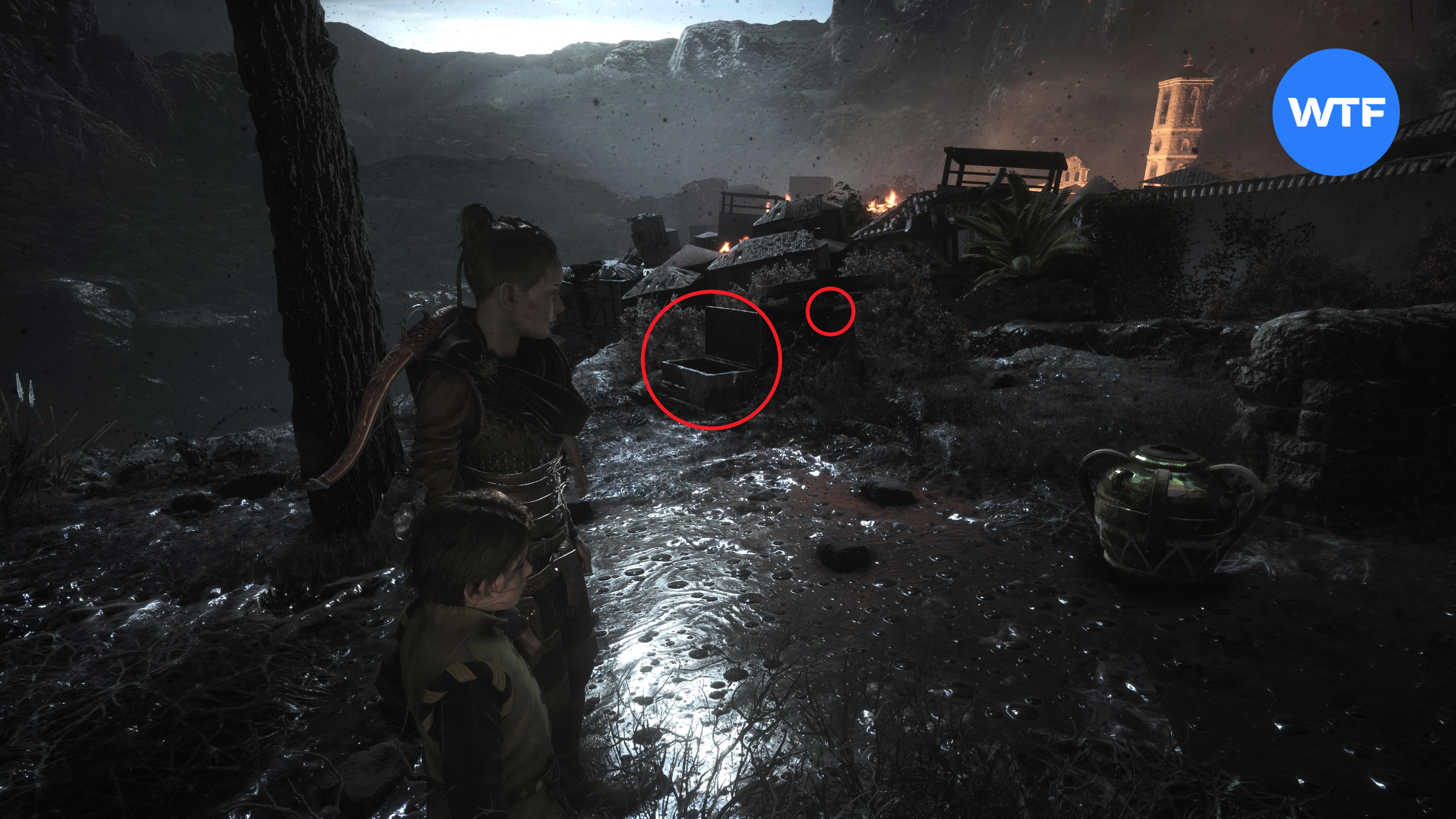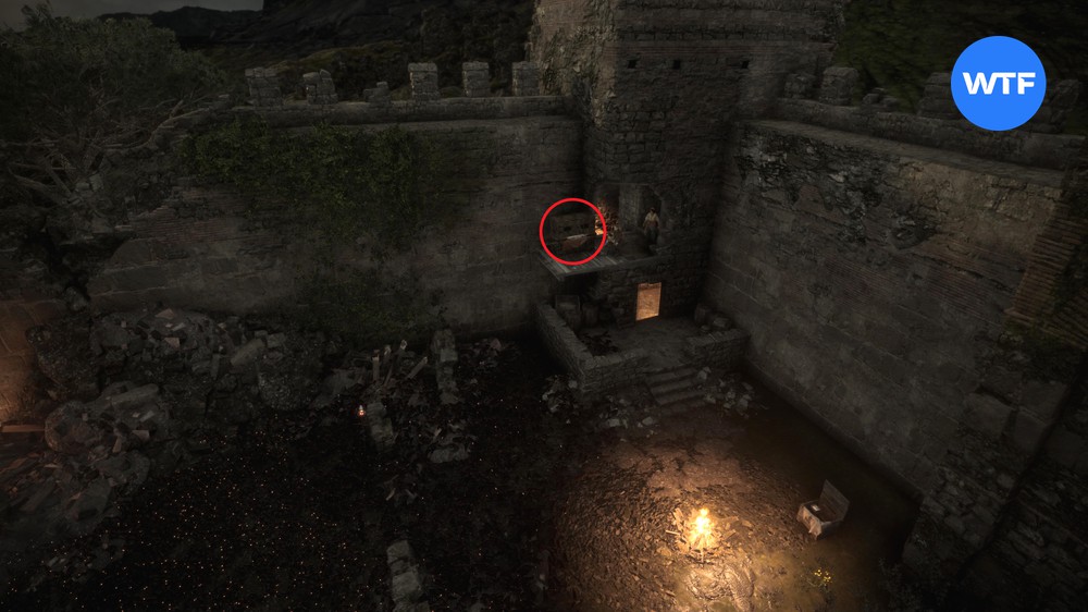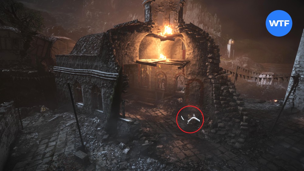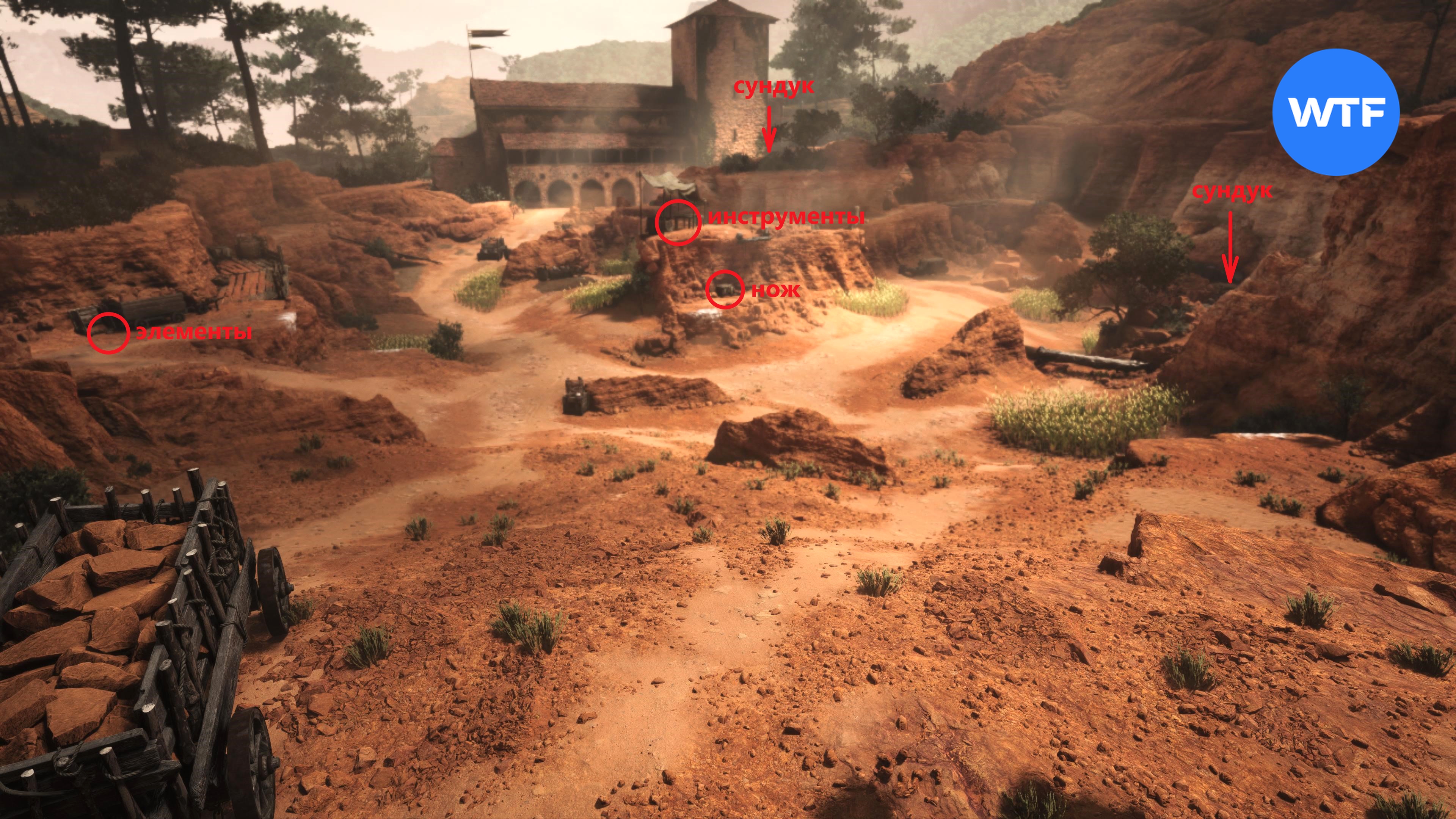 Перебравшись через первый огненный ров, вы найдете большой сундук на балконе слева от вас и сундук с инструментами внизу за зданием, слева от предыдущего сундука.