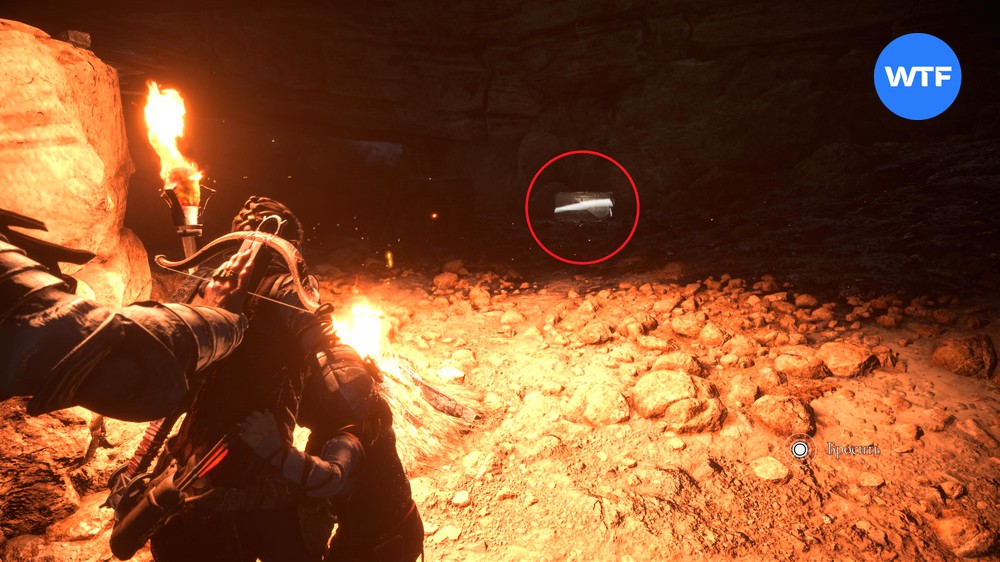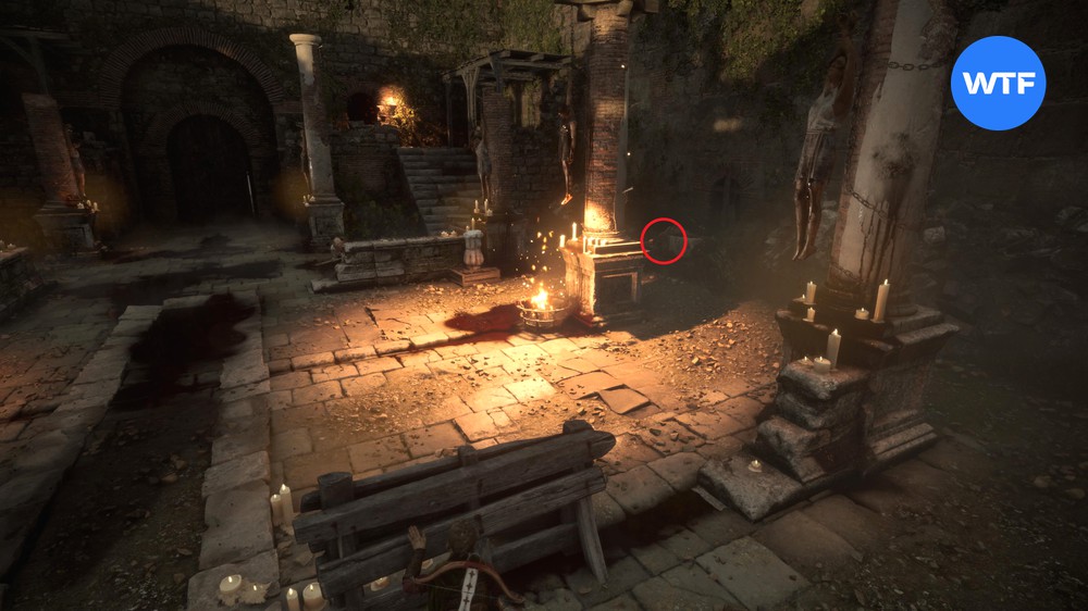В левой части этой локации есть спуск в катакомбы. Там вы найдете сундук и мешок с элементами.
