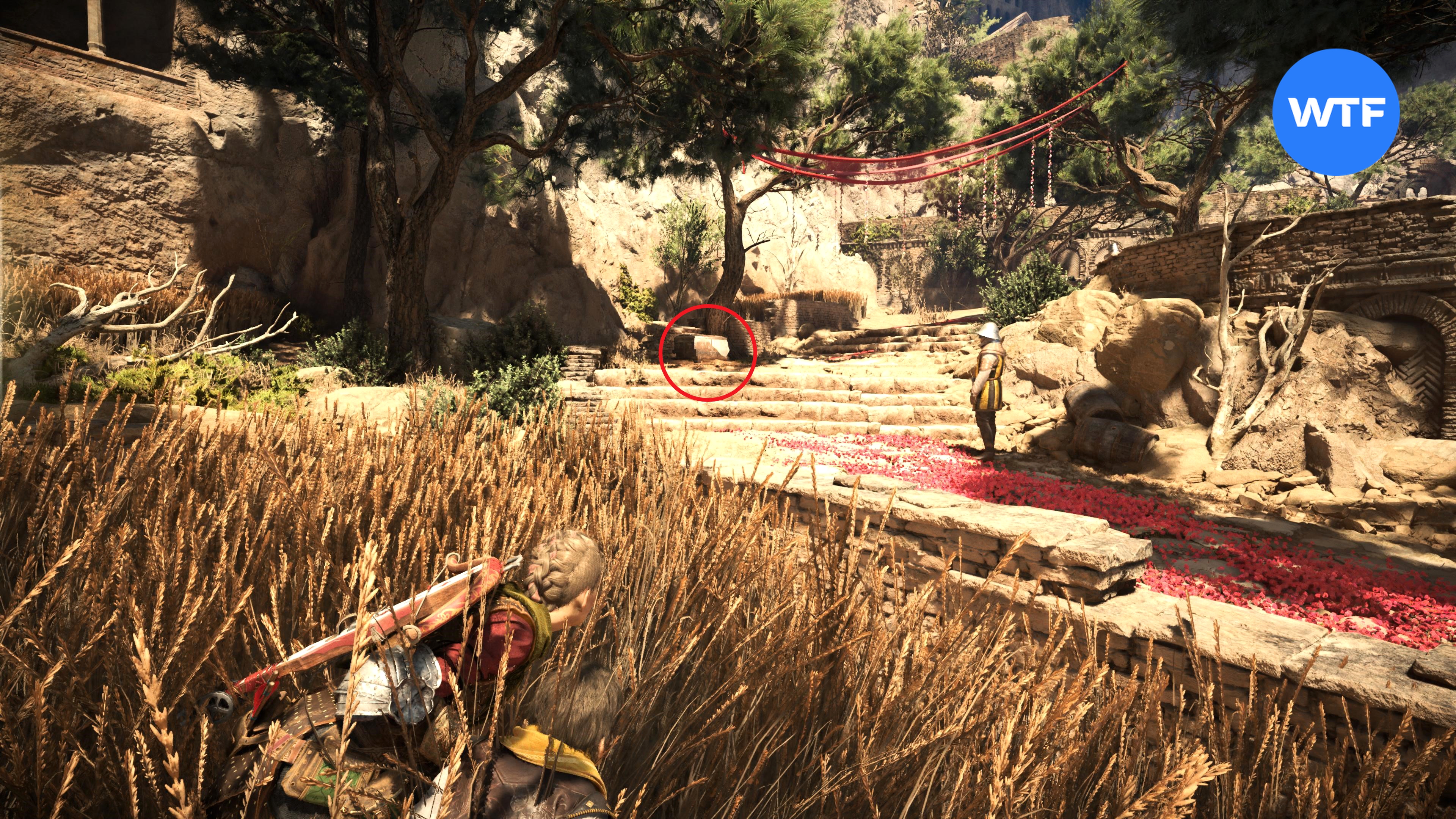 Продолжайте идти вперед пока не доберетесь до области с дорогой из красных лепестков. Её тоже нужно проходить скрытно, поэтому собирать сундуки может быть не очень удобно. Воспользуйтесь фоторежимом, чтобы осмотреться.