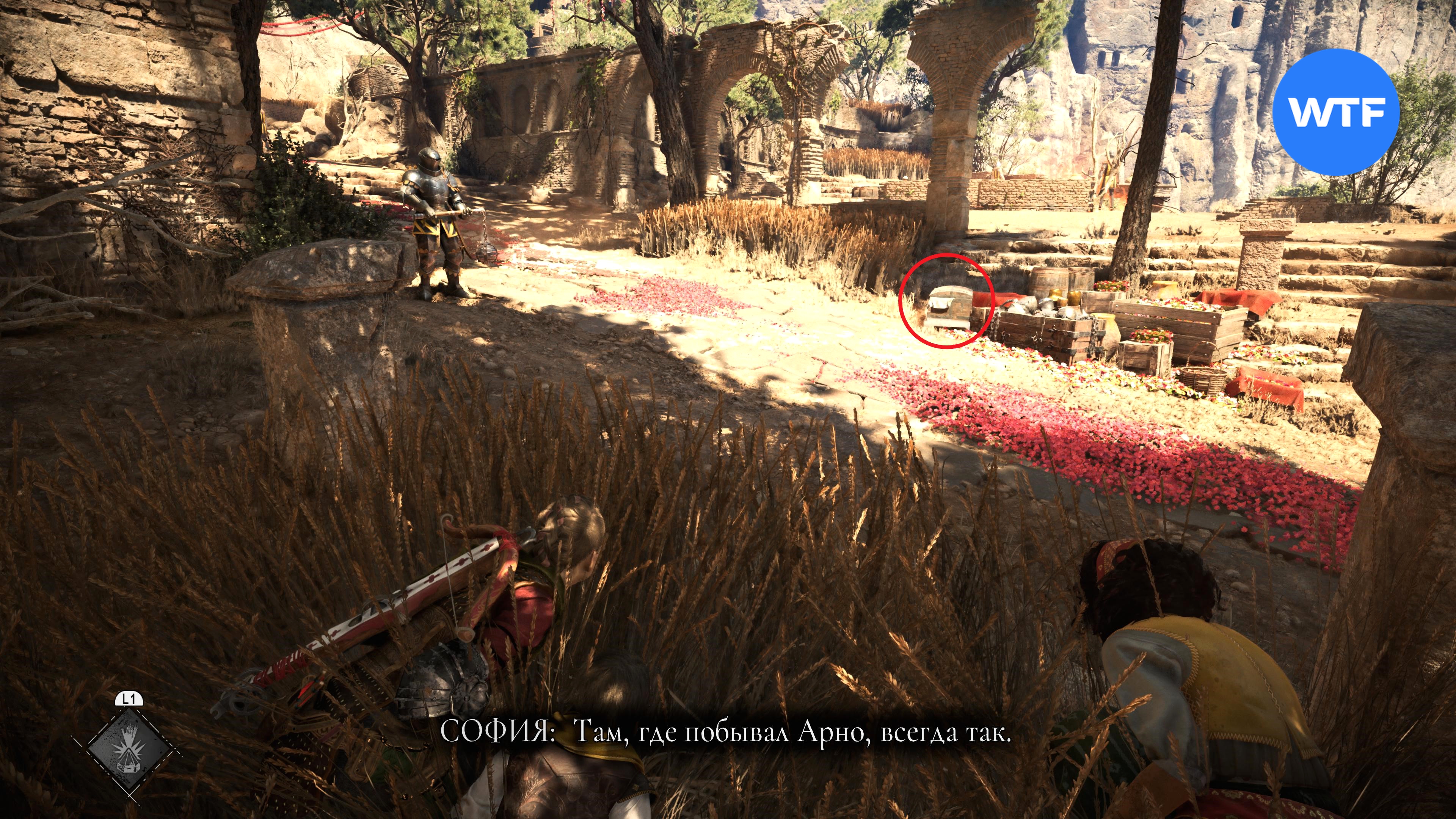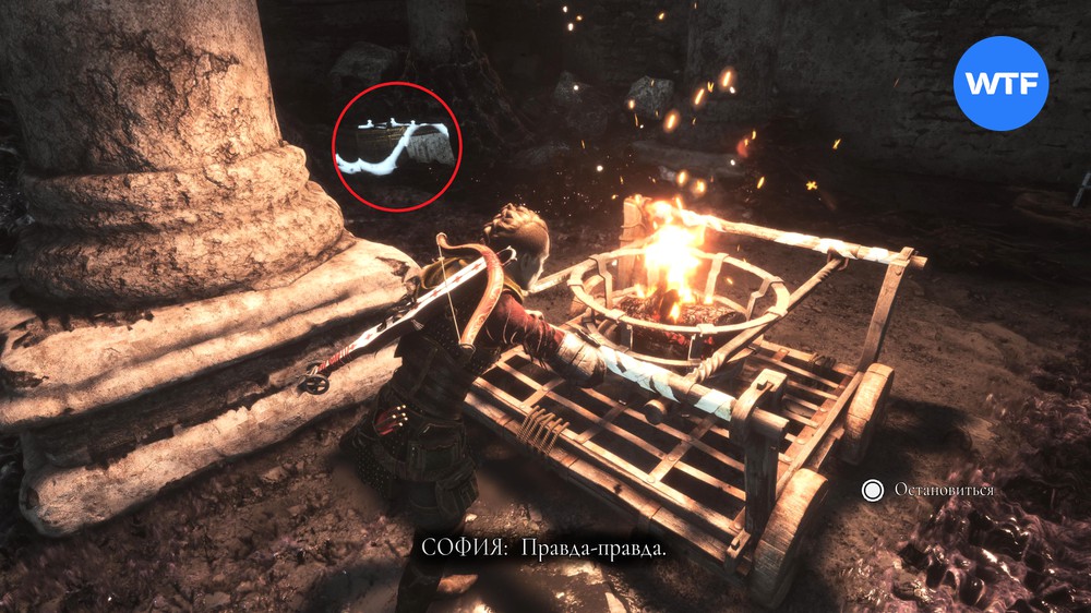 Теперь сверните налево у поваленной колонны и бегите вперед. Там вы найдете большой сундук и торчащий из деревяшки возле него нож.