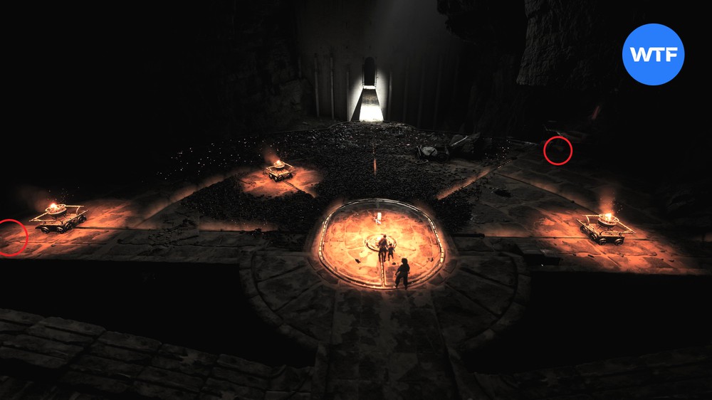 Идите по сюжету, пока не доберетесь до большого зала с тремя тележками на жаровнях со скриншота ниже. Здесь есть два больших сундука, мы отметили их на скриншоте ниже. Толкайте тележки по желобам и используйте призму Софии, чтобы до них добраться.