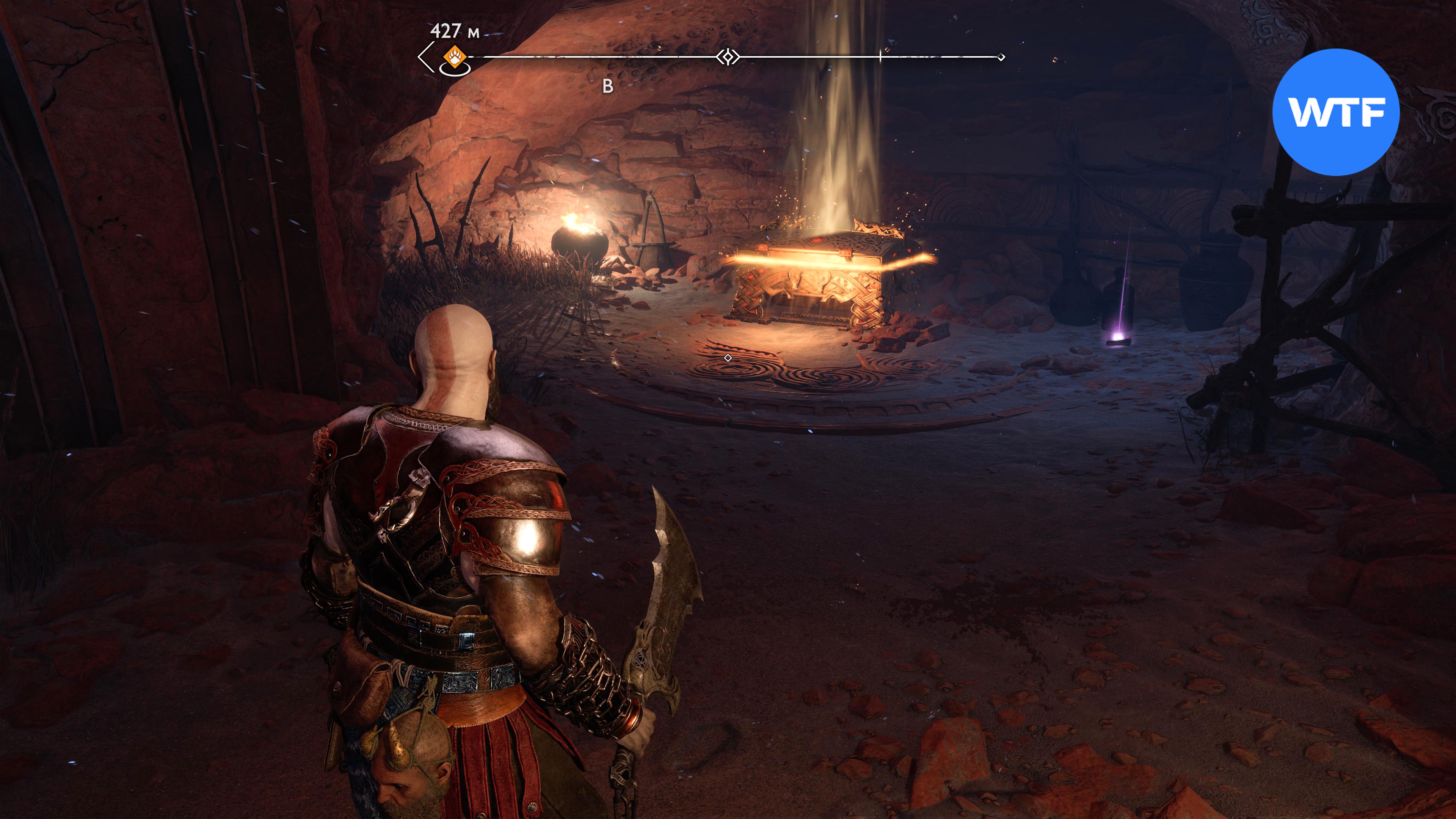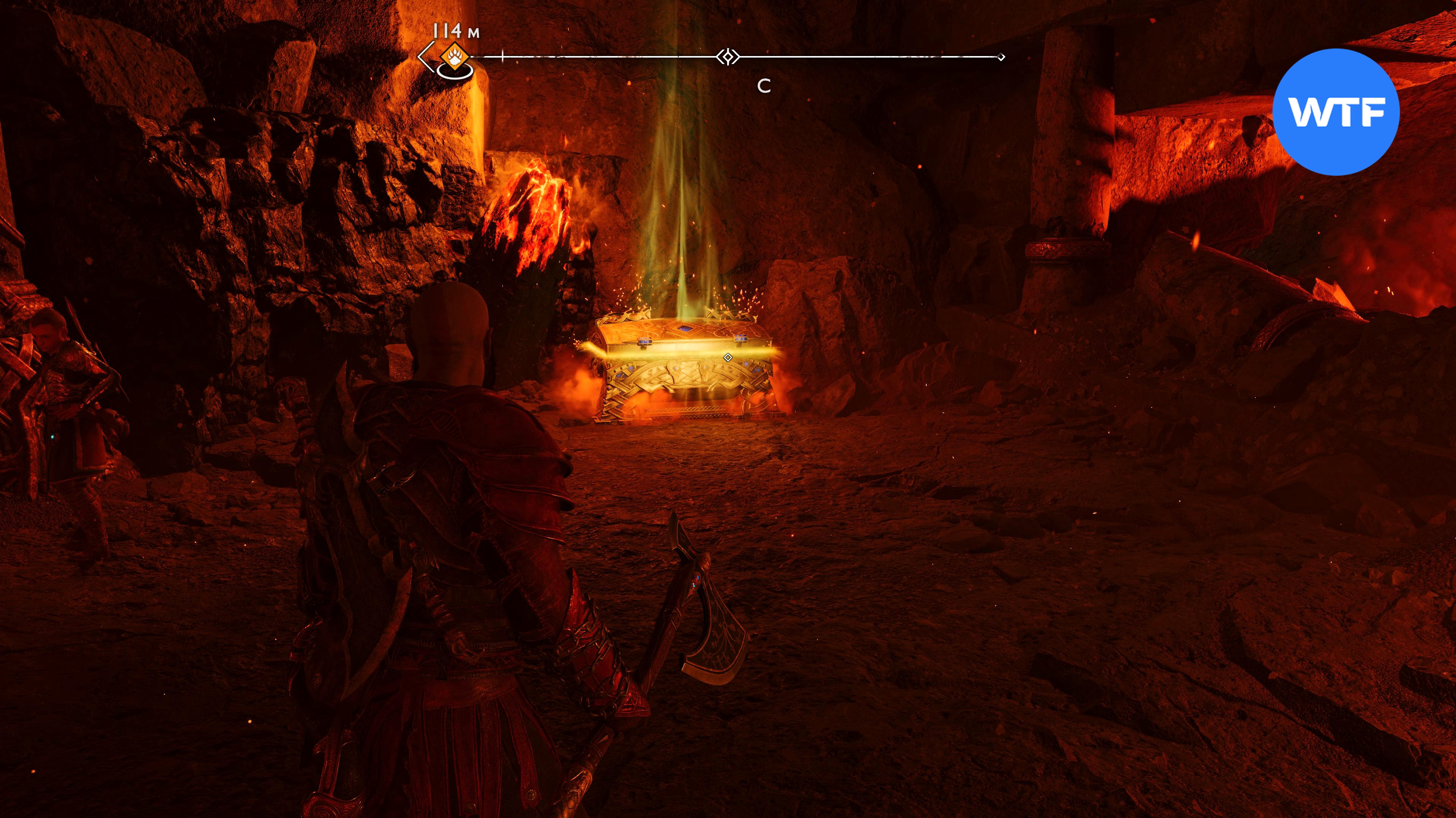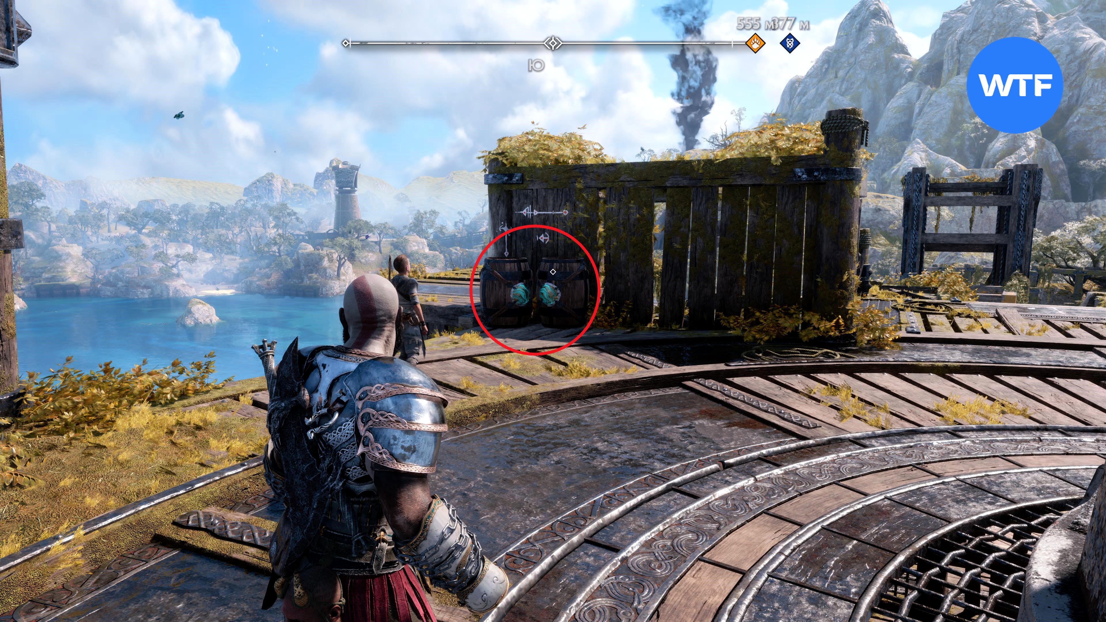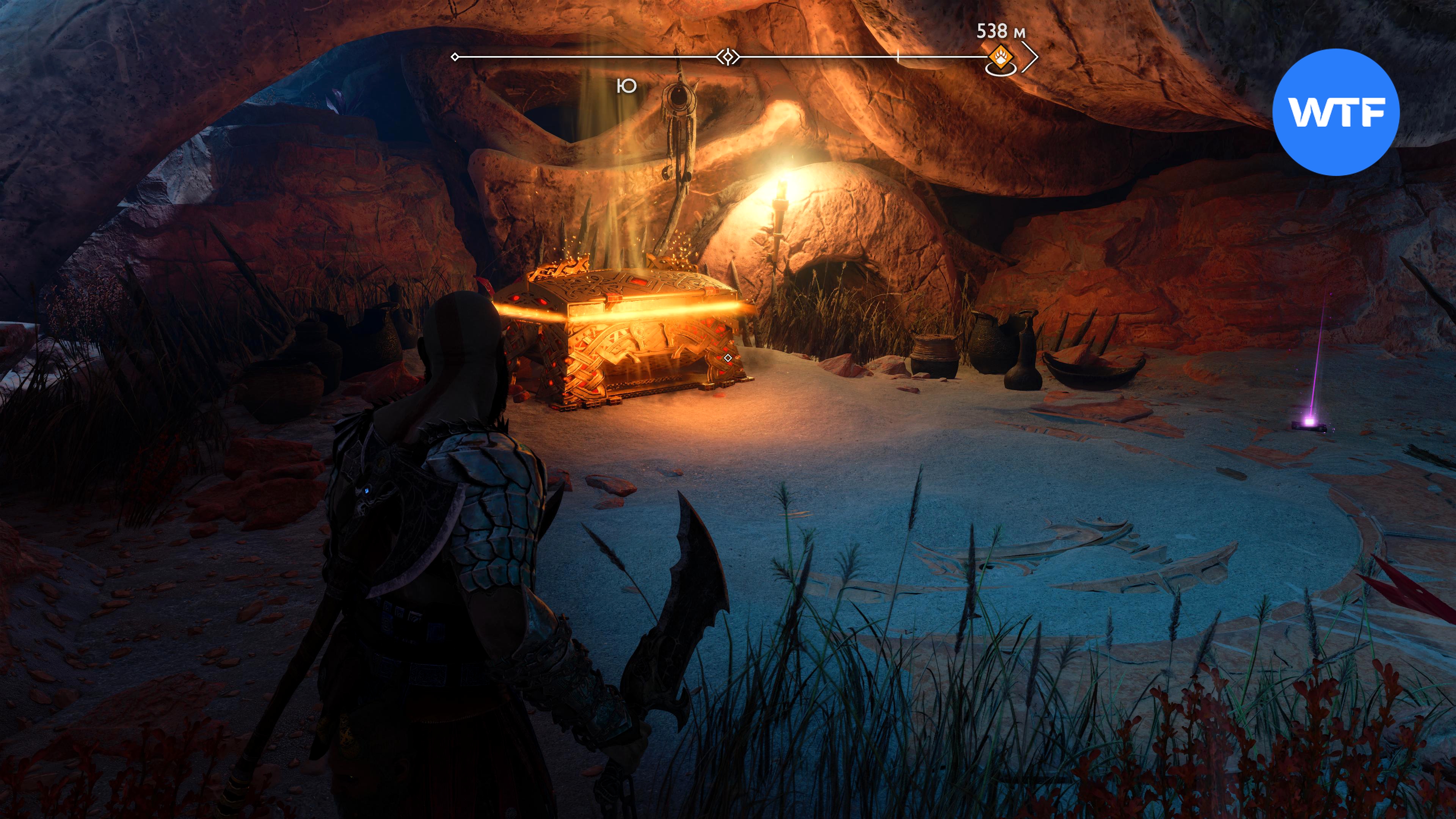 Вскоре после вторых ворот, в которые нужно кидать топор, Кратос снова должен будет метнуть копье в стену. После этого вы будете проходить мимо этого сундука.