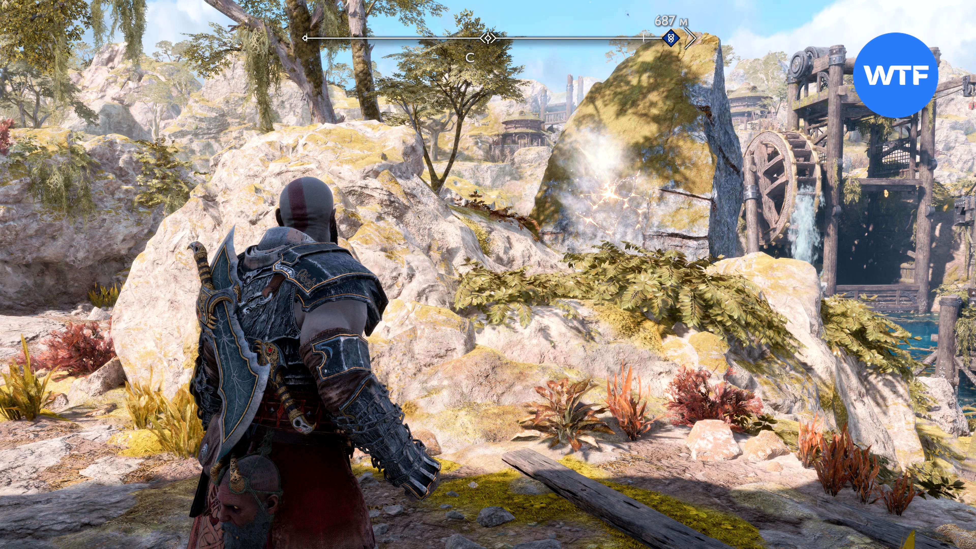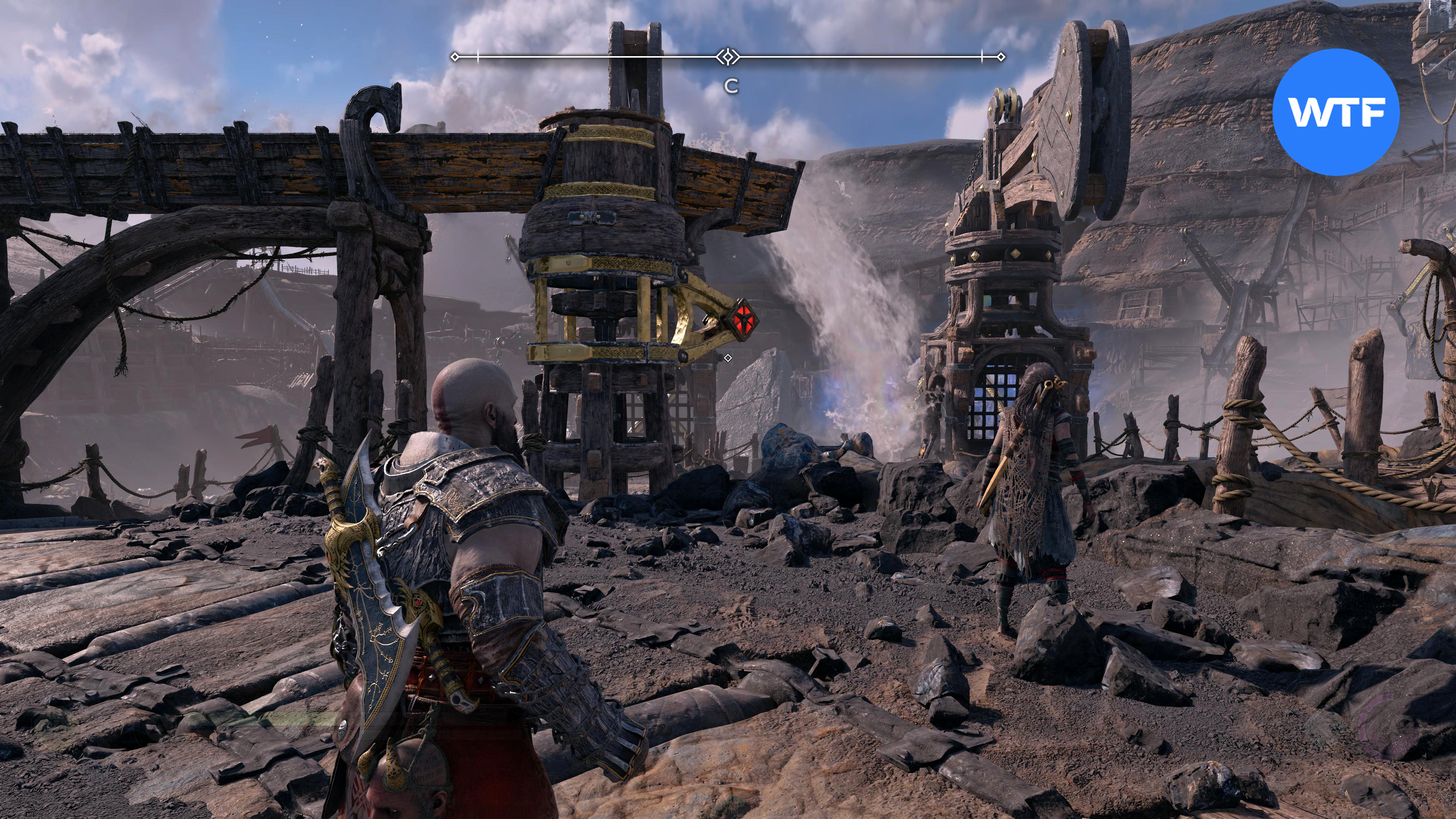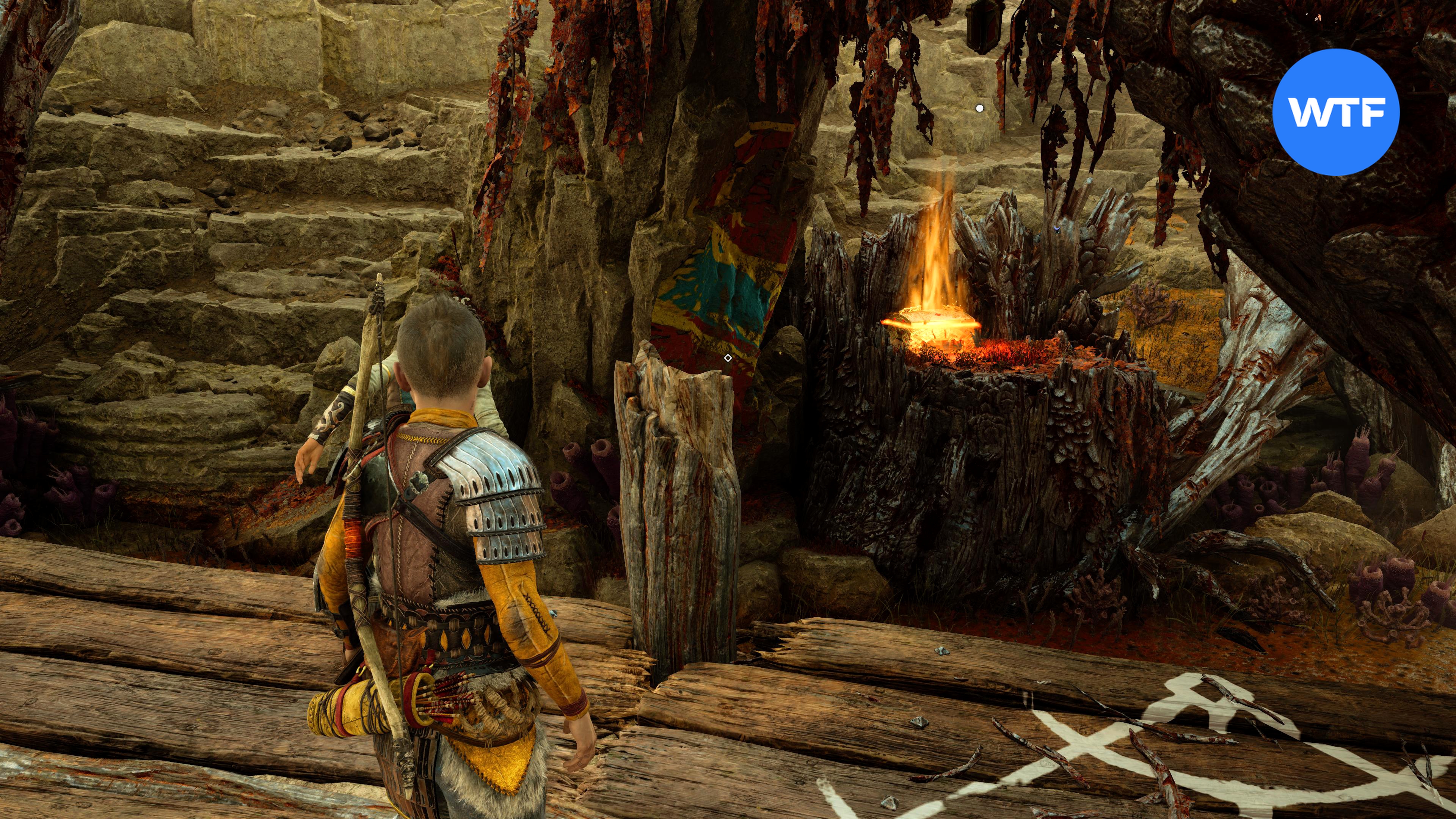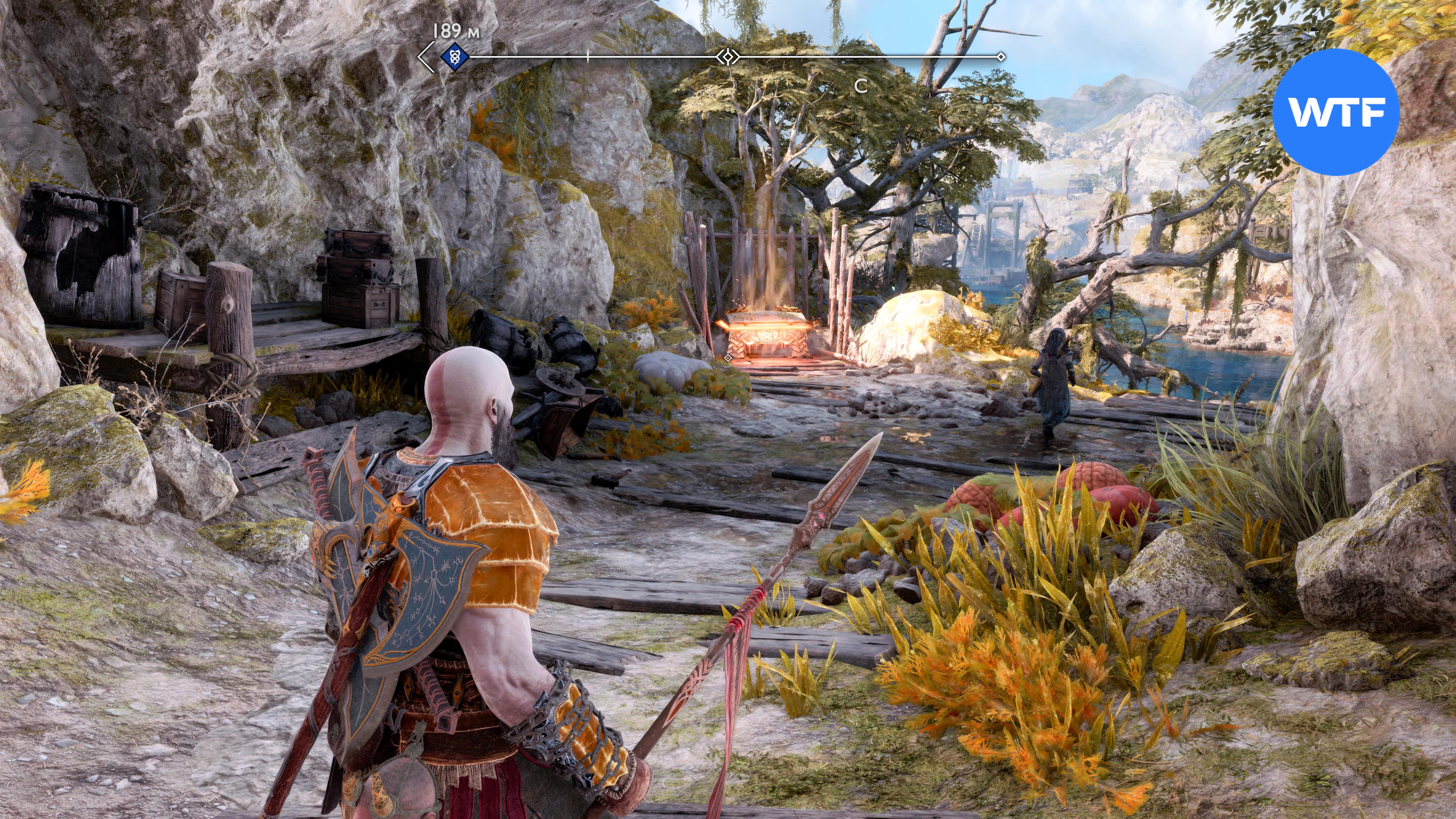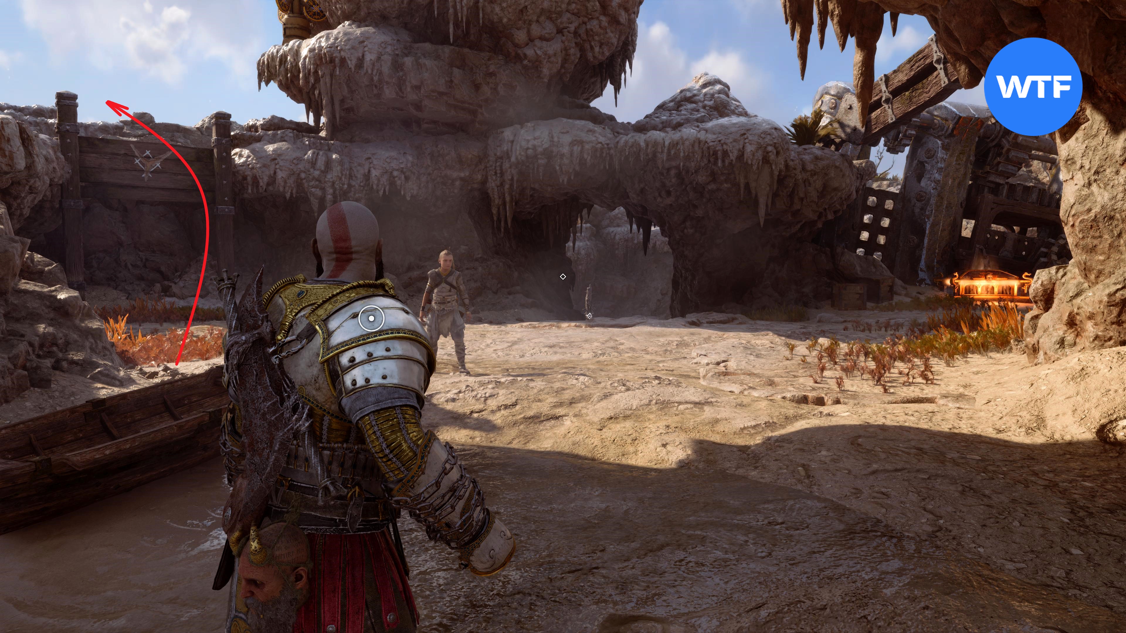 К северо-востоку от храма Тюра есть деревянные обломки, через которые вы можете перелезть для доступа к локации Берега Девяти. После этого пролезьте под большим камнем и идите к обломкам статуи перед вами.