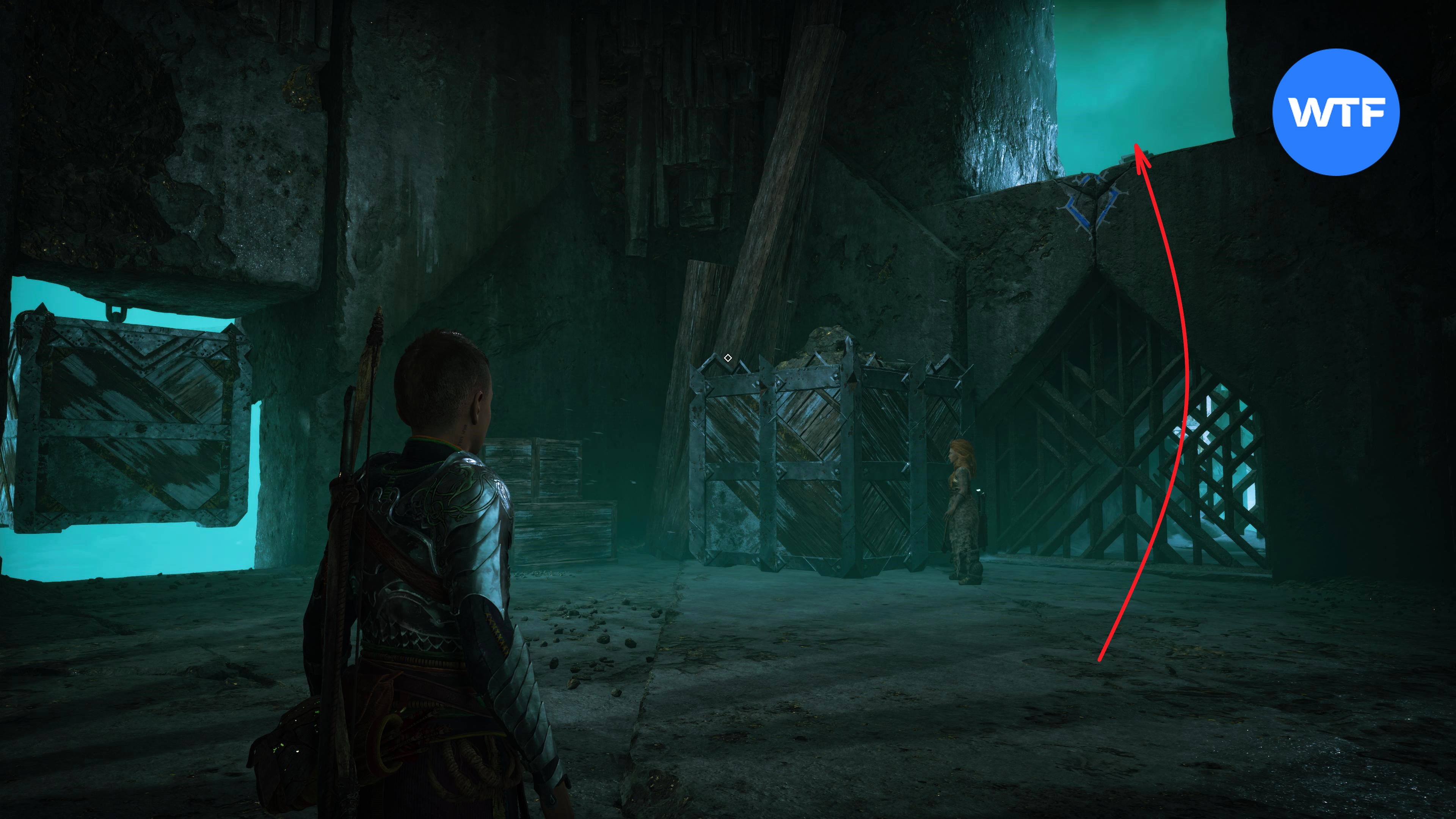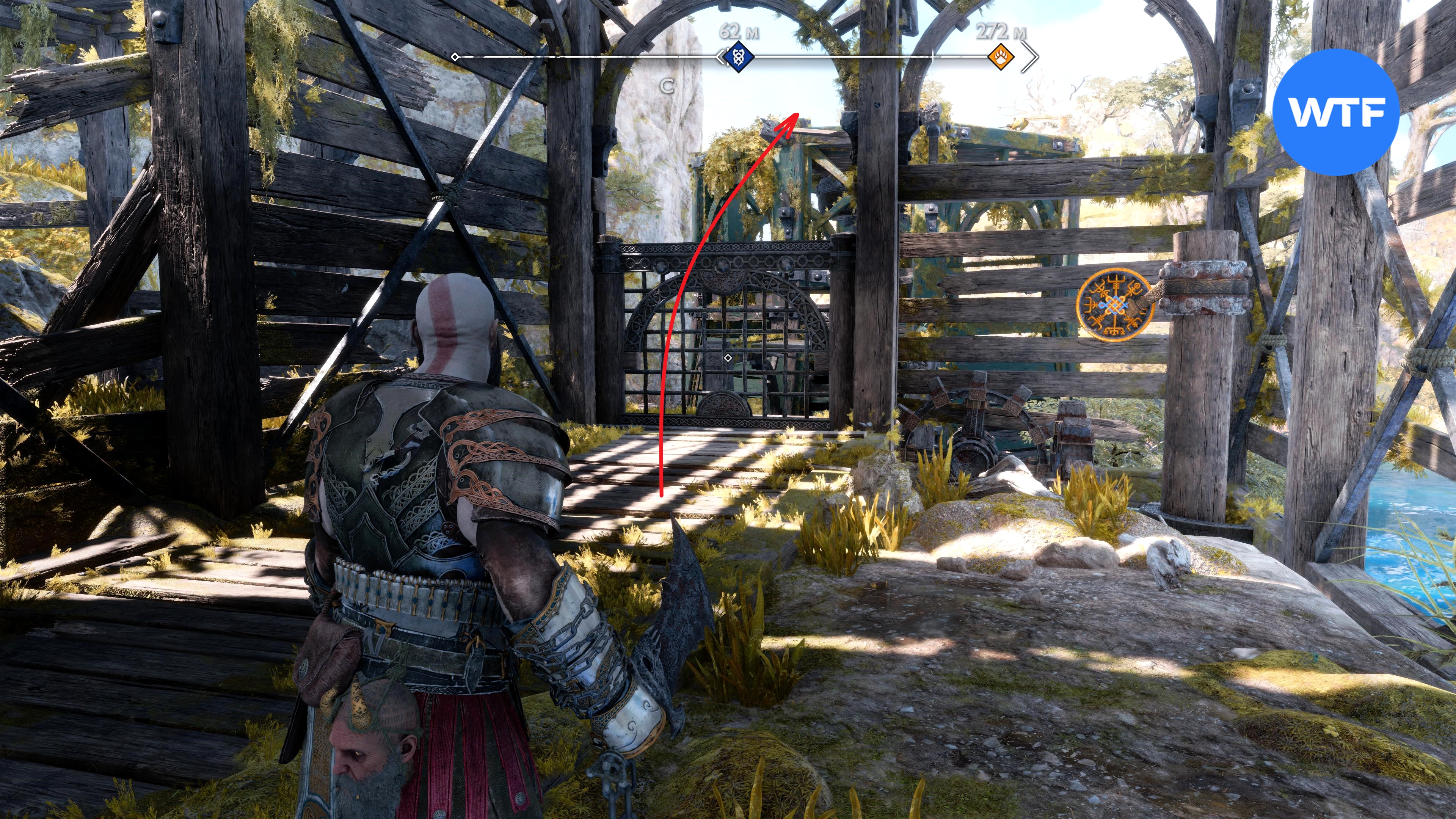 Поднимитесь наверх по стене за сундуком норн, затем еще раз поднимитесь наверх по цепи. Вы увидите огромную цепь, с которой вам нужно взаимодействовать в рамках дополнительного квеста «Проклятие Сигрун». После этого справа откроется лестница, ведущая к этому сундуку.