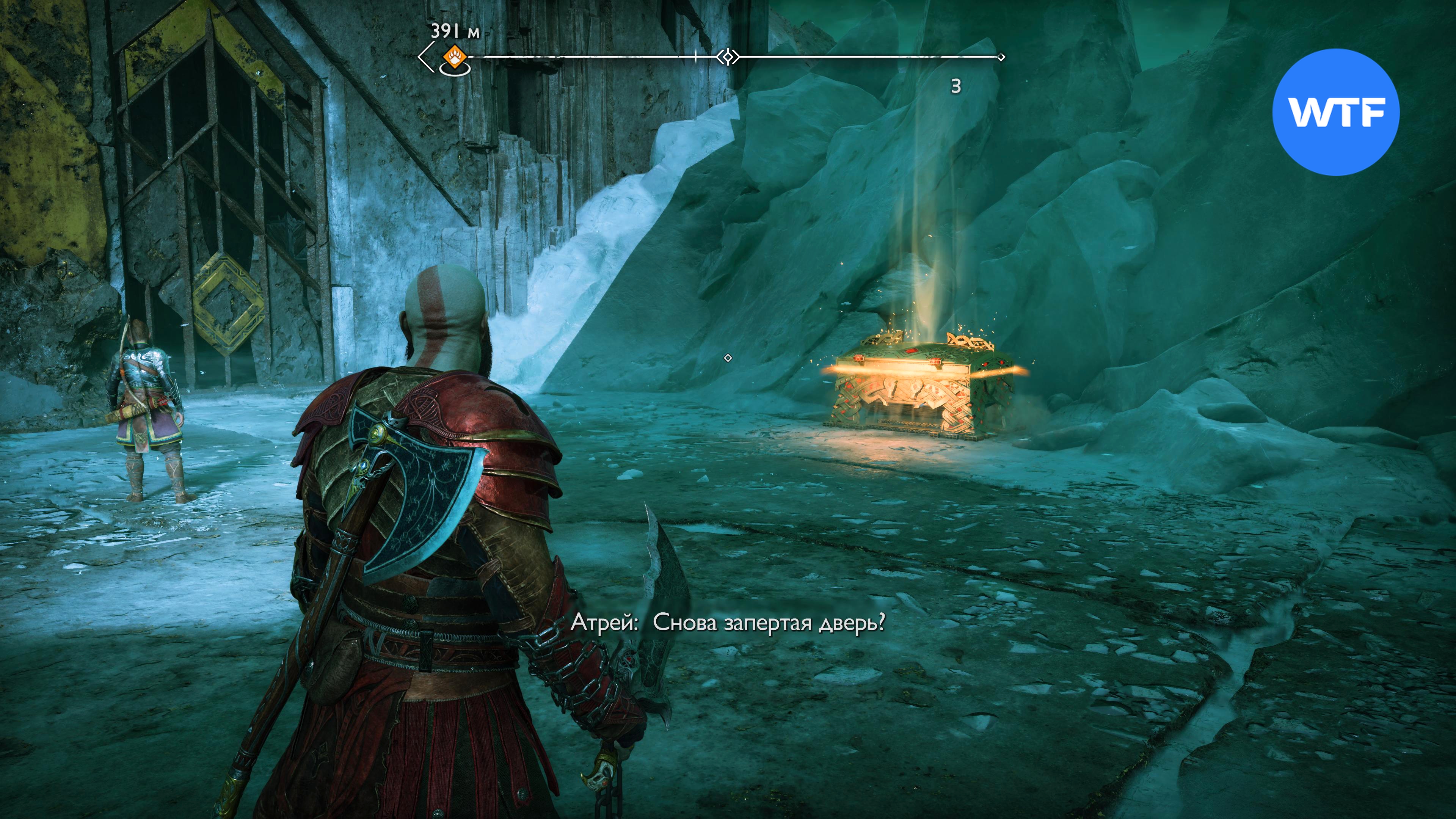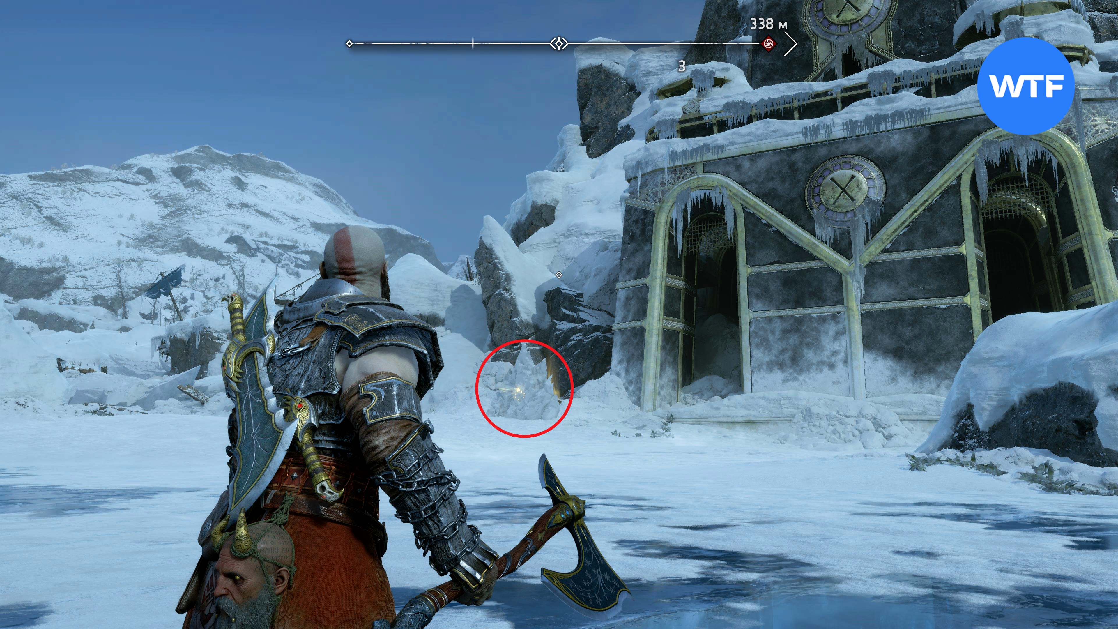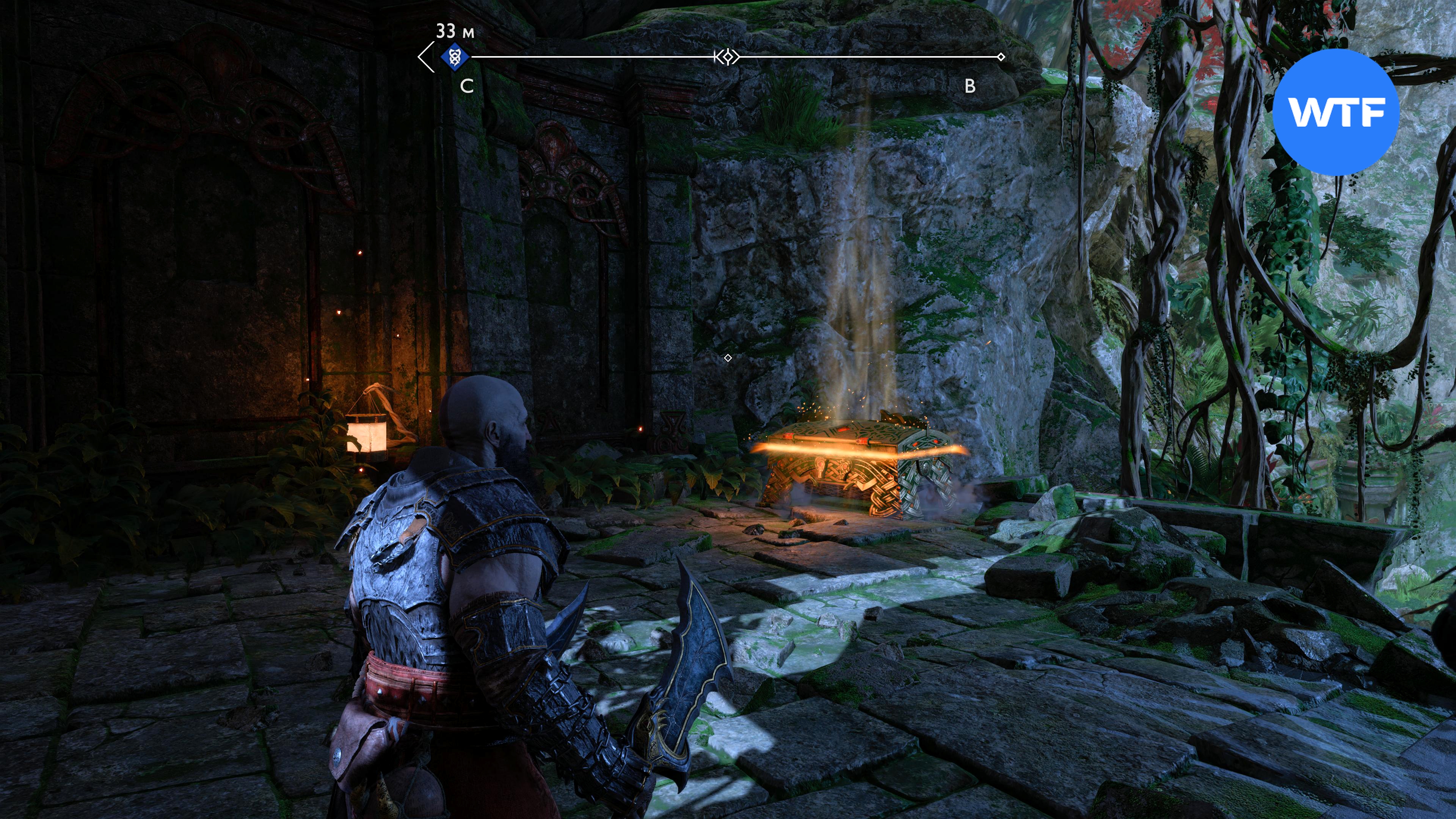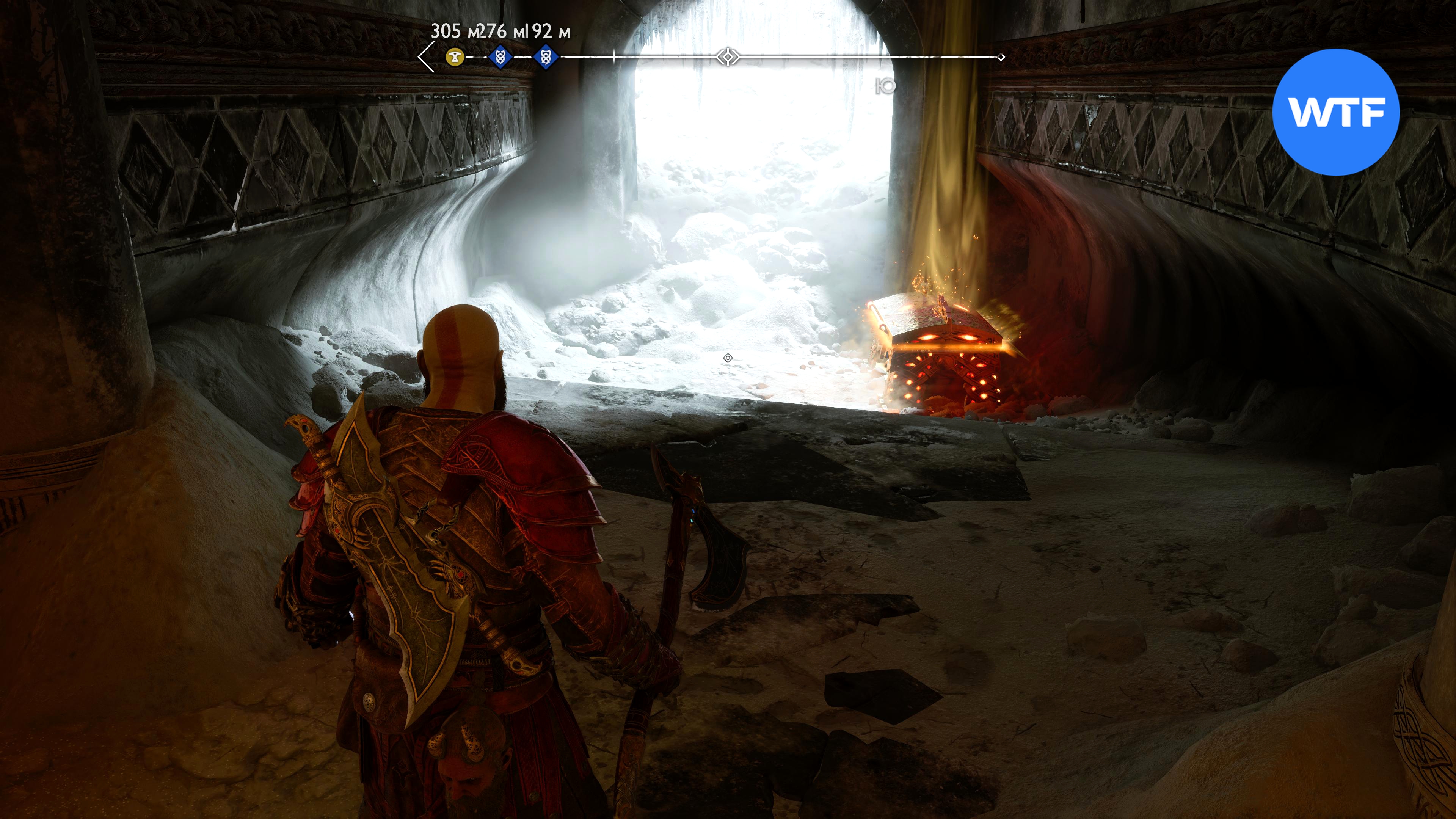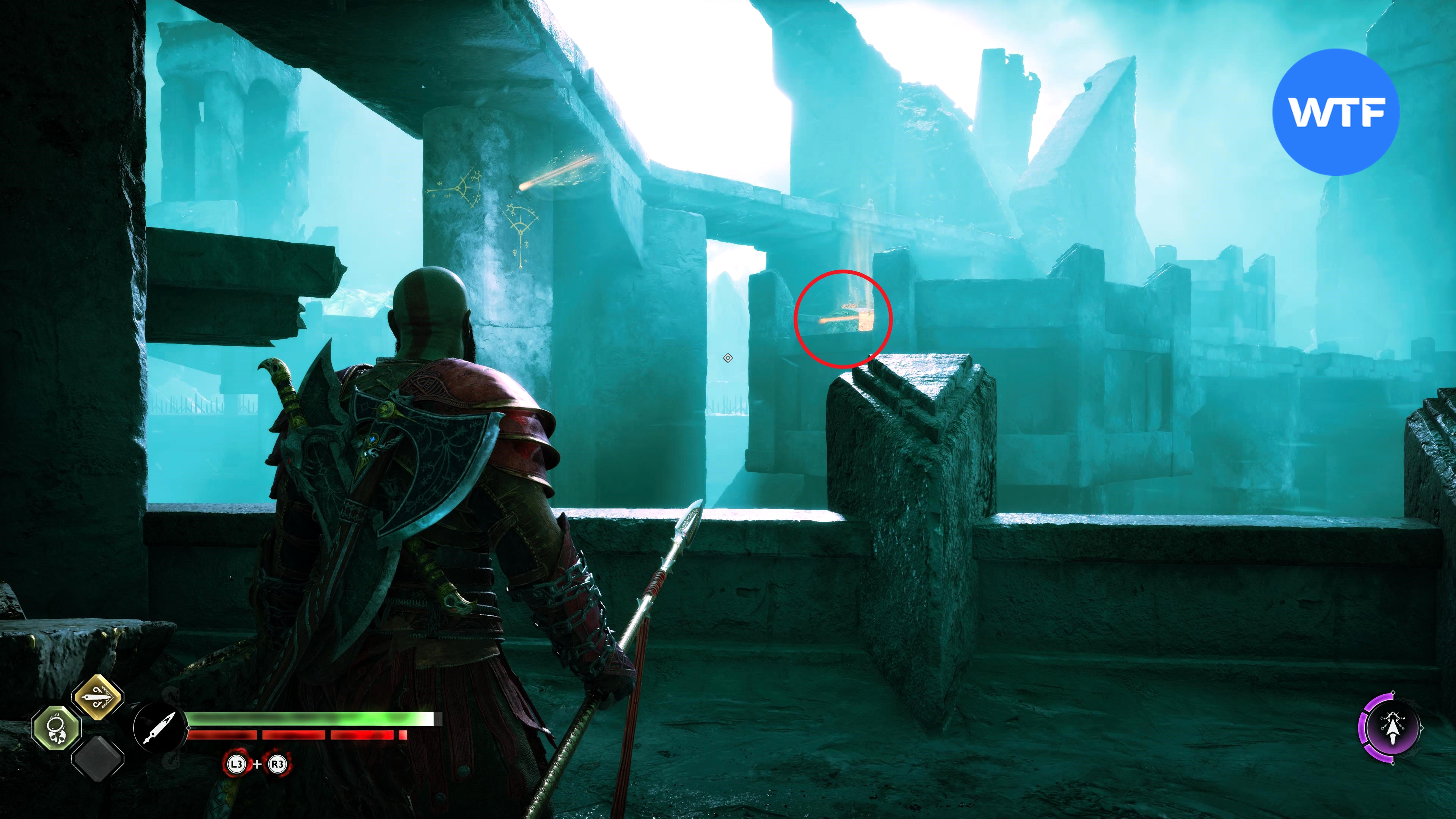 Вскоре после первых ворот, которые вам нужно открыть, замораживая замок, Кратос должен будет метнуть копье в колонну, чтобы продвинуться дальше. Сундук будет стоять у вас на пути.