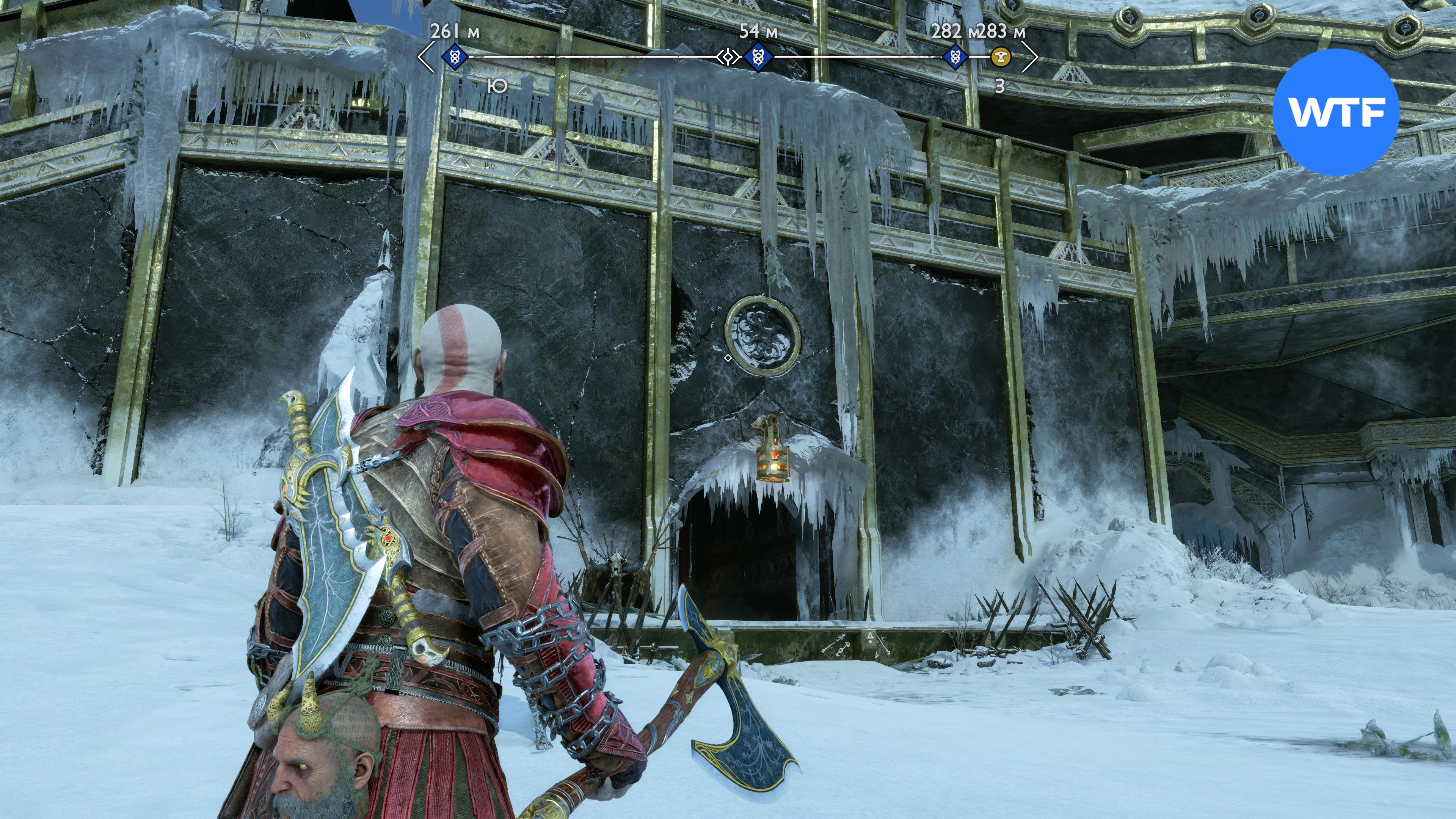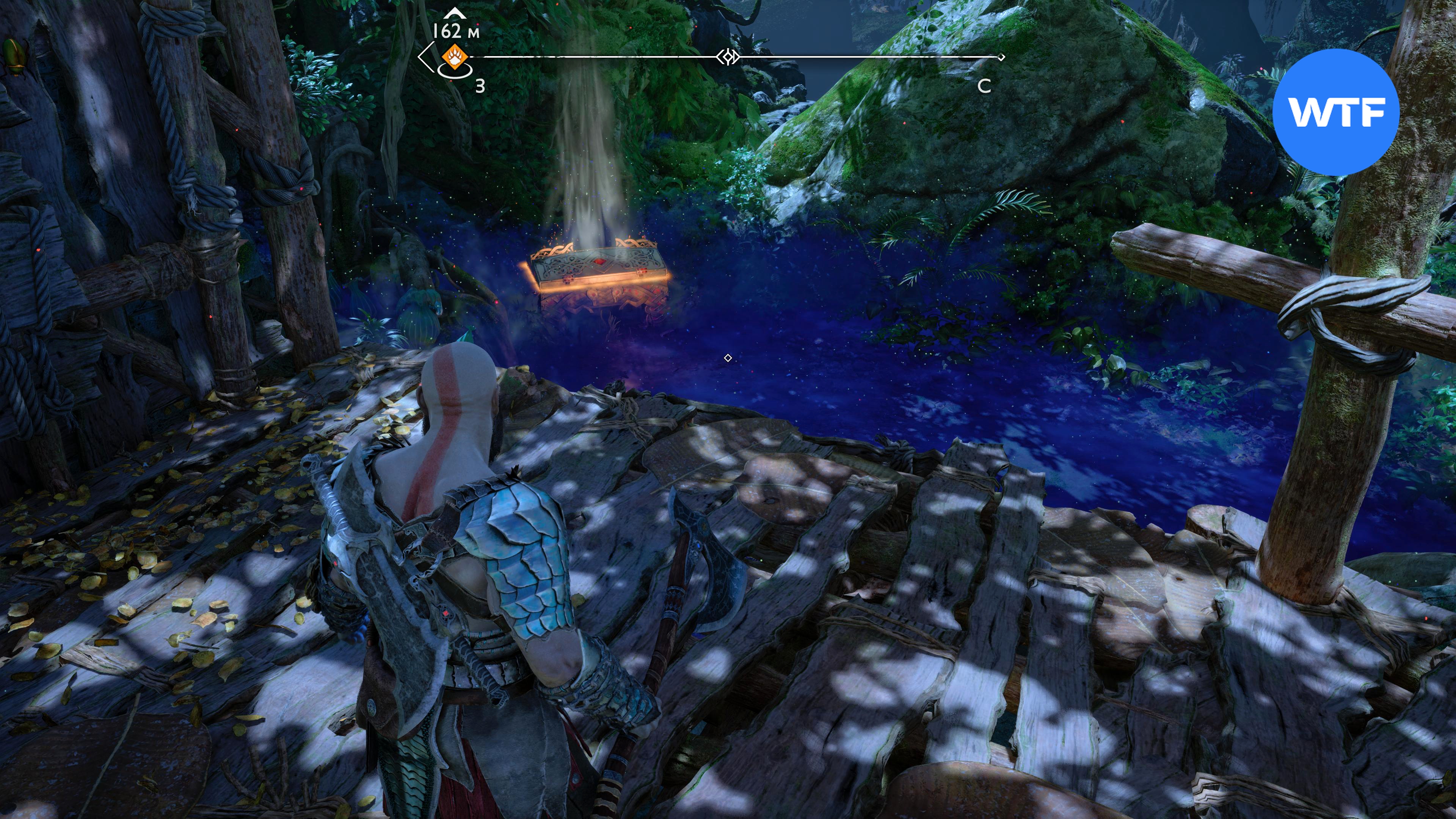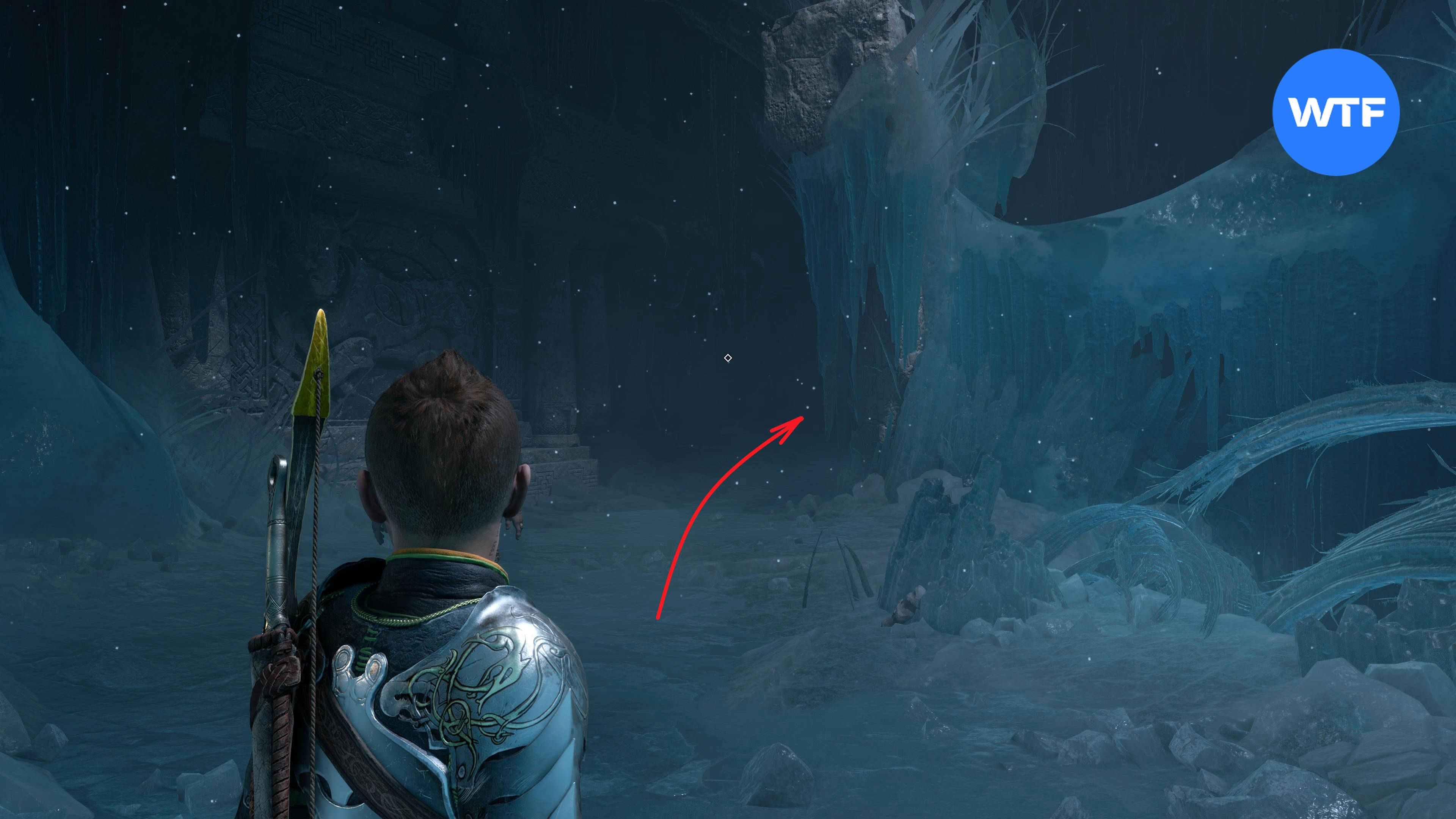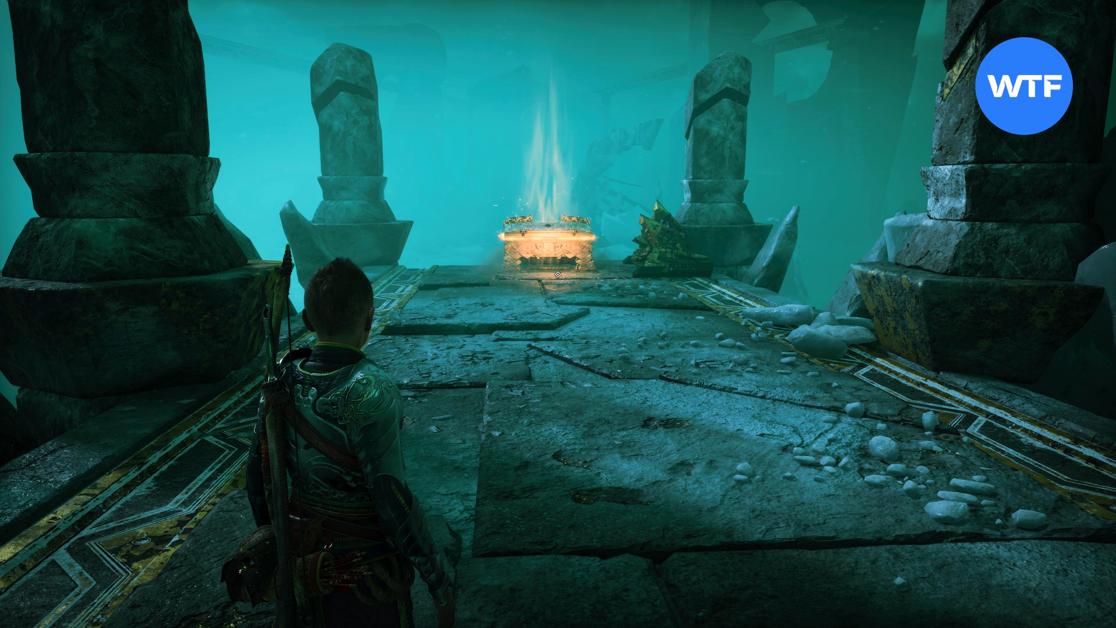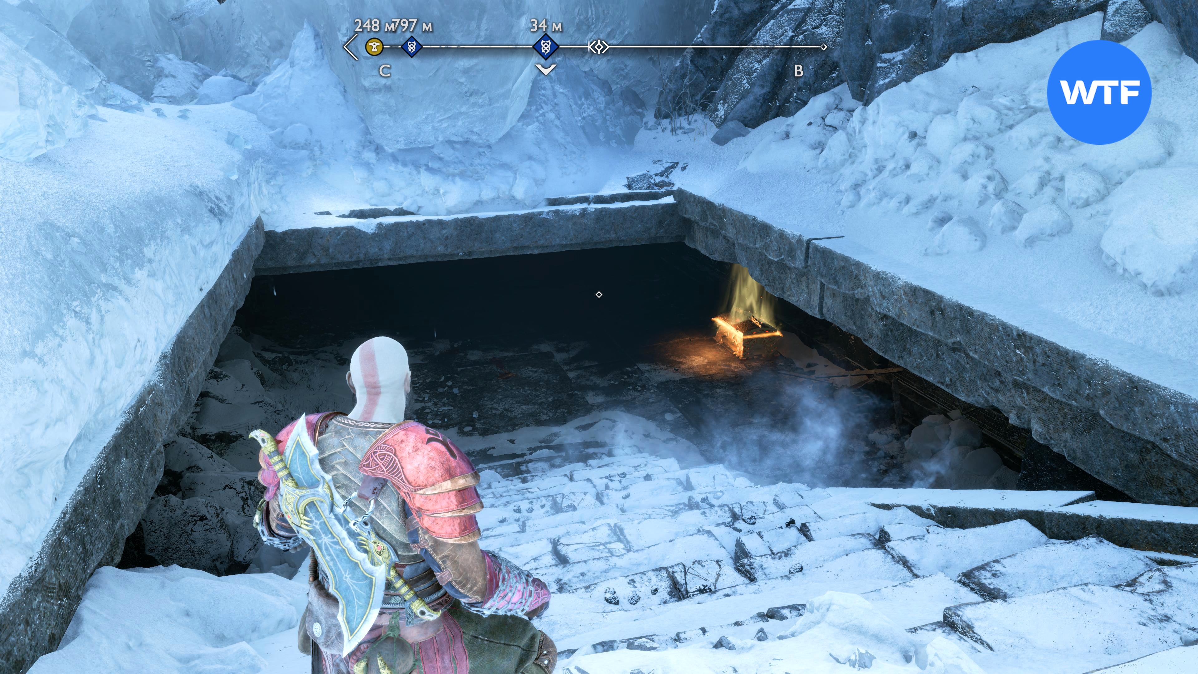 Вскоре после первых ворот, которые вам нужно открыть, замораживая замок, Кратос должен будет метнуть копье в колонну, чтобы продвинуться дальше. Сундук будет стоять у вас на пути.