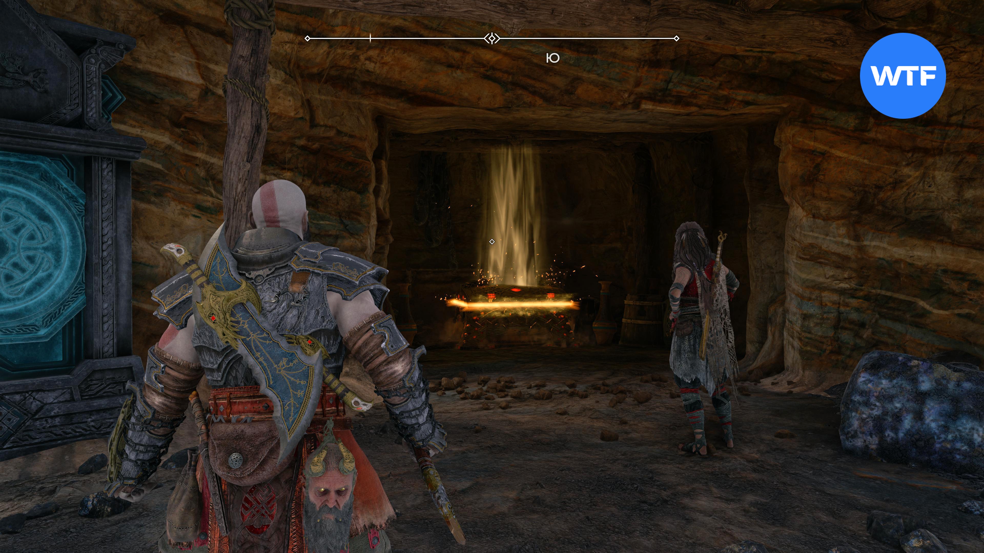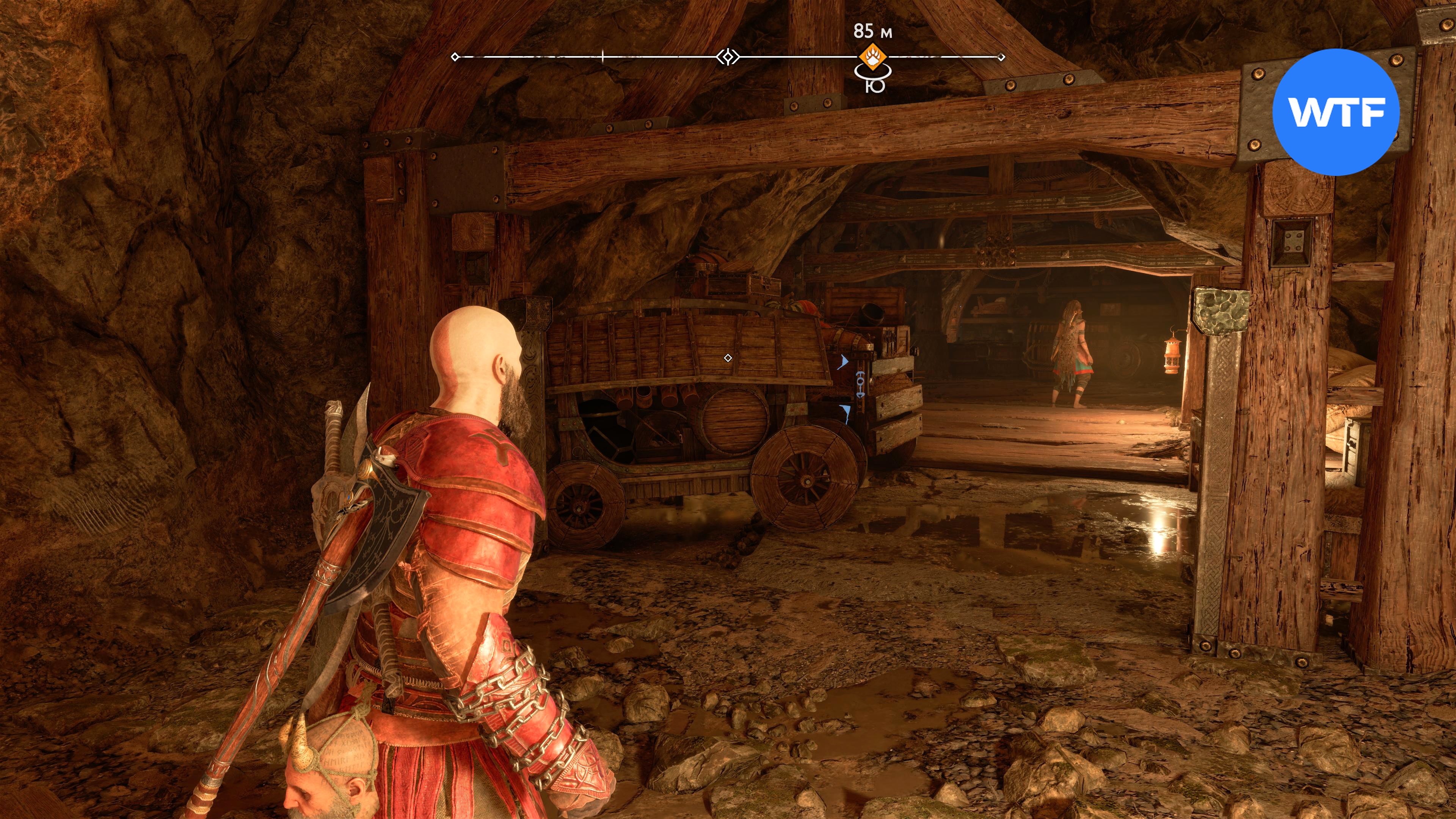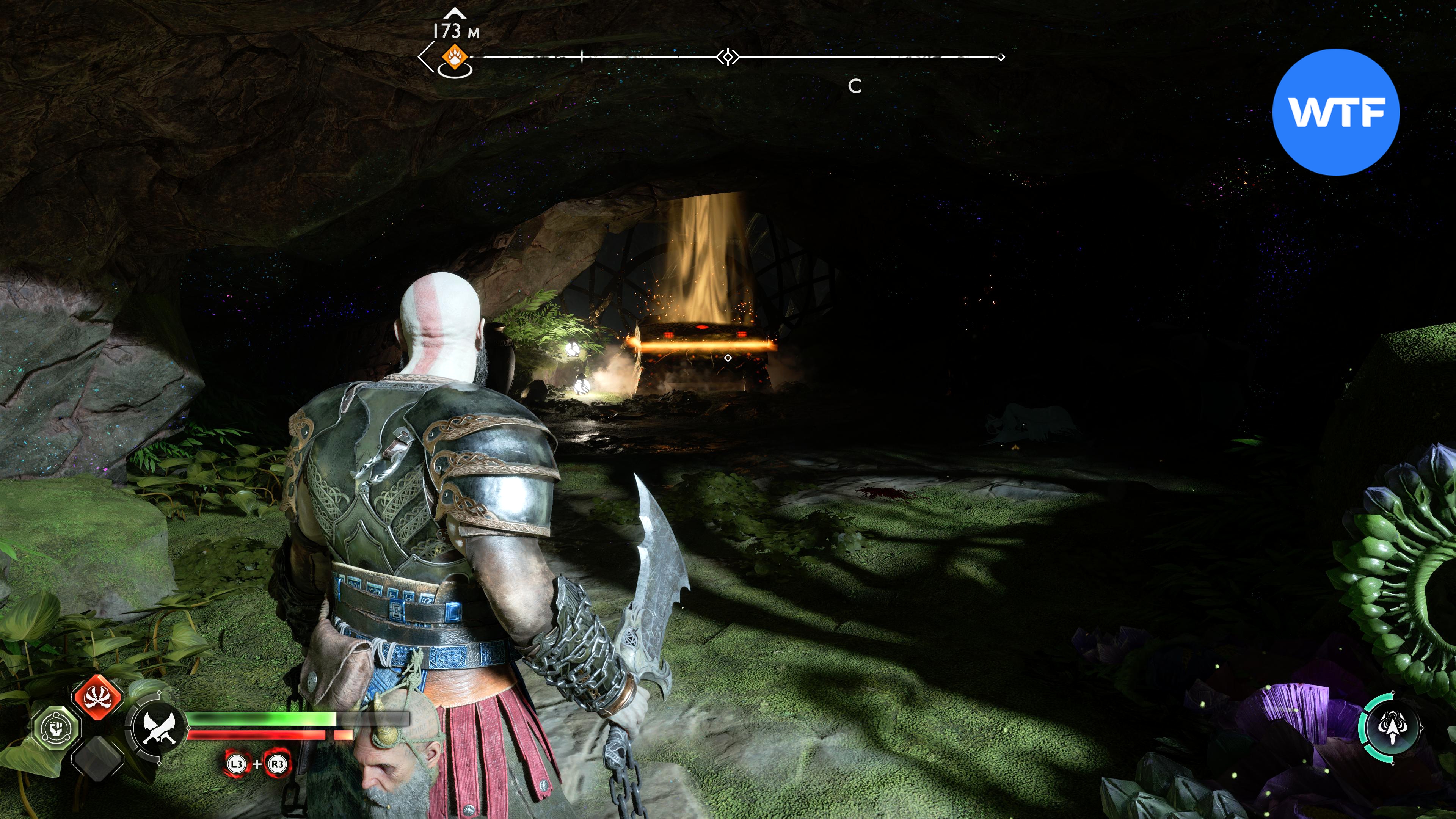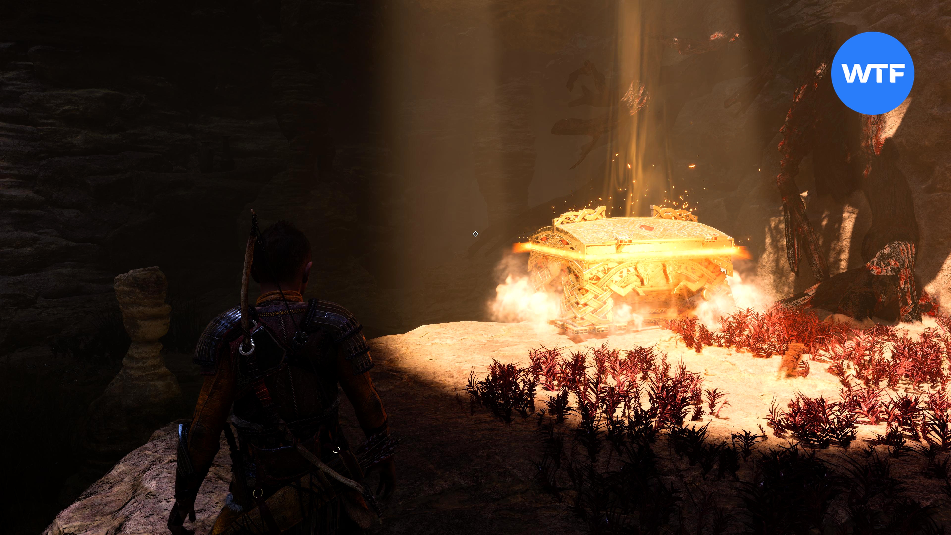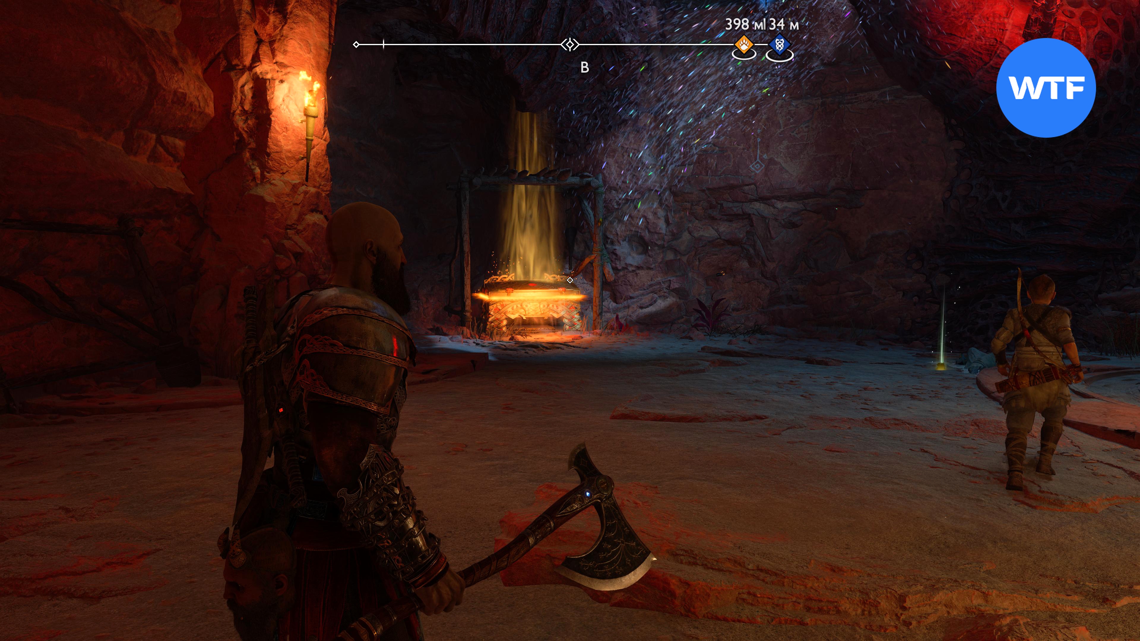 Вскоре после того, как ваш спутник разломает вторую стену, вы спрыгнете в большую пещеру. Сюжетный путь уходит направо, а к сундуку нужно идти налево.