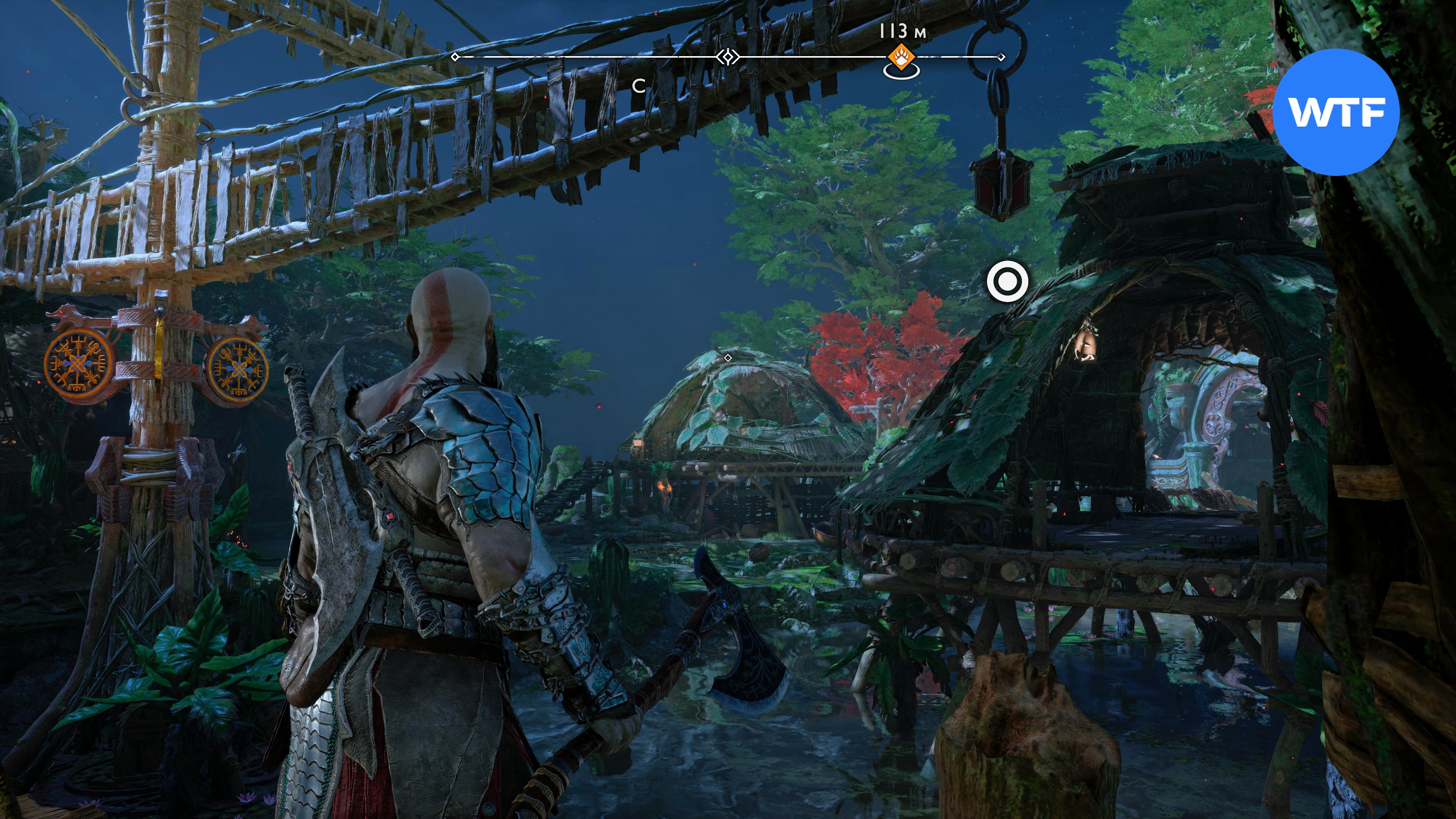 После того как разберетесь с плотиной, садитесь в лодку и плывите к ближайшему причалу с мистическими вратами. Заберитесь на стену справа от Небесного алтаря и идите вперед по единственно возможному пути. В конце вам нужно сжечь красные лозы при помощи клинков и фиолетовых меток, чтобы получить доступ к этому сундуку.